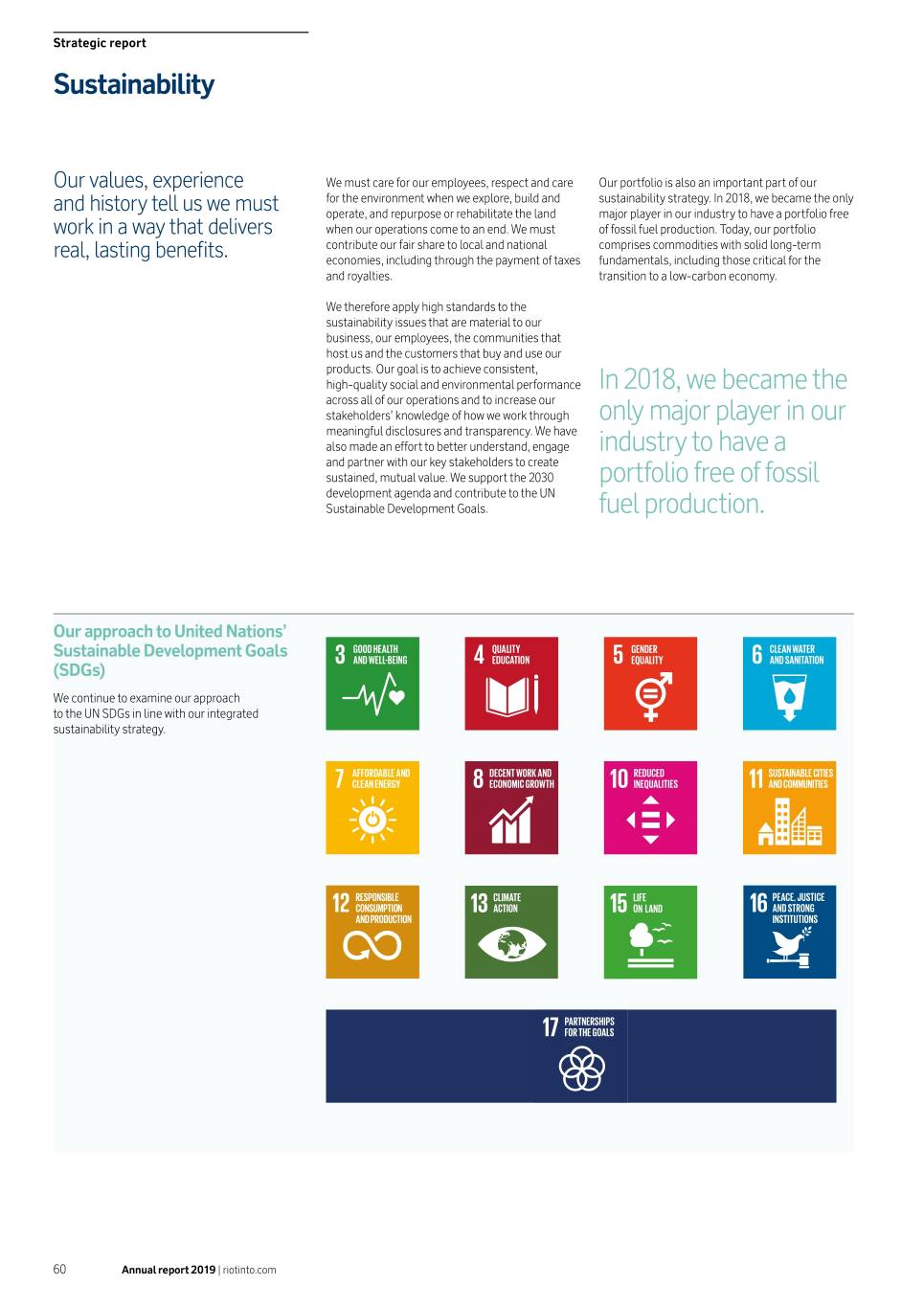 Strategic report Sustainability Our values, experience We must care for our employees, respect and care Our portfolio is also an important part of our for the environment when we explore, build and sustainability strategy. In 2018, we became the only and history tell us we must operate, and repurpose or rehabilitate the land major player in our industry to have a portfolio free work in a way that delivers when our operations come to an end. We must of fossil fuel production. Today, our portfolio contribute our fair share to local and national comprises commodities with solid long-term real, lasting benefits. economies, including through the payment of taxes fundamentals, including those critical for the and royalties. transition to a low-carbon economy. We therefore apply high standards to the sustainability issues that are material to our business, our employees, the communities that host us and the customers that buy and use our products. Our goal is to achieve consistent, high-quality social and environmental performance In 2018, we became the across all of our operations and to increase our stakeholders’ knowledge of how we work through only major player in our meaningful disclosures and transparency. We have also made an effort to better understand, engage industry to have a and partner with our key stakeholders to create sustained, mutual value. We support the 2030 portfolio free of fossil development agenda and contribute to the UN Sustainable Development Goals. fuel production. Our approach to United Nations’ Sustainable Development Goals (SDGs) We continue to examine our approach to the UN SDGs in line with our integrated sustainability strategy. 60 Annual report 2019 | riotinto.com
