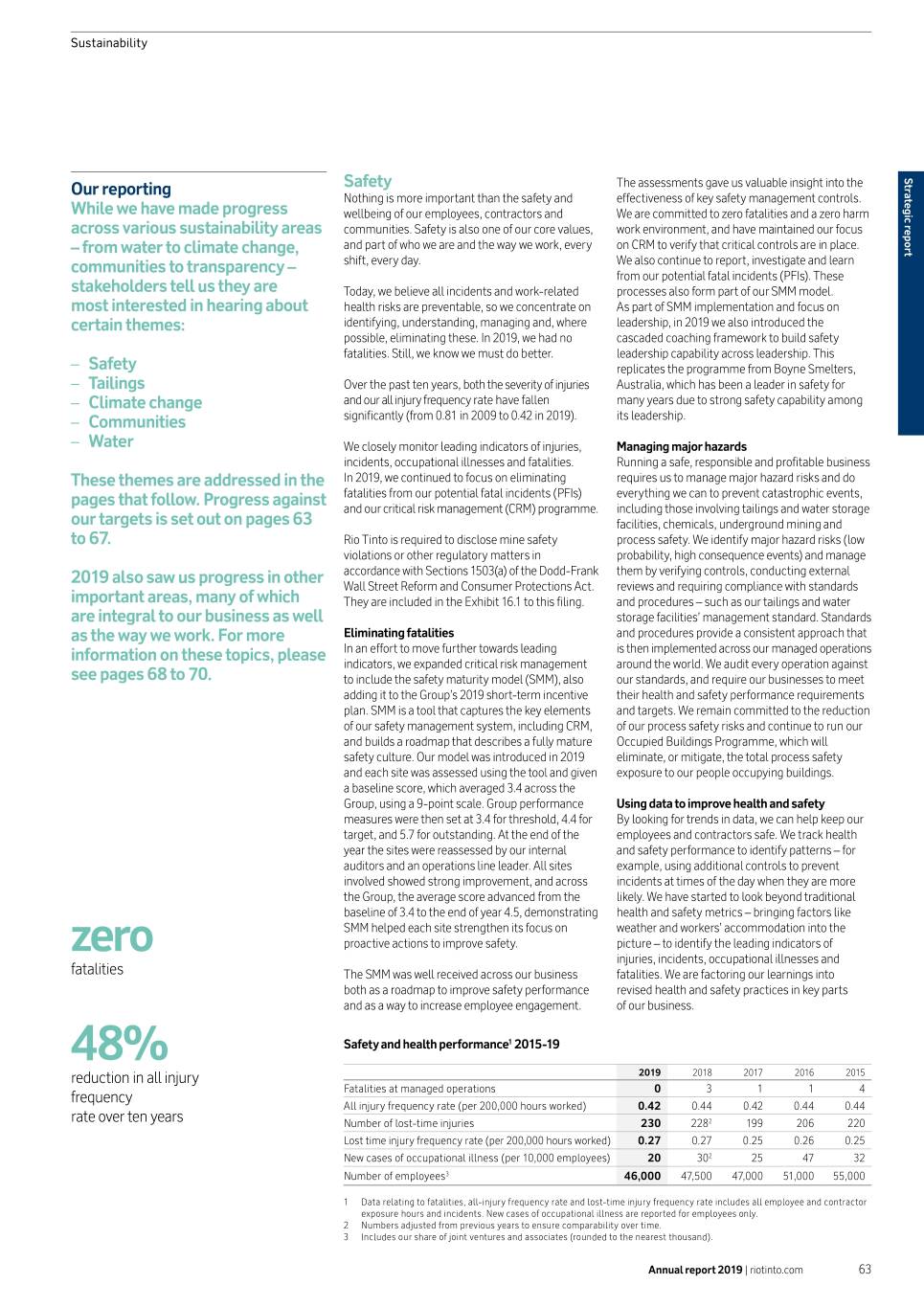 Sustainability Strategic report Strategic Our reporting Safety The assessments gave us valuable insight into the Nothing is more important than the safety and effectiveness of key safety management controls. While we have made progress wellbeing of our employees, contractors and We are committed to zero fatalities and a zero harm across various sustainability areas communities. Safety is also one of our core values, work environment, and have maintained our focus – from water to climate change, and part of who we are and the way we work, every on CRM to verify that critical controls are in place. communities to transparency – shift, every day. We also continue to report, investigate and learn from our potential fatal incidents (PFIs). These stakeholders tell us they are Today, we believe all incidents and work-related processes also form part of our SMM model. most interested in hearing about health risks are preventable, so we concentrate on As part of SMM implementation and focus on certain themes: identifying, understanding, managing and, where leadership, in 2019 we also introduced the possible, eliminating these. In 2019, we had no cascaded coaching framework to build safety fatalities. Still, we know we must do better. leadership capability across leadership. This –– Safety replicates the programme from Boyne Smelters, –– Tailings Over the past ten years, both the severity of injuries Australia, which has been a leader in safety for –– Climate change and our all injury frequency rate have fallen many years due to strong safety capability among –– Communities significantly (from 0.81 in 2009 to 0.42 in 2019). its leadership. –– Water We closely monitor leading indicators of injuries, Managing major hazards incidents, occupational illnesses and fatalities. Running a safe, responsible and profitable business These themes are addressed in the In 2019, we continued to focus on eliminating requires us to manage major hazard risks and do pages that follow. Progress against fatalities from our potential fatal incidents (PFIs) everything we can to prevent catastrophic events, and our critical risk management (CRM) programme. including those involving tailings and water storage our targets is set out on pages 63 facilities, chemicals, underground mining and to 67. Rio Tinto is required to disclose mine safety process safety. We identify major hazard risks (low violations or other regulatory matters in probability, high consequence events) and manage 2019 also saw us progress in other accordance with Sections 1503(a) of the Dodd-Frank them by verifying controls, conducting external Wall Street Reform and Consumer Protections Act. reviews and requiring compliance with standards important areas, many of which They are included in the Exhibit 16.1 to this filing. and procedures – such as our tailings and water are integral to our business as well storage facilities’ management standard. Standards as the way we work. For more Eliminating fatalities and procedures provide a consistent approach that information on these topics, please In an effort to move further towards leading is then implemented across our managed operations indicators, we expanded critical risk management around the world. We audit every operation against see pages 68 to 70. to include the safety maturity model (SMM), also our standards, and require our businesses to meet adding it to the Group’s 2019 short-term incentive their health and safety performance requirements plan. SMM is a tool that captures the key elements and targets. We remain committed to the reduction of our safety management system, including CRM, of our process safety risks and continue to run our and builds a roadmap that describes a fully mature Occupied Buildings Programme, which will safety culture. Our model was introduced in 2019 eliminate, or mitigate, the total process safety and each site was assessed using the tool and given exposure to our people occupying buildings. a baseline score, which averaged 3.4 across the Group, using a 9-point scale. Group performance Using data to improve health and safety measures were then set at 3.4 for threshold, 4.4 for By looking for trends in data, we can help keep our target, and 5.7 for outstanding. At the end of the employees and contractors safe. We track health year the sites were reassessed by our internal and safety performance to identify patterns – for auditors and an operations line leader. All sites example, using additional controls to prevent involved showed strong improvement, and across incidents at times of the day when they are more the Group, the average score advanced from the likely. We have started to look beyond traditional baseline of 3.4 to the end of year 4.5, demonstrating health and safety metrics – bringing factors like SMM helped each site strengthen its focus on weather and workers’ accommodation into the zero proactive actions to improve safety. picture – to identify the leading indicators of injuries, incidents, occupational illnesses and fatalities The SMM was well received across our business fatalities. We are factoring our learnings into both as a roadmap to improve safety performance revised health and safety practices in key parts and as a way to increase employee engagement. of our business. 48% Safety and health performance1 2015-19 reduction in all injury 2019 2018 2017 2016 2015 Fatalities at managed operations 0 3 1 1 4 frequency All injury frequency rate (per 200,000 hours worked) 0.42 0.44 0.42 0.44 0.44 rate over ten years Number of lost-time injuries 230 2282 199 206 220 Lost time injury frequency rate (per 200,000 hours worked) 0.27 0.27 0.25 0.26 0.25 New cases of occupational illness (per 10,000 employees) 20 302 25 47 32 Number of employees3 46,000 47,500 47,000 51,000 55,000 1 Data relating to fatalities, all-injury frequency rate and lost-time injury frequency rate includes all employee and contractor exposure hours and inc