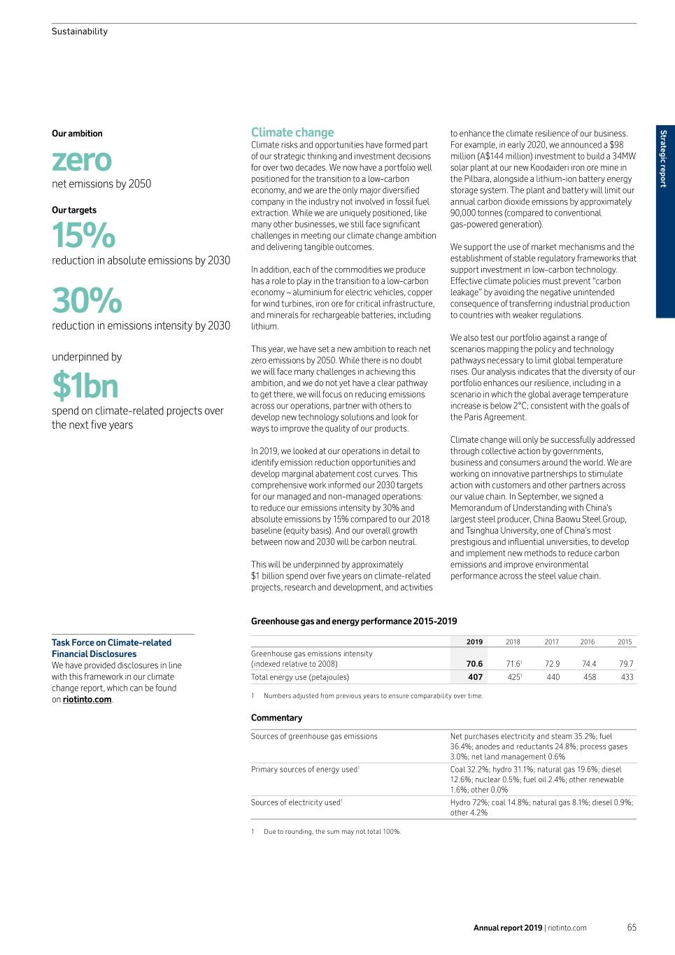 Sustainability Our ambition Climate change to enhance the climate resilience of our business. report Strategic Climate risks and opportunities have formed part For example, in early 2020, we announced a $98 of our strategic thinking and investment decisions million (A$144 million) investment to build a 34MW zero for over two decades. We now have a portfolio well solar plant at our new Koodaideri iron ore mine in net emissions by 2050 positioned for the transition to a low-carbon the Pilbara, alongside a lithium-ion battery energy economy, and we are the only major diversified storage system. The plant and battery will limit our company in the industry not involved in fossil fuel annual carbon dioxide emissions by approximately Our targets extraction. While we are uniquely positioned, like 90,000 tonnes (compared to conventional many other businesses, we still face significant gas-powered generation). challenges in meeting our climate change ambition 15% and delivering tangible outcomes. We support the use of market mechanisms and the reduction in absolute emissions by 2030 establishment of stable regulatory frameworks that In addition, each of the commodities we produce support investment in low-carbon technology. has a role to play in the transition to a low-carbon Effective climate policies must prevent “carbon economy – aluminium for electric vehicles, copper leakage” by avoiding the negative unintended for wind turbines, iron ore for critical infrastructure, consequence of transferring industrial production 30% and minerals for rechargeable batteries, including to countries with weaker regulations. reduction in emissions intensity by 2030 lithium. We also test our portfolio against a range of This year, we have set a new ambition to reach net scenarios mapping the policy and technology underpinned by zero emissions by 2050. While there is no doubt pathways necessary to limit global temperature we will face many challenges in achieving this rises. Our analysis indicates that the diversity of our ambition, and we do not yet have a clear pathway portfolio enhances our resilience, including in a $1bn to get there, we will focus on reducing emissions scenario in which the global average temperature spend on climate-related projects over across our operations, partner with others to increase is below 2°C; consistent with the goals of develop new technology solutions and look for the Paris Agreement. the next five years ways to improve the quality of our products. Climate change will only be successfully addressed In 2019, we looked at our operations in detail to through collective action by governments, identify emission reduction opportunities and business and consumers around the world. We are develop marginal abatement cost curves. This working on innovative partnerships to stimulate comprehensive work informed our 2030 targets action with customers and other partners across for our managed and non-managed operations: our value chain. In September, we signed a to reduce our emissions intensity by 30% and Memorandum of Understanding with China’s absolute emissions by 15% compared to our 2018 largest steel producer, China Baowu Steel Group, baseline (equity basis). And our overall growth and Tsinghua University, one of China’s most between now and 2030 will be carbon neutral. prestigious and influential universities, to develop and implement new methods to reduce carbon This will be underpinned by approximately emissions and improve environmental $1 billion spend over five years on climate-related performance across the steel value chain. projects, research and development, and activities Greenhouse gas and energy performance 2015-2019 Task Force on Climate-related 2019 2018 2017 2016 2015 Financial Disclosures Greenhouse gas emissions intensity We have provided disclosures in line (indexed relative to 2008) 70.6 71.61 72.9 74.4 79.7 with this framework in our climate Total energy use (petajoules) 407 4251 440 458 433 change report, which can be found on riotinto.com. 1 Numbers adjusted from previous years to ensure comparability over time. Commentary Sources of greenhouse gas emissions Net purchases electricity and steam 35.2%; fuel 36.4%; anodes and reductants 24.8%; process gases 3.0%; net land management 0.6% Primary sources of energy used1 Coal 32.2%; hydro 31.1%; natural gas 19.6%; diesel 12.6%; nuclear 0.5%; fuel oil 2.4%; other renewable 1.6%; other 0.0% Sources of electricity used1 Hydro 72%; coal 14.8%; natural gas 8.1%; diesel 0.9%; other 4.2% 1 Due to rounding, the sum may not total 100%. Annual report 2019 | riotinto.com 65