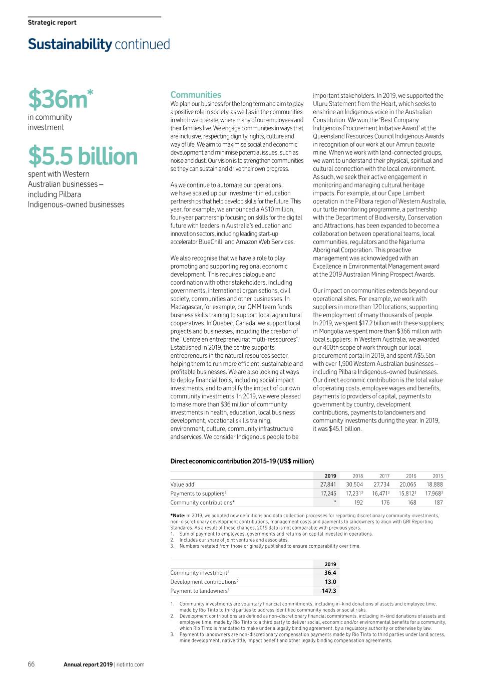 Strategic report Sustainability continued * Communities important stakeholders. In 2019, we supported the $36m We plan our business for the long term and aim to play Uluru Statement from the Heart, which seeks to a positive role in society, as well as in the communities enshrine an Indigenous voice in the Australian in community in which we operate, where many of our employees and Constitution. We won the ‘Best Company investment their families live. We engage communities in ways that Indigenous Procurement Initiative Award’ at the are inclusive, respecting dignity, rights, culture and Queensland Resources Council Indigenous Awards way of life. We aim to maximise social and economic in recognition of our work at our Amrun bauxite development and minimise potential issues, such as mine. When we work with land-connected groups, $5.5 billion noise and dust. Our vision is to strengthen communities we want to understand their physical, spiritual and so they can sustain and drive their own progress. cultural connection with the local environment. spent with Western As such, we seek their active engagement in Australian businesses – As we continue to automate our operations, monitoring and managing cultural heritage including Pilbara we have scaled up our investment in education impacts. For example, at our Cape Lambert Indigenous-owned businesses partnerships that help develop skills for the future. This operation in the Pilbara region of Western Australia, year, for example, we announced a A$10 million, our turtle monitoring programme, a partnership four-year partnership focusing on skills for the digital with the Department of Biodiversity, Conservation future with leaders in Australia’s education and and Attractions, has been expanded to become a innovation sectors, including leading start-up collaboration between operational teams, local accelerator BlueChilli and Amazon Web Services. communities, regulators and the Ngarluma Aboriginal Corporation. This proactive We also recognise that we have a role to play management was acknowledged with an promoting and supporting regional economic Excellence in Environmental Management award development. This requires dialogue and at the 2019 Australian Mining Prospect Awards. coordination with other stakeholders, including governments, international organisations, civil Our impact on communities extends beyond our society, communities and other businesses. In operational sites. For example, we work with Madagascar, for example, our QMM team funds suppliers in more than 120 locations, supporting business skills training to support local agricultural the employment of many thousands of people. cooperatives. In Quebec, Canada, we support local In 2019, we spent $17.2 billion with these suppliers; projects and businesses, including the creation of in Mongolia we spent more than $366 million with the “Centre en entrepreneuriat multi-ressources”. local suppliers. In Western Australia, we awarded Established in 2019, the centre supports our 400th scope of work through our local entrepreneurs in the natural resources sector, procurement portal in 2019, and spent A$5.5bn helping them to run more efficient, sustainable and with over 1,900 Western Australian businesses – profitable businesses. We are also looking at ways including Pilbara Indigenous-owned businesses. to deploy financial tools, including social impact Our direct economic contribution is the total value investments, and to amplify the impact of our own of operating costs, employee wages and benefits, community investments. In 2019, we were pleased payments to providers of capital, payments to to make more than $36 million of community government by country, development investments in health, education, local business contributions, payments to landowners and development, vocational skills training, community investments during the year. In 2019, environment, culture, community infrastructure it was $45.1 billion. and services. We consider Indigenous people to be Direct economic contribution 2015-19 (US$ million) 2019 2018 2017 2016 2015 Value add1 27,841 30,504 27,734 20,065 18,888 Payments to suppliers2 17,245 17,2313 16,4713 15,8123 17,968 3 Community contributions* * 192 176 168 187 *Note: In 2019, we adopted new definitions and data collection processes for reporting discretionary community investments, non-discretionary development contributions, management costs and payments to landowners to align with GRI Reporting Standards. As a result of these changes, 2019 data is not comparable with previous years. 1. Sum of payment to employees, governments and returns on capital invested in operations. 2. Includes our share of joint ventures and associates. 3. Numbers restated from those originally published to ensure comparability over time. 2019 Community investment1 36.4 Development contributions2 13.0 Payment to landowners3 147.3 1. Community investments are voluntary financial commitments, including in-kind donations of assets and employee time, made by Rio Tinto to third parties to address identified community needs or social risks. 2. Development contributions are defined as non-discretionary financial commitments, including in-kind donations of assets and employee time, made by Rio Tinto to a third party to deliver social, economic and/or environmental benefits for a community, which Rio Tinto is mandated to make under a legally binding agreement, by a regulatory authority or otherwise by law. 3. Payment to landowners are non-discretionary compensation payments made by Rio Tinto to third parties under land access, mine development, native title, impact benefit and other legally binding compensation agreements. 66 Annual report 2019 | riotinto.com