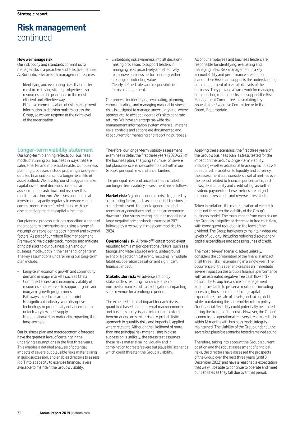 Strategic report Risk management continued How we manage risk –– Embedding risk awareness into all decision- All of our employees and business leaders are Our risk policy and standards commit us to making processes to support leaders in responsible for identifying, evaluating and manage risks in a proactive and effective manner. managing risks proactively and effectively managing risks. Risk management is a key At Rio Tinto, effective risk management requires: to improve business performance by either accountability and performance area for our creating or protecting value leaders. Our Risk team supports the understanding –– Identifying and evaluating risks that matter –– Clearly defined roles and responsibilities and management of risks at all levels of the most in achieving strategic objectives, so for risk management. business. They provide a framework for managing resources can be prioritised in the most and reporting material risks and support the Risk efficient and effective way Our process for identifying, evaluating, planning, Management Committee in escalating key –– Effective communication of risk management communicating, and managing material business issues to the Executive Committee or to the information to decision makers across the risks is designed to manage uncertainty and, where Board, if appropriate. Group, so we can respond at the right level appropriate, to accept a degree of risk to generate of the organisation returns. We have an enterprise-wide risk management information system where all material risks, controls and actions are documented and kept current for managing and reporting purposes. Longer-term viability statement Therefore, our longer-term viability assessment Applying these scenarios, the first three years of Our long-term planning reflects our business examines in detail the first three years (2020-22) of the Group’s business plan is stress tested for the model of running our business in ways that are the business plan, analysing a number of ‘severe impact on the Group’s longer-term viability, safer, smarter and more sustainable. Our business but plausible’ scenarios contemplated within our including whether additional financing facilities will planning processes include preparing a one-year Group’s principal risks and uncertainties. be required. In addition to liquidity and solvency, detailed financial plan and a longer-term life of the assessment also considers a set of metrics over asset outlook. We develop our strategy and make The principal risks and uncertainties included in the period related to financial performance, cash capital investment decisions based on an our longer-term viability assessment are as follows. flows, debt capacity and credit rating, as well as assessment of cash flows and risk over this dividend payments. These metrics are subject multi-decade horizon. We assess our financial Market risk: A global economic crisis triggered by to robust stress tests and reverse stress tests. investment capacity regularly to ensure capital a disrupting factor, such as geopolitical tensions or commitments can be funded in line with our a pandemic event, that could generate global Taken in isolation, the materialisation of each risk disciplined approach to capital allocation. recessionary conditions and lead to an economic does not threaten the viability of the Group’s downturn. Our stress testing includes modelling a business model. The main impact from each risk on Our planning process includes modelling a series of large negative pricing shock assumed in 2021 the Group is a significant decrease in free cash flow, macroeconomic scenarios and using a range of followed by a recovery in most commodities by with consequent reduction in the level of the assumptions considering both internal and external 2024. dividend. The Group has levers to maintain adequate factors. As part of our robust Risk Management levels of liquidity, including reducing discretionary Framework, we closely track, monitor and mitigate Operational risk: A “one-off” catastrophic event capital expenditure and accessing lines of credit. principal risks to our business plan and our resulting from a major operational failure, such as a business model, both in the near and longer term. tailings and water storage event, underground The most ‘severe’ scenario, albeit unlikely, The key assumptions underpinning our long-term event or a geotechnical event, resulting in multiple considers the combination of the financial impact plan include: fatalities, operation cessation and significant of all three risks materialising in a single year. The financial impact. occurrence of this scenario creates an immediate –– Long-term economic growth and commodity severe impact on the Group’s financial performance demand in major markets such as China Stakeholder risk: An adverse action by with an estimated negative free cash flow of $7 –– Continued access and economic viability of stakeholders resulting in a cancellation or billion. The Group has a suite of management resources and reserves to support organic and non-performance in offtake obligations impacting actions available to preserve resilience, including inorganic growth programmes sales revenue for a prolonged period. accessing lines of credit, reducing capital –– Pathways to reduce carbon footprint expenditure, the sale of assets, and raising debt –– No significant industry-wide disruptive The expected financial impact for each risk is while maintaining the shareholder return policy. technology or productivity enhancement to quantified based on our internal macroeconomic Our financial flexibility could potentially be limited unlock very low-cost supply and business analysis, and internal and external during the trough of the crisis. However, the Group’s –– No operational risks materially impacting the benchmarking on similar risks. A probabilistic economic and operational recove