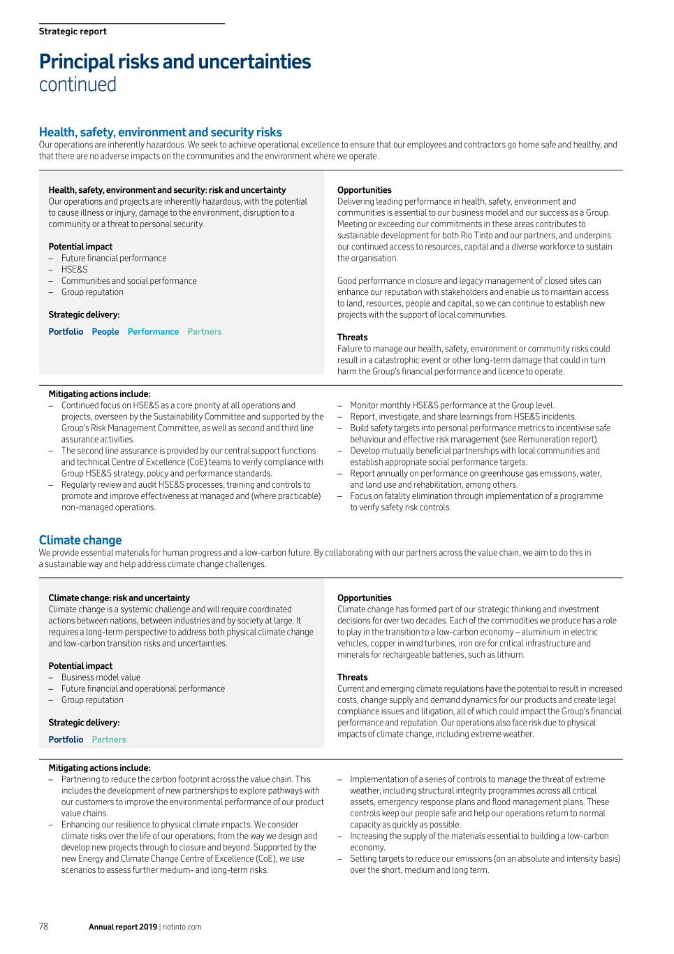 Strategic report Principal risks and uncertainties continued Health, safety, environment and security risks Our operations are inherently hazardous. We seek to achieve operational excellence to ensure that our employees and contractors go home safe and healthy, and that there are no adverse impacts on the communities and the environment where we operate. Health, safety, environment and security: risk and uncertainty Opportunities Our operations and projects are inherently hazardous, with the potential Delivering leading performance in health, safety, environment and to cause illness or injury, damage to the environment, disruption to a communities is essential to our business model and our success as a Group. community or a threat to personal security. Meeting or exceeding our commitments in these areas contributes to sustainable development for both Rio Tinto and our partners, and underpins Potential impact our continued access to resources, capital and a diverse workforce to sustain –– Future financial performance the organisation. –– HSE&S –– Communities and social performance Good performance in closure and legacy management of closed sites can –– Group reputation enhance our reputation with stakeholders and enable us to maintain access to land, resources, people and capital, so we can continue to establish new Strategic delivery: projects with the support of local communities. Portfolio People Performance Partners Threats Failure to manage our health, safety, environment or community risks could result in a catastrophic event or other long-term damage that could in turn harm the Group’s financial performance and licence to operate. Mitigating actions include: –– Continued focus on HSE&S as a core priority at all operations and –– Monitor monthly HSE&S performance at the Group level. projects, overseen by the Sustainability Committee and supported by the –– Report, investigate, and share learnings from HSE&S incidents. Group’s Risk Management Committee, as well as second and third line –– Build safety targets into personal performance metrics to incentivise safe assurance activities. behaviour and effective risk management (see Remuneration report). –– The second line assurance is provided by our central support functions –– Develop mutually beneficial partnerships with local communities and and technical Centre of Excellence (CoE) teams to verify compliance with establish appropriate social performance targets. Group HSE&S strategy, policy and performance standards. –– Report annually on performance on greenhouse gas emissions, water, –– Regularly review and audit HSE&S processes, training and controls to and land use and rehabilitation, among others. promote and improve effectiveness at managed and (where practicable) –– Focus on fatality elimination through implementation of a programme non-managed operations. to verify safety risk controls. Climate change We provide essential materials for human progress and a low-carbon future. By collaborating with our partners across the value chain, we aim to do this in a sustainable way and help address climate change challenges. Climate change: risk and uncertainty Opportunities Climate change is a systemic challenge and will require coordinated Climate change has formed part of our strategic thinking and investment actions between nations, between industries and by society at large. It decisions for over two decades. Each of the commodities we produce has a role requires a long-term perspective to address both physical climate change to play in the transition to a low-carbon economy – aluminium in electric and low-carbon transition risks and uncertainties. vehicles, copper in wind turbines, iron ore for critical infrastructure and minerals for rechargeable batteries, such as lithium. Potential impact –– Business model value Threats –– Future financial and operational performance Current and emerging climate regulations have the potential to result in increased –– Group reputation costs, change supply and demand dynamics for our products and create legal compliance issues and litigation, all of which could impact the Group’s financial Strategic delivery: performance and reputation. Our operations also face risk due to physical impacts of climate change, including extreme weather. Portfolio Partners Mitigating actions include: –– Partnering to reduce the carbon footprint across the value chain. This –– Implementation of a series of controls to manage the threat of extreme includes the development of new partnerships to explore pathways with weather, including structural integrity programmes across all critical our customers to improve the environmental performance of our product assets, emergency response plans and flood management plans. These value chains. controls keep our people safe and help our operations return to normal –– Enhancing our resilience to physical climate impacts. We consider capacity as quickly as possible. climate risks over the life of our operations, from the way we design and –– Increasing the supply of the materials essential to building a low-carbon develop new projects through to closure and beyond. Supported by the economy. new Energy and Climate Change Centre of Excellence (CoE), we use –– Setting targets to reduce our emissions (on an absolute and intensity basis) scenarios to assess further medium- and long-term risks. over the short, medium and long term. 78 Annual report 2019 | riotinto.com