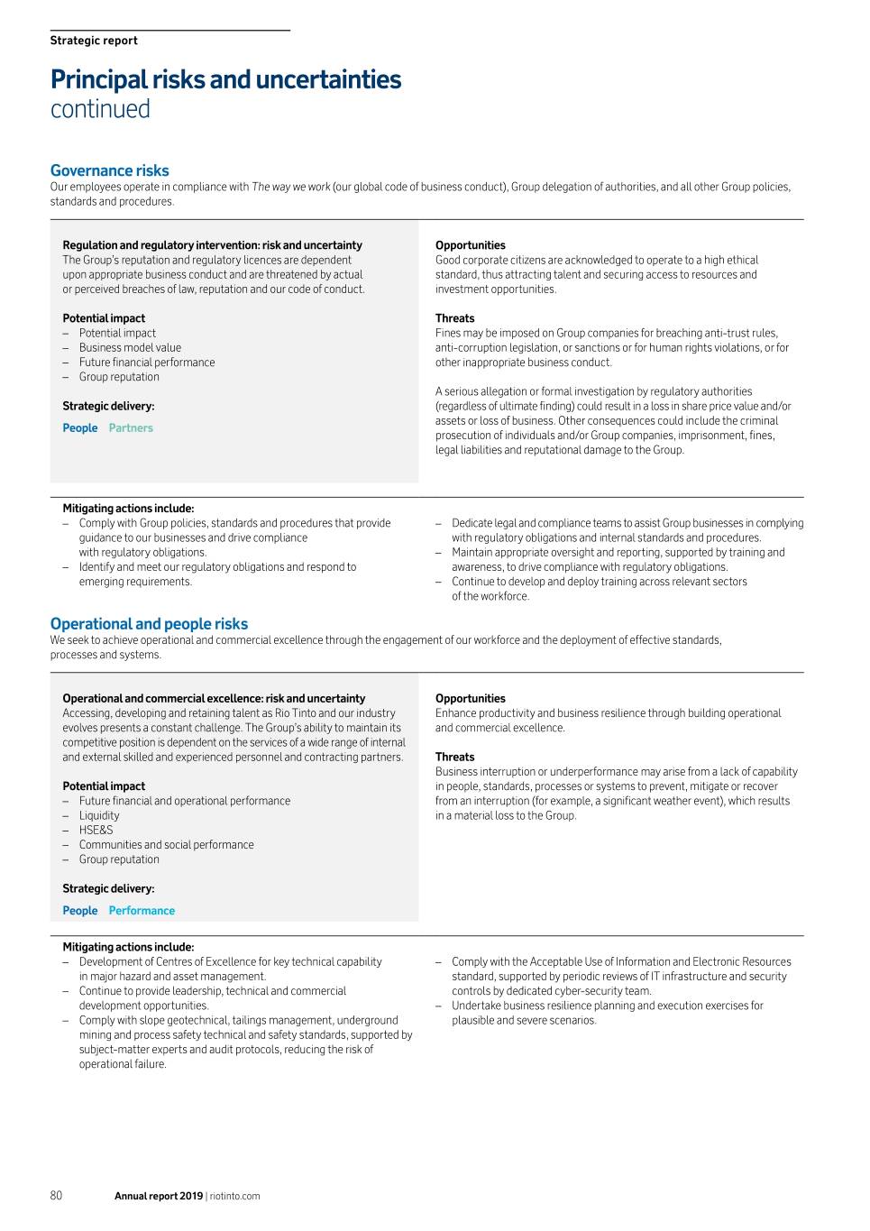 Principal risks and uncertainties Market risks continued report Strategic China development pathway: risk and uncertainty Opportunities China’s growth pathway could impact demand for the Group’s products Strong growth, positive policy decisions and reforms drive demand for outside of expectations. China is the largest market for our products. commodities, resulting in rising commodity prices that may justify capital expansion and increased shareholder returns in the short to medium term. Potential impact –– Business model value Threats –– Future financial performance An economic slowdown in China, and/or a material change in policy, could –– Solvency result in a slowdown in demand for our products and reduced earnings and –– Liquidity cash flow for the Group. –– Partnerships Strategic delivery: Portfolio People Mitigating actions include: –– Pursue low-cost production, allowing profitable supply throughout the –– Leverage market-facing sales, marketing and trading resources in the Group. commodity price cycle. –– Apply strong governance reflecting relevant regulatory frameworks and –– Maintain a diverse portfolio of commodities across a number of geographies. jurisdictions. –– Maintain a global portfolio of customers and contracts. –– Comply with the Group’s financial risk management practices outlined in –– Monitor multiple leading indicators and undertake detailed industry the Group’s Treasury policy and standard. analysis to inform our forecasting assumptions. Strategic risks Rio Tinto enforces disciplined capital and risk allocation to the best opportunities (organic and inorganic) for shareholders returns. Execution of acquisitions and divestments: risk and uncertainty Opportunities Our ability to secure planned value by successfully executing Proceeds realised from divested assets are greater than planned, allowing divestments and acquisitions may vary. more capital to be returned to shareholders or redeployed into higher-returning or more productive uses. The Group is successful in acquiring and integrating Potential impact businesses on acceptable terms that provide sustainable future cash flow and/ –– Business model value or future growth optionality. –– Future financial performance –– Solvency Threats –– Liquidity Divestment and acquisition activity incurs transaction costs that cannot be –– Group reputation recouped. Such activity may result in value destruction by realising less than fair value for divestments, or paying more than fair value or failing to integrate Strategy delivery: successfully for acquisitions. The Group may also be liable for the past acts or omissions of assets it has acquired that were unforeseen or greater than Portfolio People Partners anticipated at the time of acquisition. The Group may also face liabilities for divested entities if the buyer fails to honour commitments or the Group agrees to retain certain liabilities. Annual report 2019 | riotinto.com 75