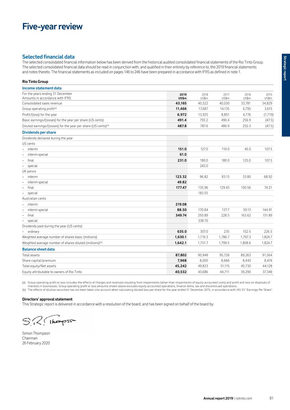 Five-year review Selected financial data report Strategic The selected consolidated financial information below has been derived from the historical audited consolidated financial statements of the Rio Tinto Group. The selected consolidated financial data should be read in conjunction with, and qualified in their entirety by reference to, the 2019 financial statements and notes thereto. The financial statements as included on pages 146 to 246 have been prepared in accordance with IFRS as defined in note 1. Rio Tinto Group Income statement data For the years ending 31 December 2019 2018 2017 2016 2015 Amounts in accordance with IFRS US$m US$m US$m US$m US$m Consolidated sales revenue 43,165 40,522 40,030 33,781 34,829 Group operating profit(a) 11,466 17,687 14,135 6,795 3,615 Profit/(loss) for the year 6,972 13,925 8,851 4,776 (1,719) Basic earnings/(losses) for the year per share (US cents) 491.4 793.2 490.4 256.9 (47.5) Diluted earnings/(losses) for the year per share (US cents)(b) 487.8 787.6 486.9 255.3 (47.5) Dividends per share Dividends declared during the year US cents –– interim 151.0 127.0 110.0 45.0 107.5 –– interim special 61.0 –– final 231.0 180.0 180.0 125.0 107.5 –– special 243.0 UK pence –– interim 123.32 96.82 83.13 33.80 68.92 –– interim special 49.82 –– final 177.47 135.96 129.43 100.56 74.21 –– special 183.55 Australian cents –– interim 219.08 –– interim special 88.50 170.84 137.7 59.13 144.91 –– final 349.74 250.89 228.5 163.62 151.89 –– special 338.70 Dividends paid during the year (US cents) –– ordinary 635.0 307.0 235 152.5 226.5 Weighted average number of shares basic (millions) 1,630.1 1,719.3 1,786.7 1,797.3 1,824.7 Weighted average number of shares diluted (millions)(b) 1,642.1 1,731.7 1,799.5 1,808.6 1,824.7 Balance sheet data Total assets 87,802 90,949 95,726 89,263 91,564 Share capital/premium 7,968 8,000 8,666 8,443 8,474 Total equity/Net assets 45,242 49,823 51,115 45,730 44,128 Equity attributable to owners of Rio Tinto 40,532 43,686 44,711 39,290 37,349 (a) Group operating profit or loss includes the effects of charges and reversals resulting from impairments (other than impairments of equity accounted units) and profit and loss on disposals of interests in businesses. Group operating profit or loss amounts shown above excludes equity accounted operations, finance items, tax and discontinued operations. (b) The effects of dilutive securities has not been taken into account when calculating diluted loss per share for the year ended 31 December 2015, in accordance with IAS 33 “Earnings Per Share”. Directors’ approval statement This Strategic report is delivered in accordance with a resolution of the board, and has been signed on behalf of the board by: Simon Thompson Chairman 26 February 2020 Annual report 2019 | riotinto.com 81