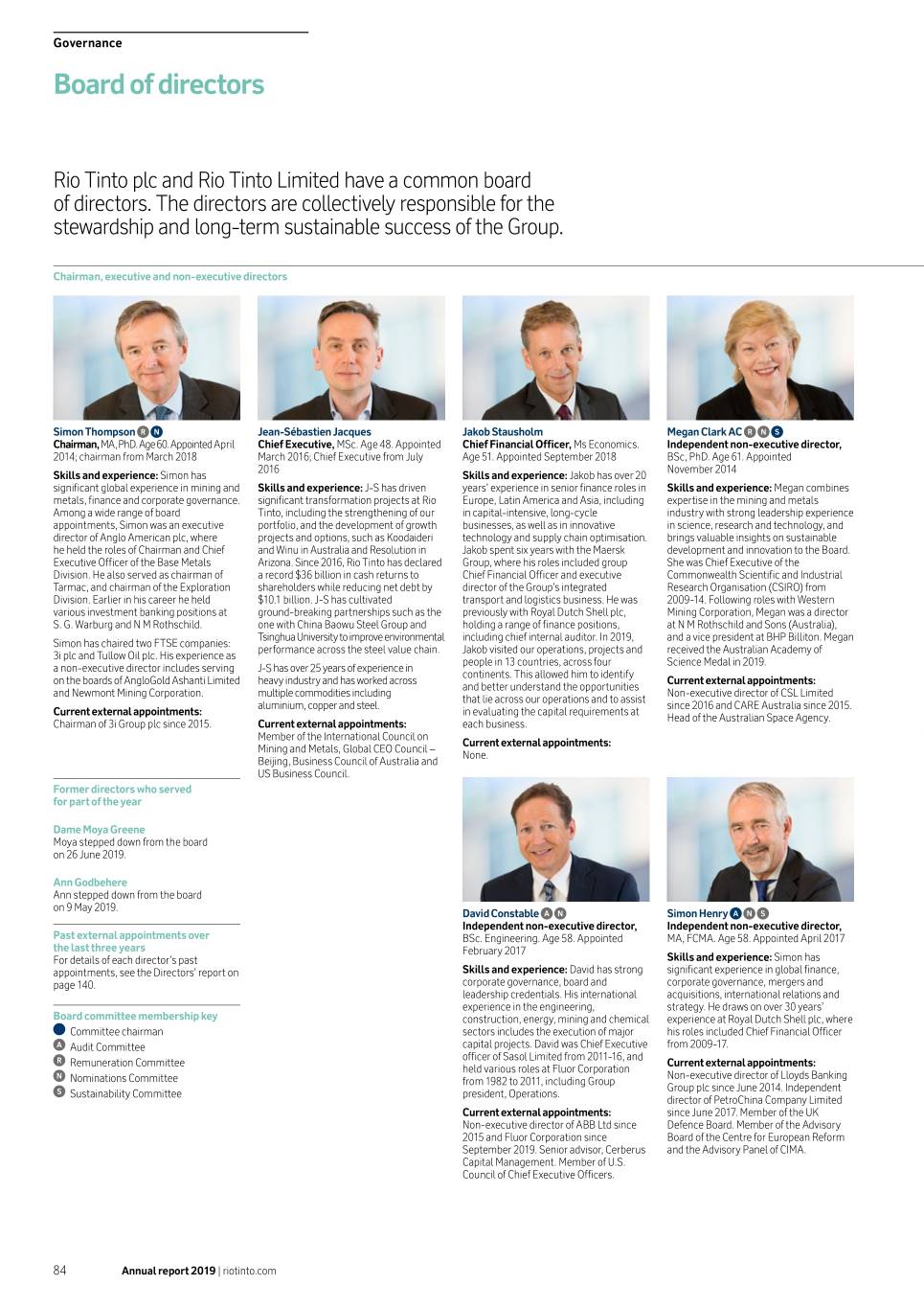 Governance Board of directors Rio Tinto plc and Rio Tinto Limited have a common board of directors. The directors are collectively responsible for the stewardship and long-term sustainable success of the Group. Chairman, executive and non-executive directors Simon Thompson Jean-Sébastien Jacques Jakob Stausholm Megan Clark AC Chairman, MA, PhD. Age 60. Appointed April Chief Executive, MSc. Age 48. Appointed Chief Financial Officer, Ms Economics. Independent non-executive director, 2014; chairman from March 2018 March 2016; Chief Executive from July Age 51. Appointed September 2018 BSc, PhD. Age 61. Appointed 2016 November 2014 Skills and experience: Simon has Skills and experience: Jakob has over 20 significant global experience in mining and Skills and experience: J-S has driven years’ experience in senior finance roles in Skills and experience: Megan combines metals, finance and corporate governance. significant transformation projects at Rio Europe, Latin America and Asia, including expertise in the mining and metals Among a wide range of board Tinto, including the strengthening of our in capital-intensive, long-cycle industry with strong leadership experience appointments, Simon was an executive portfolio, and the development of growth businesses, as well as in innovative in science, research and technology, and director of Anglo American plc, where projects and options, such as Koodaideri technology and supply chain optimisation. brings valuable insights on sustainable he held the roles of Chairman and Chief and Winu in Australia and Resolution in Jakob spent six years with the Maersk development and innovation to the Board. Executive Officer of the Base Metals Arizona. Since 2016, Rio Tinto has declared Group, where his roles included group She was Chief Executive of the Division. He also served as chairman of a record $36 billion in cash returns to Chief Financial Officer and executive Commonwealth Scientific and Industrial Tarmac, and chairman of the Exploration shareholders while reducing net debt by director of the Group’s integrated Research Organisation (CSIRO) from Division. Earlier in his career he held $10.1 billion. J-S has cultivated transport and logistics business. He was 2009-14. Following roles with Western various investment banking positions at ground-breaking partnerships such as the previously with Royal Dutch Shell plc, Mining Corporation, Megan was a director S. G. Warburg and N M Rothschild. one with China Baowu Steel Group and holding a range of finance positions, at N M Rothschild and Sons (Australia), Tsinghua University to improve environmental including chief internal auditor. In 2019, and a vice president at BHP Billiton. Megan Simon has chaired two FTSE companies: performance across the steel value chain. Jakob visited our operations, projects and received the Australian Academy of 3i plc and Tullow Oil plc. His experience as people in 13 countries, across four Science Medal in 2019. a non-executive director includes serving J-S has over 25 years of experience in continents. This allowed him to identify on the boards of AngloGold Ashanti Limited heavy industry and has worked across Current external appointments: and better understand the opportunities and Newmont Mining Corporation. multiple commodities including Non-executive director of CSL Limited that lie across our operations and to assist aluminium, copper and steel. since 2016 and CARE Australia since 2015. Current external appointments: in evaluating the capital requirements at Head of the Australian Space Agency. Chairman of 3i Group plc since 2015. Current external appointments: each business. Member of the International Council on Current external appointments: Mining and Metals, Global CEO Council – None. Beijing, Business Council of Australia and US Business Council. Former directors who served for part of the year Dame Moya Greene Moya stepped down from the board on 26 June 2019. Ann Godbehere Ann stepped down from the board on 9 May 2019. David Constable Simon Henry Independent non-executive director, Independent non-executive director, Past external appointments over BSc. Engineering. Age 58. Appointed MA, FCMA. Age 58. Appointed April 2017 the last three years February 2017 For details of each director’s past Skills and experience: Simon has appointments, see the Directors’ report on Skills and experience: David has strong significant experience in global finance, page 140. corporate governance, board and corporate governance, mergers and leadership credentials. His international acquisitions, international relations and experience in the engineering, strategy. He draws on over 30 years’ Board committee membership key construction, energy, mining and chemical experience at Royal Dutch Shell plc, where Committee chairman sectors includes the execution of major his roles included Chief Financial Officer Audit Committee capital projects. David was Chief Executive from 2009-17. officer of Sasol Limited from 2011-16, and Remuneration Committee Current external appointments: held various roles at Fluor Corporation Non-executive director of Lloyds Banking Nominations Committee from 1982 to 2011, including Group Group plc since June 2014. Independent Sustainability Committee president, Operations. director of PetroChina Company Limited Current external appointments: since June 2017. Member of the UK Non-executive director of ABB Ltd since Defence Board. Member of the Advisory 2015 and Fluor Corporation since Board of the Centre for European Reform September 2019. Senior advisor, Cerberus and the Advisory Panel of CIMA. Capital Management. Member of U.S. Council of Chief Executive Officers. 84 Annual report 2019 | riotinto.com
