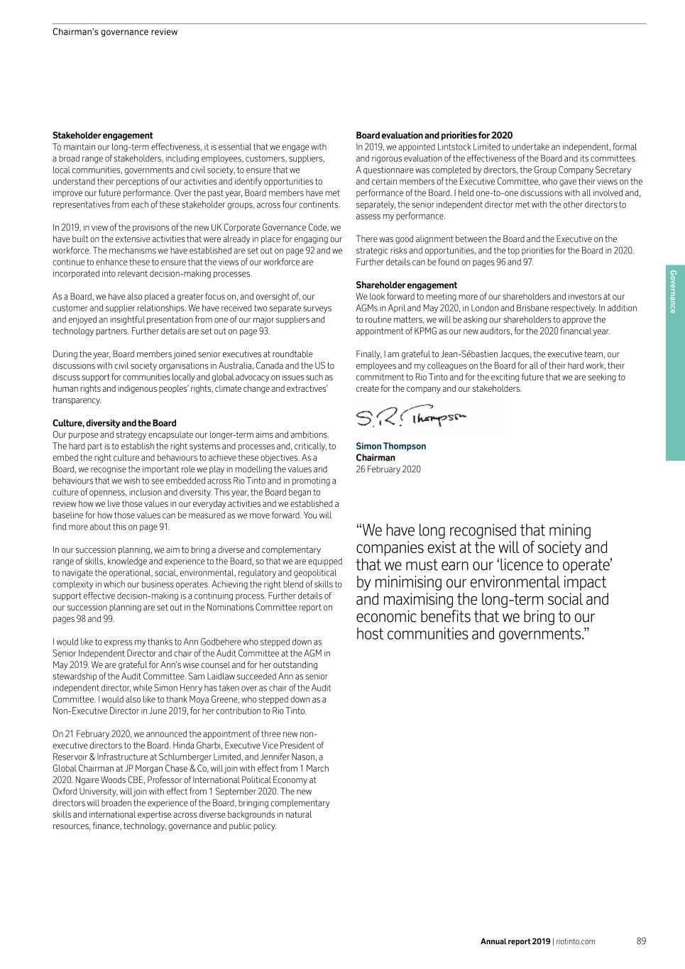 Chairman’s governance review Stakeholder engagement Board evaluation and priorities for 2020 To maintain our long-term effectiveness, it is essential that we engage with In 2019, we appointed Lintstock Limited to undertake an independent, formal a broad range of stakeholders, including employees, customers, suppliers, and rigorous evaluation of the effectiveness of the Board and its committees. local communities, governments and civil society, to ensure that we A questionnaire was completed by directors, the Group Company Secretary understand their perceptions of our activities and identify opportunities to and certain members of the Executive Committee, who gave their views on the improve our future performance. Over the past year, Board members have met performance of the Board. I held one-to-one discussions with all involved and, representatives from each of these stakeholder groups, across four continents. separately, the senior independent director met with the other directors to assess my performance. In 2019, in view of the provisions of the new UK Corporate Governance Code, we have built on the extensive activities that were already in place for engaging our There was good alignment between the Board and the Executive on the workforce. The mechanisms we have established are set out on page 92 and we strategic risks and opportunities, and the top priorities for the Board in 2020. continue to enhance these to ensure that the views of our workforce are Further details can be found on pages 96 and 97. incorporated into relevant decision-making processes. Governance Shareholder engagement As a Board, we have also placed a greater focus on, and oversight of, our We look forward to meeting more of our shareholders and investors at our customer and supplier relationships. We have received two separate surveys AGMs in April and May 2020, in London and Brisbane respectively. In addition and enjoyed an insightful presentation from one of our major suppliers and to routine matters, we will be asking our shareholders to approve the technology partners. Further details are set out on page 93. appointment of KPMG as our new auditors, for the 2020 financial year. During the year, Board members joined senior executives at roundtable Finally, I am grateful to Jean-Sébastien Jacques, the executive team, our discussions with civil society organisations in Australia, Canada and the US to employees and my colleagues on the Board for all of their hard work, their discuss support for communities locally and global advocacy on issues such as commitment to Rio Tinto and for the exciting future that we are seeking to human rights and indigenous peoples’ rights, climate change and extractives’ create for the company and our stakeholders. transparency. Culture, diversity and the Board Our purpose and strategy encapsulate our longer-term aims and ambitions. The hard part is to establish the right systems and processes and, critically, to Simon Thompson embed the right culture and behaviours to achieve these objectives. As a Chairman Board, we recognise the important role we play in modelling the values and 26 February 2020 behaviours that we wish to see embedded across Rio Tinto and in promoting a culture of openness, inclusion and diversity. This year, the Board began to review how we live those values in our everyday activities and we established a baseline for how those values can be measured as we move forward. You will find more about this on page 91. “We have long recognised that mining In our succession planning, we aim to bring a diverse and complementary companies exist at the will of society and range of skills, knowledge and experience to the Board, so that we are equipped to navigate the operational, social, environmental, regulatory and geopolitical that we must earn our ‘licence to operate’ complexity in which our business operates. Achieving the right blend of skills to by minimising our environmental impact support effective decision-making is a continuing process. Further details of our succession planning are set out in the Nominations Committee report on and maximising the long-term social and pages 98 and 99. economic benefits that we bring to our I would like to express my thanks to Ann Godbehere who stepped down as host communities and governments.” Senior Independent Director and chair of the Audit Committee at the AGM in May 2019. We are grateful for Ann’s wise counsel and for her outstanding stewardship of the Audit Committee. Sam Laidlaw succeeded Ann as senior independent director, while Simon Henry has taken over as chair of the Audit Committee. I would also like to thank Moya Greene, who stepped down as a Non-Executive Director in June 2019, for her contribution to Rio Tinto. On 21 February 2020, we announced the appointment of three new non- executive directors to the Board. Hinda Gharbi, Executive Vice President of Reservoir & Infrastructure at Schlumberger Limited, and Jennifer Nason, a Global Chairman at JP Morgan Chase & Co, will join with effect from 1 March 2020. Ngaire Woods CBE, Professor of International Political Economy at Oxford University, will join with effect from 1 September 2020. The new directors will broaden the experience of the Board, bringing complementary skills and international expertise across diverse backgrounds in natural resources, finance, technology, governance and public policy. Annual report 2019 | riotinto.com 89