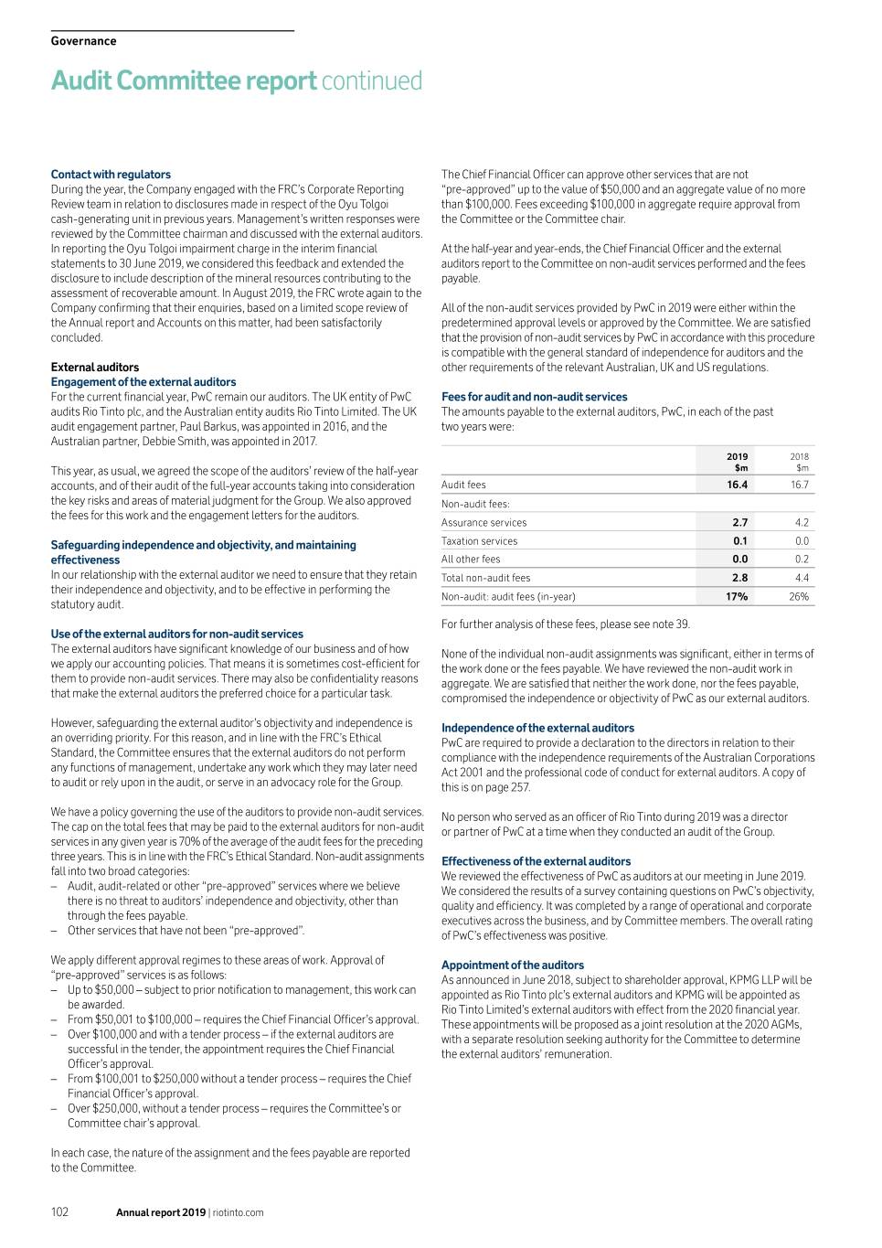 Governance Audit Committee report continued Contact with regulators The Chief Financial Officer can approve other services that are not During the year, the Company engaged with the FRC’s Corporate Reporting “pre-approved” up to the value of $50,000 and an aggregate value of no more Review team in relation to disclosures made in respect of the Oyu Tolgoi than $100,000. Fees exceeding $100,000 in aggregate require approval from cash-generating unit in previous years. Management’s written responses were the Committee or the Committee chair. reviewed by the Committee chairman and discussed with the external auditors. In reporting the Oyu Tolgoi impairment charge in the interim financial At the half-year and year-ends, the Chief Financial Officer and the external statements to 30 June 2019, we considered this feedback and extended the auditors report to the Committee on non-audit services performed and the fees disclosure to include description of the mineral resources contributing to the payable. assessment of recoverable amount. In August 2019, the FRC wrote again to the Company confirming that their enquiries, based on a limited scope review of All of the non-audit services provided by PwC in 2019 were either within the the Annual report and Accounts on this matter, had been satisfactorily predetermined approval levels or approved by the Committee. We are satisfied concluded. that the provision of non-audit services by PwC in accordance with this procedure is compatible with the general standard of independence for auditors and the External auditors other requirements of the relevant Australian, UK and US regulations. Engagement of the external auditors For the current financial year, PwC remain our auditors. The UK entity of PwC Fees for audit and non-audit services audits Rio Tinto plc, and the Australian entity audits Rio Tinto Limited. The UK The amounts payable to the external auditors, PwC, in each of the past audit engagement partner, Paul Barkus, was appointed in 2016, and the two years were: Australian partner, Debbie Smith, was appointed in 2017. 2019 2018 This year, as usual, we agreed the scope of the auditors’ review of the half-year $m $m accounts, and of their audit of the full-year accounts taking into consideration Audit fees 16.4 16.7 the key risks and areas of material judgment for the Group. We also approved Non-audit fees: the fees for this work and the engagement letters for the auditors. Assurance services 2.7 4.2 Safeguarding independence and objectivity, and maintaining Taxation services 0.1 0.0 effectiveness All other fees 0.0 0.2 In our relationship with the external auditor we need to ensure that they retain Total non-audit fees 2.8 4.4 their independence and objectivity, and to be effective in performing the Non-audit: audit fees (in-year) 17% 26% statutory audit. For further analysis of these fees, please see note 39. Use of the external auditors for non-audit services The external auditors have significant knowledge of our business and of how None of the individual non-audit assignments was significant, either in terms of we apply our accounting policies. That means it is sometimes cost-efficient for the work done or the fees payable. We have reviewed the non-audit work in them to provide non-audit services. There may also be confidentiality reasons aggregate. We are satisfied that neither the work done, nor the fees payable, that make the external auditors the preferred choice for a particular task. compromised the independence or objectivity of PwC as our external auditors. However, safeguarding the external auditor’s objectivity and independence is Independence of the external auditors an overriding priority. For this reason, and in line with the FRC’s Ethical PwC are required to provide a declaration to the directors in relation to their Standard, the Committee ensures that the external auditors do not perform compliance with the independence requirements of the Australian Corporations any functions of management, undertake any work which they may later need Act 2001 and the professional code of conduct for external auditors. A copy of to audit or rely upon in the audit, or serve in an advocacy role for the Group. this is on page 257. We have a policy governing the use of the auditors to provide non-audit services. No person who served as an officer of Rio Tinto during 2019 was a director The cap on the total fees that may be paid to the external auditors for non-audit or partner of PwC at a time when they conducted an audit of the Group. services in any given year is 70% of the average of the audit fees for the preceding three years. This is in line with the FRC’s Ethical Standard. Non-audit assignments Effectiveness of the external auditors fall into two broad categories: We reviewed the effectiveness of PwC as auditors at our meeting in June 2019. –– Audit, audit-related or other “pre-approved” services where we believe We considered the results of a survey containing questions on PwC’s objectivity, there is no threat to auditors’ independence and objectivity, other than quality and efficiency. It was completed by a range of operational and corporate through the fees payable. executives across the business, and by Committee members. The overall rating –– Other services that have not been “pre-approved”. of PwC’s effectiveness was positive. We apply different approval regimes to these areas of work. Approval of Appointment of the auditors “pre-approved” services is as follows: As announced in June 2018, subject to shareholder approval, KPMG LLP will be –– Up to $50,000 – subject to prior notification to management, this work can appointed as Rio Tinto plc’s external auditors and KPMG will be appointed as be awarded. Rio Tinto Limited’s external auditors with effect from the 2020 financial year. –– From $50,001 to $100,000 – requires the Chief Financial Officer’s approval. These appointments wi