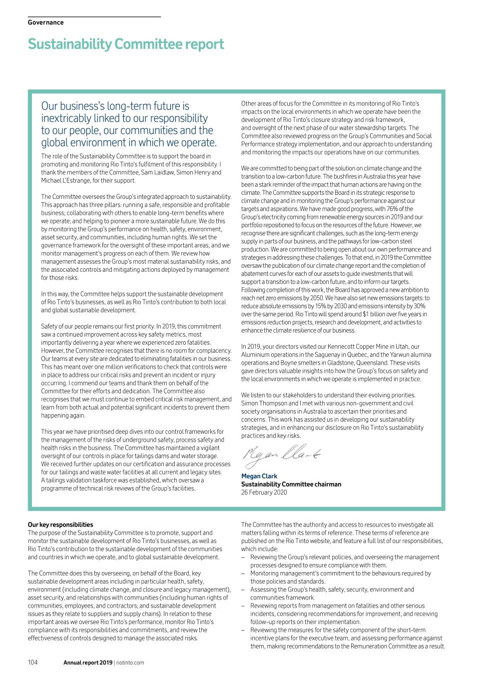 Governance Sustainability Committee report Other areas of focus for the Committee in its monitoring of Rio Tinto’s Our business’s long-term future is impacts on the local environments in which we operate have been the inextricably linked to our responsibility development of Rio Tinto’s closure strategy and risk framework, and oversight of the next phase of our water stewardship targets. The to our people, our communities and the Committee also reviewed progress on the Group’s Communities and Social global environment in which we operate. Performance strategy implementation, and our approach to understanding and monitoring the impacts our operations have on our communities. The role of the Sustainability Committee is to support the board in promoting and monitoring Rio Tinto’s fulfilment of this responsibility. I We are committed to being part of the solution on climate change and the thank the members of the Committee, Sam Laidlaw, Simon Henry and transition to a low-carbon future. The bushfires in Australia this year have Michael L’Estrange, for their support. been a stark reminder of the impact that human actions are having on the climate. The Committee supports the Board in its strategic response to The Committee oversees the Group’s integrated approach to sustainability. climate change and in monitoring the Group’s performance against our This approach has three pillars: running a safe, responsible and profitable targets and aspirations. We have made good progress, with 76% of the business; collaborating with others to enable long-term benefits where Group’s electricity coming from renewable energy sources in 2019 and our we operate; and helping to pioneer a more sustainable future. We do this portfolio repositioned to focus on the resources of the future. However, we by monitoring the Group’s performance on health, safety, environment, recognise there are significant challenges, such as the long-term energy asset security, and communities, including human rights. We set the supply in parts of our business, and the pathways for low-carbon steel governance framework for the oversight of these important areas, and we production. We are committed to being open about our own performance and monitor management’s progress on each of them. We review how strategies in addressing these challenges. To that end, in 2019 the Committee management assesses the Group’s most material sustainability risks, and oversaw the publication of our climate change report and the completion of the associated controls and mitigating actions deployed by management abatement curves for each of our assets to guide investments that will for those risks. support a transition to a low‑carbon future, and to inform our targets. Following completion of this work, the Board has approved a new ambition to In this way, the Committee helps support the sustainable development reach net zero emissions by 2050. We have also set new emissions targets: to of Rio Tinto’s businesses, as well as Rio Tinto’s contribution to both local reduce absolute emissions by 15% by 2030 and emissions intensity by 30% and global sustainable development. over the same period. Rio Tinto will spend around $1 billion over five years in emissions reduction projects, research and development, and activities to Safety of our people remains our first priority. In 2019, this commitment enhance the climate resilience of our business. saw a continued improvement across key safety metrics, most importantly delivering a year where we experienced zero fatalities. In 2019, your directors visited our Kennecott Copper Mine in Utah, our However, the Committee recognises that there is no room for complacency. Aluminium operations in the Saguenay in Quebec, and the Yarwun alumina Our teams at every site are dedicated to eliminating fatalities in our business. operations and Boyne smelters in Gladstone, Queensland. These visits This has meant over one million verifications to check that controls were gave directors valuable insights into how the Group’s focus on safety and in place to address our critical risks and prevent an incident or injury the local environments in which we operate is implemented in practice. occurring. I commend our teams and thank them on behalf of the Committee for their efforts and dedication. The Committee also We listen to our stakeholders to understand their evolving priorities. recognises that we must continue to embed critical risk management, and Simon Thompson and I met with various non-government and civil learn from both actual and potential significant incidents to prevent them society organisations in Australia to ascertain their priorities and happening again. concerns. This work has assisted us in developing our sustainability strategies, and in enhancing our disclosure on Rio Tinto’s sustainability This year we have prioritised deep dives into our control frameworks for practices and key risks. the management of the risks of underground safety, process safety and health risks in the business. The Committee has maintained a vigilant oversight of our controls in place for tailings dams and water storage. We received further updates on our certification and assurance processes for our tailings and waste water facilities at all current and legacy sites. Megan Clark A tailings validation taskforce was established, which oversaw a Sustainability Committee chairman programme of technical risk reviews of the Group’s facilities. 26 February 2020 Our key responsibilities The Committee has the authority and access to resources to investigate all The purpose of the Sustainability Committee is to promote, support and matters falling within its terms of reference. These terms of reference are monitor the sustainable development of Rio Tinto’s businesses, as well as published on the Rio Tinto website, and feature a full list of our responsibilities, Rio Tinto’s contribution to the sustainable developme