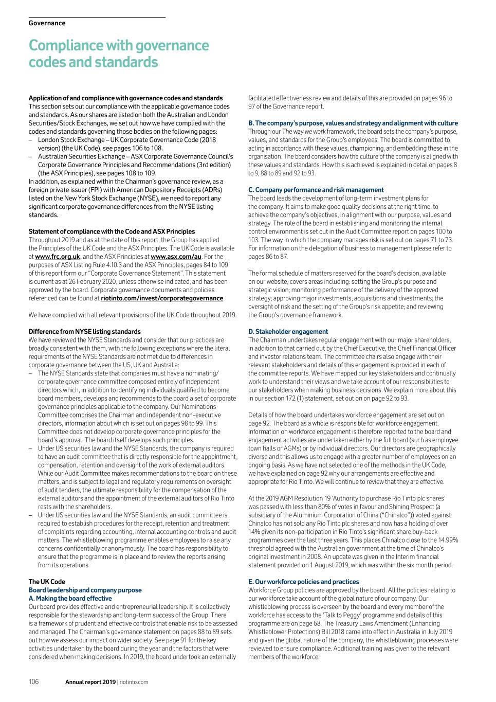 Governance Compliance with governance codes and standards Application of and compliance with governance codes and standards facilitated effectiveness review and details of this are provided on pages 96 to This section sets out our compliance with the applicable governance codes 97 of the Governance report. and standards. As our shares are listed on both the Australian and London Securities/Stock Exchanges, we set out how we have complied with the B. The company’s purpose, values and strategy and alignment with culture codes and standards governing those bodies on the following pages: Through our The way we work framework, the board sets the company’s purpose, –– London Stock Exchange – UK Corporate Governance Code (2018 values, and standards for the Group’s employees. The board is committed to version) (the UK Code), see pages 106 to 108. acting in accordance with these values, championing, and embedding these in the –– Australian Securities Exchange – ASX Corporate Governance Council’s organisation. The board considers how the culture of the company is aligned with Corporate Governance Principles and Recommendations (3rd edition) these values and standards. How this is achieved is explained in detail on pages 8 (the ASX Principles), see pages 108 to 109. to 9, 88 to 89 and 92 to 93. In addition, as explained within the Chairman’s governance review, as a foreign private issuer (FPI) with American Depository Receipts (ADRs) C. Company performance and risk management listed on the New York Stock Exchange (NYSE), we need to report any The board leads the development of long-term investment plans for significant corporate governance differences from the NYSE listing the company. It aims to make good quality decisions at the right time, to standards. achieve the company’s objectives, in alignment with our purpose, values and strategy. The role of the board in establishing and monitoring the internal Statement of compliance with the Code and ASX Principles control environment is set out in the Audit Committee report on pages 100 to Throughout 2019 and as at the date of this report, the Group has applied 103. The way in which the company manages risk is set out on pages 71 to 73. the Principles of the UK Code and the ASX Principles. The UK Code is available For information on the delegation of business to management please refer to at www.frc.org.uk, and the ASX Principles at www.asx.com/au. For the pages 86 to 87. purposes of ASX Listing Rule 4.10.3 and the ASX Principles, pages 84 to 109 of this report form our “Corporate Governance Statement”. This statement The formal schedule of matters reserved for the board’s decision, available is current as at 26 February 2020, unless otherwise indicated, and has been on our website, covers areas including: setting the Group’s purpose and approved by the board. Corporate governance documents and policies strategic vision; monitoring performance of the delivery of the approved referenced can be found at riotinto.com/invest/corporategovernance. strategy; approving major investments, acquisitions and divestments; the oversight of risk and the setting of the Group’s risk appetite; and reviewing We have complied with all relevant provisions of the UK Code throughout 2019. the Group’s governance framework. Difference from NYSE listing standards D. Stakeholder engagement We have reviewed the NYSE Standards and consider that our practices are The Chairman undertakes regular engagement with our major shareholders, broadly consistent with them, with the following exceptions where the literal in addition to that carried out by the Chief Executive, the Chief Financial Officer requirements of the NYSE Standards are not met due to differences in and investor relations team. The committee chairs also engage with their corporate governance between the US, UK and Australia: relevant stakeholders and details of this engagement is provided in each of –– The NYSE Standards state that companies must have a nominating/ the committee reports. We have mapped our key stakeholders and continually corporate governance committee composed entirely of independent work to understand their views and we take account of our responsibilities to directors which, in addition to identifying individuals qualified to become our stakeholders when making business decisions. We explain more about this board members, develops and recommends to the board a set of corporate in our section 172 (1) statement, set out on on page 92 to 93. governance principles applicable to the company. Our Nominations Committee comprises the Chairman and independent non-executive Details of how the board undertakes workforce engagement are set out on directors, information about which is set out on pages 98 to 99. This page 92. The board as a whole is responsible for workforce engagement. Committee does not develop corporate governance principles for the Information on workforce engagement is therefore reported to the board and board’s approval. The board itself develops such principles. engagement activities are undertaken either by the full board (such as employee –– Under US securities law and the NYSE Standards, the company is required town halls or AGMs) or by individual directors. Our directors are geographically to have an audit committee that is directly responsible for the appointment, diverse and this allows us to engage with a greater number of employees on an compensation, retention and oversight of the work of external auditors. ongoing basis. As we have not selected one of the methods in the UK Code, While our Audit Committee makes recommendations to the board on these we have explained on page 92 why our arrangements are effective and matters, and is subject to legal and regulatory requirements on oversight appropriate for Rio Tinto. We will continue to review that they are effective. of audit tenders, the ultimate responsibility for the compensation of th