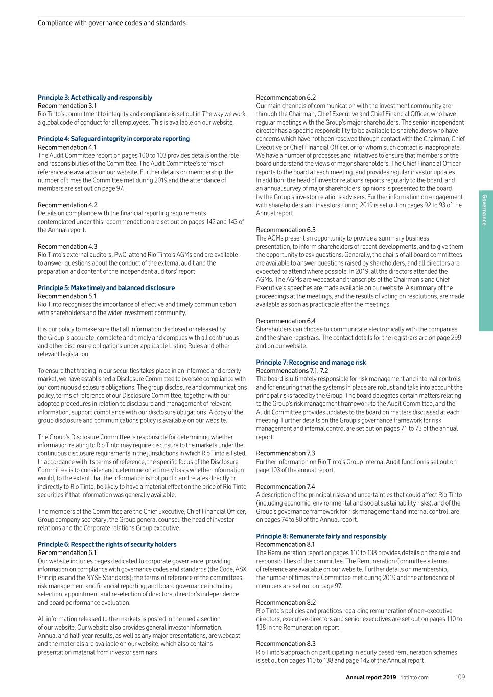 Compliance with governance codes and standards Principle 3: Act ethically and responsibly Recommendation 6.2 Recommendation 3.1 Our main channels of communication with the investment community are Rio Tinto’s commitment to integrity and compliance is set out in The way we work, through the Chairman, Chief Executive and Chief Financial Officer, who have a global code of conduct for all employees. This is available on our website. regular meetings with the Group’s major shareholders. The senior independent director has a specific responsibility to be available to shareholders who have Principle 4: Safeguard integrity in corporate reporting concerns which have not been resolved through contact with the Chairman, Chief Recommendation 4.1 Executive or Chief Financial Officer, or for whom such contact is inappropriate. The Audit Committee report on pages 100 to 103 provides details on the role We have a number of processes and initiatives to ensure that members of the and responsibilities of the Committee. The Audit Committee’s terms of board understand the views of major shareholders. The Chief Financial Officer reference are available on our website. Further details on membership, the reports to the board at each meeting, and provides regular investor updates. number of times the Committee met during 2019 and the attendance of In addition, the head of investor relations reports regularly to the board, and members are set out on page 97. an annual survey of major shareholders’ opinions is presented to the board by the Group’s investor relations advisers. Further information on engagement Governance Recommendation 4.2 with shareholders and investors during 2019 is set out on pages 92 to 93 of the Details on compliance with the financial reporting requirements Annual report. contemplated under this recommendation are set out on pages 142 and 143 of the Annual report. Recommendation 6.3 The AGMs present an opportunity to provide a summary business Recommendation 4.3 presentation, to inform shareholders of recent developments, and to give them Rio Tinto’s external auditors, PwC, attend Rio Tinto’s AGMs and are available the opportunity to ask questions. Generally, the chairs of all board committees to answer questions about the conduct of the external audit and the are available to answer questions raised by shareholders, and all directors are preparation and content of the independent auditors’ report. expected to attend where possible. In 2019, all the directors attended the AGMs. The AGMs are webcast and transcripts of the Chairman’s and Chief Principle 5: Make timely and balanced disclosure Executive’s speeches are made available on our website. A summary of the Recommendation 5.1 proceedings at the meetings, and the results of voting on resolutions, are made Rio Tinto recognises the importance of effective and timely communication available as soon as practicable after the meetings. with shareholders and the wider investment community.