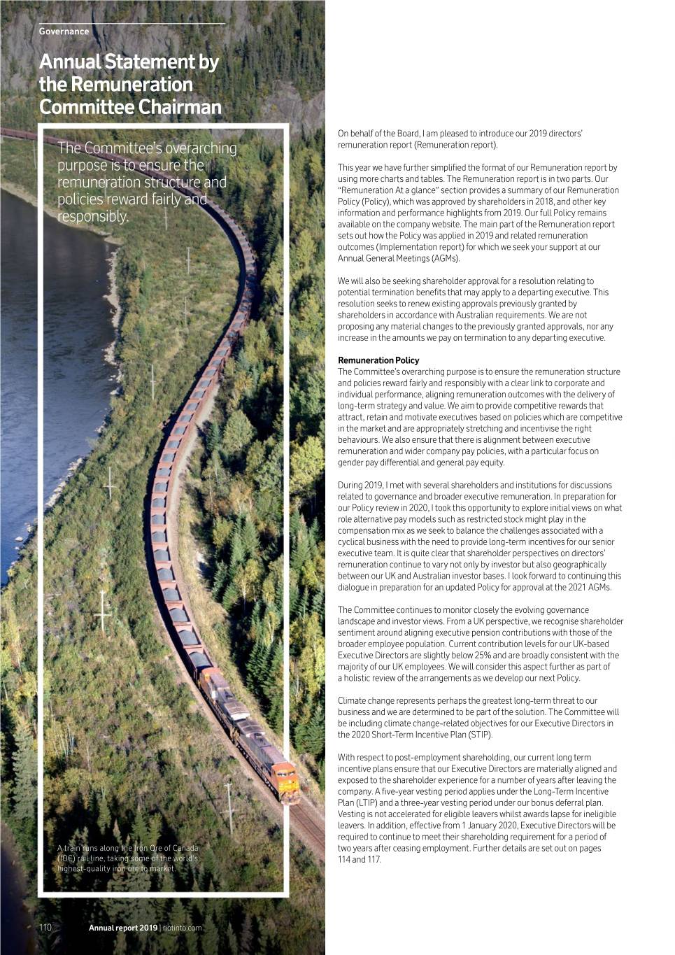 Governance Annual Statement by the Remuneration Committee Chairman On behalf of the Board, I am pleased to introduce our 2019 directors’ The Committee’s overarching remuneration report (Remuneration report). purpose is to ensure the This year we have further simplified the format of our Remuneration report by using more charts and tables. The Remuneration report is in two parts. Our remuneration structure and “Remuneration At a glance” section provides a summary of our Remuneration policies reward fairly and Policy (Policy), which was approved by shareholders in 2018, and other key information and performance highlights from 2019. Our full Policy remains responsibly. available on the company website. The main part of the Remuneration report sets out how the Policy was applied in 2019 and related remuneration outcomes (Implementation report) for which we seek your support at our Annual General Meetings (AGMs). We will also be seeking shareholder approval for a resolution relating to potential termination benefits that may apply to a departing executive. This resolution seeks to renew existing approvals previously granted by shareholders in accordance with Australian requirements. We are not proposing any material changes to the previously granted approvals, nor any increase in the amounts we pay on termination to any departing executive. Remuneration Policy The Committee’s overarching purpose is to ensure the remuneration structure and policies reward fairly and responsibly with a clear link to corporate and individual performance, aligning remuneration outcomes with the delivery of long-term strategy and value. We aim to provide competitive rewards that attract, retain and motivate executives based on policies which are competitive in the market and are appropriately stretching and incentivise the right behaviours. We also ensure that there is alignment between executive remuneration and wider company pay policies, with a particular focus on gender pay differential and general pay equity. During 2019, I met with several shareholders and institutions for discussions related to governance and broader executive remuneration. In preparation for our Policy review in 2020, I took this opportunity to explore initial views on what role alternative pay models such as restricted stock might play in the compensation mix as we seek to balance the challenges associated with a cyclical business with the need to provide long-term incentives for our senior executive team. It is quite clear that shareholder perspectives on directors’ remuneration continue to vary not only by investor but also geographically between our UK and Australian investor bases. I look forward to continuing this dialogue in preparation for an updated Policy for approval at the 2021 AGMs. The Committee continues to monitor closely the evolving governance landscape and investor views. From a UK perspective, we recognise shareholder sentiment around aligning executive pension contributions with those of the broader employee population. Current contribution levels for our UK-based Executive Directors are slightly below 25% and are broadly consistent with the majority of our UK employees. We will consider this aspect further as part of a holistic review of the arrangements as we develop our next Policy. Climate change represents perhaps the greatest long-term threat to our business and we are determined to be part of the solution. The Committee will be including climate change-related objectives for our Executive Directors in the 2020 Short-Term Incentive Plan (STIP). With respect to post-employment shareholding, our current long term incentive plans ensure that our Executive Directors are materially aligned and exposed to the shareholder experience for a number of years after leaving the company. A five-year vesting period applies under the Long-Term Incentive Plan (LTIP) and a three-year vesting period under our bonus deferral plan. Vesting is not accelerated for eligible leavers whilst awards lapse for ineligible leavers. In addition, effective from 1 January 2020, Executive Directors will be required to continue to meet their shareholding requirement for a period of A train runs along the Iron Ore of Canada two years after ceasing employment. Further details are set out on pages (IOC) rail line, taking some of the world’s 114 and 117. highest-quality iron ore to market. 110 Annual report 2019 | riotinto.com
