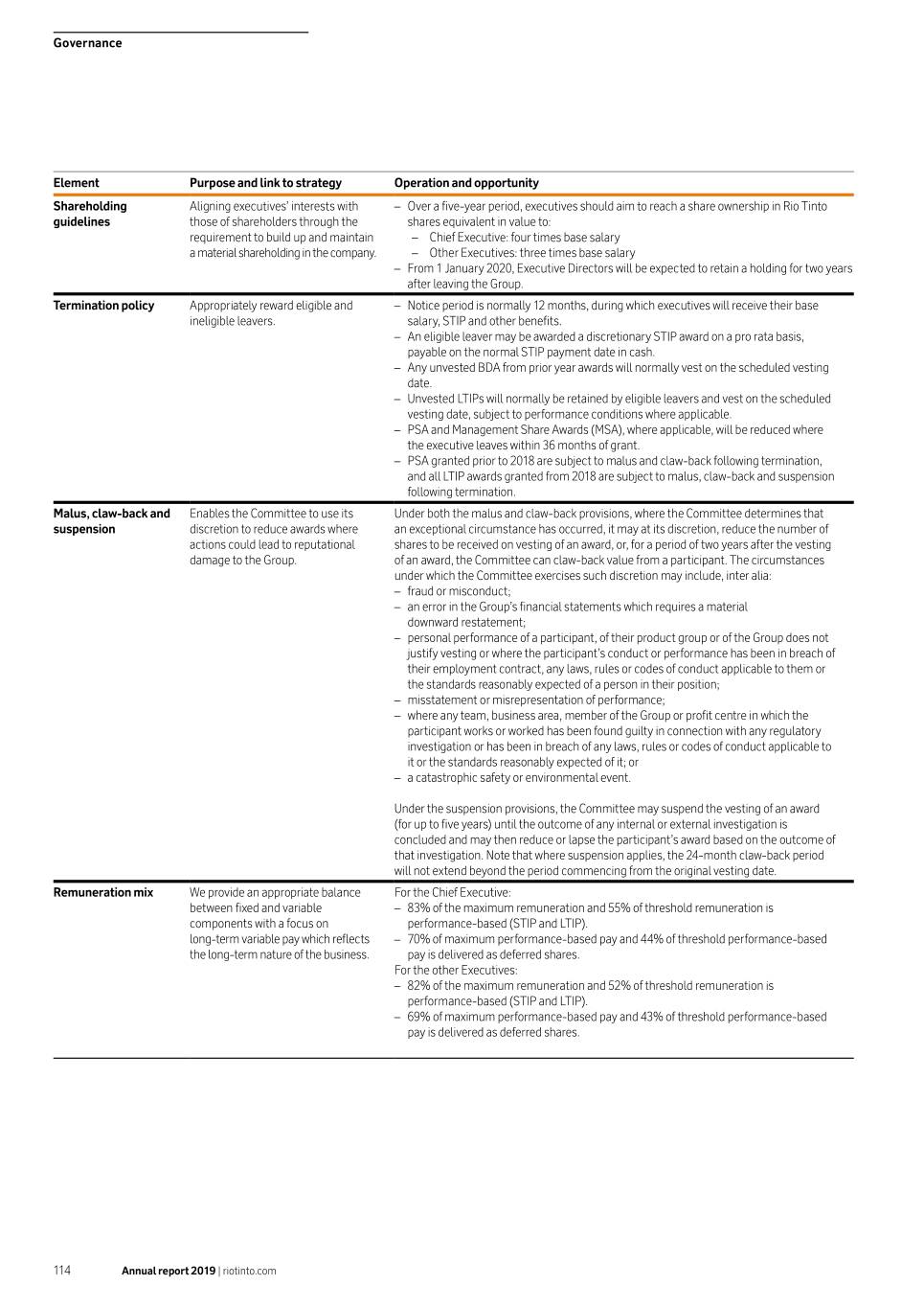 Governance Element Purpose and link to strategy Operation and opportunity Shareholding Aligning executives’ interests with –– Over a five-year period, executives should aim to reach a share ownership in Rio Tinto guidelines those of shareholders through the shares equivalent in value to: requirement to build up and maintain –– Chief Executive: four times base salary a material shareholding in the company. –– Other Executives: three times base salary –– From 1 January 2020, Executive Directors will be expected to retain a holding for two years after leaving the Group. Termination policy Appropriately reward eligible and –– Notice period is normally 12 months, during which executives will receive their base ineligible leavers. salary, STIP and other benefits. –– An eligible leaver may be awarded a discretionary STIP award on a pro rata basis, payable on the normal STIP payment date in cash. –– Any unvested BDA from prior year awards will normally vest on the scheduled vesting date. –– Unvested LTIPs will normally be retained by eligible leavers and vest on the scheduled vesting date, subject to performance conditions where applicable. –– PSA and Management Share Awards (MSA), where applicable, will be reduced where the executive leaves within 36 months of grant. –– PSA granted prior to 2018 are subject to malus and claw‑back following termination, and all LTIP awards granted from 2018 are subject to malus, claw‑back and suspension following termination. Malus, claw‑back and Enables the Committee to use its Under both the malus and claw‑back provisions, where the Committee determines that suspension discretion to reduce awards where an exceptional circumstance has occurred, it may at its discretion, reduce the number of actions could lead to reputational shares to be received on vesting of an award, or, for a period of two years after the vesting damage to the Group. of an award, the Committee can claw‑back value from a participant. The circumstances under which the Committee exercises such discretion may include, inter alia: –– fraud or misconduct; –– an error in the Group’s financial statements which requires a material downward restatement; –– personal performance of a participant, of their product group or of the Group does not justify vesting or where the participant’s conduct or performance has been in breach of their employment contract, any laws, rules or codes of conduct applicable to them or the standards reasonably expected of a person in their position; –– misstatement or misrepresentation of performance; –– where any team, business area, member of the Group or profit centre in which the participant works or worked has been found guilty in connection with any regulatory investigation or has been in breach of any laws, rules or codes of conduct applicable to it or the standards reasonably expected of it; or –– a catastrophic safety or environmental event. Under the suspension provisions, the Committee may suspend the vesting of an award (for up to five years) until the outcome of any internal or external investigation is concluded and may then reduce or lapse the participant’s award based on the outcome of that investigation. Note that where suspension applies, the 24-month claw‑back period will not extend beyond the period commencing from the original vesting date. Remuneration mix We provide an appropriate balance For the Chief Executive: between fixed and variable –– 83% of the maximum remuneration and 55% of threshold remuneration is components with a focus on performance-based (STIP and LTIP). long-term variable pay which reflects –– 70% of maximum performance-based pay and 44% of threshold performance-based the long-term nature of the business. pay is delivered as deferred shares. For the other Executives: –– 82% of the maximum remuneration and 52% of threshold remuneration is performance-based (STIP and LTIP). –– 69% of maximum performance-based pay and 43% of threshold performance-based pay is delivered as deferred shares. 114 Annual report 2019 | riotinto.com