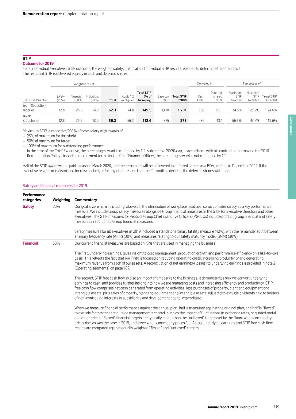 Remuneration report / Implementation report STIP Outcome for 2019 For an individual executive’s STIP outcome, the weighted safety, financial and individual STIP result are added to determine the total result. The resultant STIP is delivered equally in cash and deferred shares. Weighted result Delivered in: Percentage of: Total STIP Deferred Maximum Maximum Safety Financial Individual Apply 1.2 (% of Base pay Total STIP Cash shares STIP STIP Target STIP Executive Director (20%) (50%) (30%) Total multiplier base pay) £’000 £’000 £’000 £’000 awarded forfeited awarded Jean-Sébastien Jacques 12.8 25.5 24.0 62.3 74.8 149.5 1,138 1,701 850 851 74.8% 25.2% 124.6% Jakob Governance Stausholm 12.8 25.5 18.0 56.3 56.3 112.6 775 873 436 437 56.3% 43.7% 112.6% Maximum STIP is capped at 200% of base salary with awards of: –– 25% of maximum for threshold –– 50% of maximum for target –– 100% of maximum for outstanding performance –– In the case of the Chief Executive, the percentage award is multiplied by 1.2, subject to a 200% cap, in accordance with his contractual terms and the 2018 Remuneration Policy. Under the recruitment terms for the Chief Financial Officer, the percentage award is not multiplied by 1.2. Half of the STIP award will be paid in cash in March 2020, and the remainder will be delievered in deferred shares as a BDA, vesting in December 2022. If the executive resigns or is dismissed for misconduct, or for any other reason that the Committee decides, the deferred shares will lapse. Safety and financial measures for 2019 Performance categories Weighting Commentary Safety 20% Our goal is zero harm, including, above all, the elimination of workplace fatalities, so we consider safety as a key performance measure. We include Group safety measures alongside Group financial measures in the STIP for Executive Directors and other executives. The STIP measures for Product Group Chief Executive Officers (PGCEOs) include product group financial and safety measures in addition to Group financial measures. Safety measures for all executives in 2019 included a standalone binary fatality measure (40%), with the remainder split between all injury frequency rate (AIFR) (30%) and measures relating to our safety maturity model (SMM) (30%). Financial 50% Our current financial measures are based on KPIs that are used in managing the business. The first, underlying earnings, gives insight to cost management, production growth and performance efficiency on a like-for-like basis. This reflects the fact that Rio Tinto is focused on reducing operating costs, increasing productivity and generating maximum revenue from each of our assets. A reconciliation of net earnings/(losses) to underlying earnings is provided in note 2 (Operating segments) on page 167. The second, STIP free cash flow, is also an important measure to the business. It demonstrates how we convert underlying earnings to cash, and provides further insight into how we are managing costs and increasing efficiency and productivity. STIP free cash flow comprises net cash generated from operating activities, less purchases of property, plant and equipment and intangible assets, plus sales of property, plant and equipment and intangible assets, adjusted to exclude dividends paid to holders of non-controlling interests in subsidiaries and development capital expenditure. When we measure financial performance against the annual plan, half is measured against the original plan, and half is “flexed” to exclude factors that are outside management’s control, such as the impact of fluctuations in exchange rates, or quoted metal and other prices. “Flexed” financial targets are typically higher than the “unflexed” targets set by the Board when commodity prices rise, as was the case in 2019, and lower when commodity prices fall. Actual underlying earnings and STIP free cash flow results are compared against equally weighted “flexed” and “unflexed” targets. Annual report 2019 | riotinto.com 119
