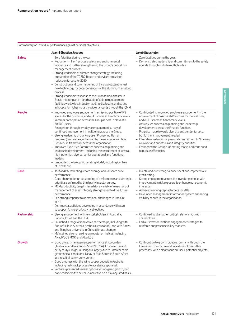 Remuneration report / Implementation report Commentary on individual performance against personal objectives. Jean-Sébastien Jacques Jakob Stausholm Safety –– Zero fatalities during the year. –– Zero fatalities during the year. –– Reduction in Tier 1 process safety and environmental –– Demonstrated leadership and commitment to the safety incidents and further strengthening the Group’s critical risk agenda through visits to multiple sites. management process. –– Strong leadership of climate change strategy, including preparation of the TCFD2 Report and revised emissions- reduction targets for 2030. –– Construction and commissioning of Elysis pilot plant to test new technology for decarbonisation of the aluminium smelting Governance process. –– Strong leadership response to the Brumadinho disaster in Brazil, initiating an in-depth audit of tailing management facilities worldwide, industry-leading disclosure, and strong advocacy for higher industry-wide standards through the ICMM. People –– Improved employee engagement, achieving positive eNPS –– Contributed to improved employee engagement in the scores for the first time, and eSAT scores at benchmark levels. achievement of positive eNPS scores for the first time, Yammer participation across the Group is best in class at > and eSAT scores at benchmark levels. 30,000 users. –– Actively led succession planning and leadership –– Recognition through employee engagement survey of development across the Finance function. continued improvement in wellbeing across the Group. –– Progress made towards diversity and gender targets, –– Strong leadership of our Purpose (‘Pioneering Human but further improvement needed. Progress’) and values, enhanced by the roll-out of a critical –– Clear demonstration of personal commitment to ‘The way Behaviours framework across the organisation. we work’ and our ethics and integrity priorities. –– Improved Executive Committee succession planning and –– Embedded the Group’s Operating Model and continued leadership development, including the recruitment of several to pursue efficencies. high-potential, diverse, senior operational and functional leaders. –– Embedded the Group’s Operating Model, including Centres of Excellence. Cash –– TSR of 41%, reflecting record average annual share price –– Maintained our strong balance sheet and improved our performance. credit rating. –– Good shareholder understanding of performance and strategic –– Strong engagement across the investor portfolio, with priorities confirmed by third party investor survey. improvement in risk exposure to enhance our economic –– M2M productivity target missed (for a variety of reasons), but interests. management of asset integrity strengthened to drive future –– Achieved working capital targets for 2019. performance. –– Developed management information system enhancing –– Led strong response to operational challenges in Iron Ore visibility of data in the organisation. in H1. –– Commercial activities developing in accordance with plan to support future productivity objectives. Partnership –– Strong engagement with key stakeholders in Australia, –– Continued to strengthen critical relationships with Canada, China and the USA. shareholders. –– Launched a range of innovative partnerships, including with –– Led our investor relations engagement strategies to FutureSkills in Australia (technical education), and with Baowu reinforce our presence in key markets. and Tsinghua University in China (climate change). –– Maintained strong ranking on reputation indices, including Alva, IPSOS MORI and Alva ESG. Growth –– Good project management performance at Koodaideri –– Contribution to growth pipeline, primarily through the (Australia) and Resolution Shaft 9 (USA). Cost overrun and Evaluation Committee and Investment Committee delay at Oyu Tolgoi in Mongolia largely due to unforeseeable processes, with a clear focus on Tier 1 potential projects. geotechnical conditions. Delay at Zulti South in South Africa as a result of community unrest. –– Good progress with the Winu copper deposit in Australia, including fast-track process to accelerate appraisal. –– Ventures presented several options for inorganic growth, but none considered to be value-accretive on a risk-adjusted basis. Annual report 2019 | riotinto.com 121