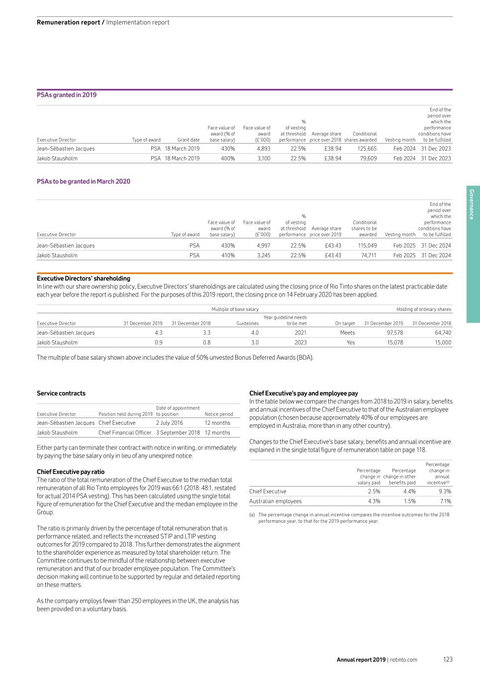 Remuneration report / Implementation report PSAs granted in 2019 End of the period over % which the Face value of Face value of of vesting performance award (% of award at threshold Average share Conditional conditions have Executive Director Type of award Grant date base salary) (£’000) performance price over 2018 shares awarded Vesting month to be fulfilled Jean-Sébastien Jacques PSA 18 March 2019 430% 4,893 22.5% £38.94 125,665 Feb 2024 31 Dec 2023 Jakob Stausholm PSA 18 March 2019 400% 3,100 22.5% £38.94 79,609 Feb 2024 31 Dec 2023 PSAs to be granted in March 2020 Governance End of the period over % which the Face value of Face value of of vesting Conditional performance award (% of award at threshold Average share shares to be conditions have Executive Director Type of award base salary) (£’000) performance price over 2019 awarded Vesting month to be fulfilled Jean-Sébastien Jacques PSA 430% 4,997 22.5% £43.43 115,049 Feb 2025 31 Dec 2024 Jakob Stausholm PSA 410% 3,245 22.5% £43.43 74,711 Feb 2025 31 Dec 2024 Executive Directors’ shareholding In line with our share ownership policy, Executive Directors’ shareholdings are calculated using the closing price of Rio Tinto shares on the latest practicable date each year before the report is published. For the purposes of this 2019 report, the closing price on 14 February 2020 has been applied. Multiple of base salary Holding of ordinary shares Year guideline needs Executive Director 31 December 2019 31 December 2018 Guidelines to be met On target 31 December 2019 31 December 2018 Jean-Sébastien Jacques 4.3 3.3 4.0 2021 Meets 97,578 64,740 Jakob Stausholm 0.9 0.8 3.0 2023 Yes 15,078 15,000 The multiple of base salary shown above includes the value of 50% unvested Bonus Deferred Awards (BDA). Service contracts Chief Executive’s pay and employee pay In the table below we compare the changes from 2018 to 2019 in salary, benefits Date of appointment and annual incentives of the Chief Executive to that of the Australian employee Executive Director Position held during 2019 to position Notice period population (chosen because approximately 40% of our employees are Jean-Sébastien Jacques Chief Executive 2 July 2016 12 months employed in Australia, more than in any other country). Jakob Stausholm Chief Financial Officer 3 September 2018 12 months Changes to the Chief Executive’s base salary, benefits and annual incentive are Either party can terminate their contract with notice in writing, or immediately explained in the single total figure of remuneration table on page 118. by paying the base salary only in lieu of any unexpired notice. Percentage Chief Executive pay ratio Percentage Percentage change in change in change in other annual The ratio of the total remuneration of the Chief Executive to the median total salary paid benefits paid incentive(a) remuneration of all Rio Tinto employees for 2019 was 66:1 (2018: 48:1, restated Chief Executive 2.5% 4.4% 9.3% for actual 2014 PSA vesting). This has been calculated using the single total figure of remuneration for the Chief Executive and the median employee in the Australian employees 4.3% 1.5% 7.1% Group. (a) The percentage change in annual incentive compares the incentive outcomes for the 2018 performance year, to that for the 2019 performance year. The ratio is primarily driven by the percentage of total remuneration that is performance related, and reflects the increased STIP and LTIP vesting outcomes for 2019 compared to 2018. This further demonstrates the alignment to the shareholder experience as measured by total shareholder return. The Committee continues to be mindful of the relationship between executive remuneration and that of our broader employee population. The Committee’s decision making will continue to be supported by regular and detailed reporting on these matters. As the company employs fewer than 250 employees in the UK, the analysis has been provided on a voluntary basis. Annual report 2019 | riotinto.com 123