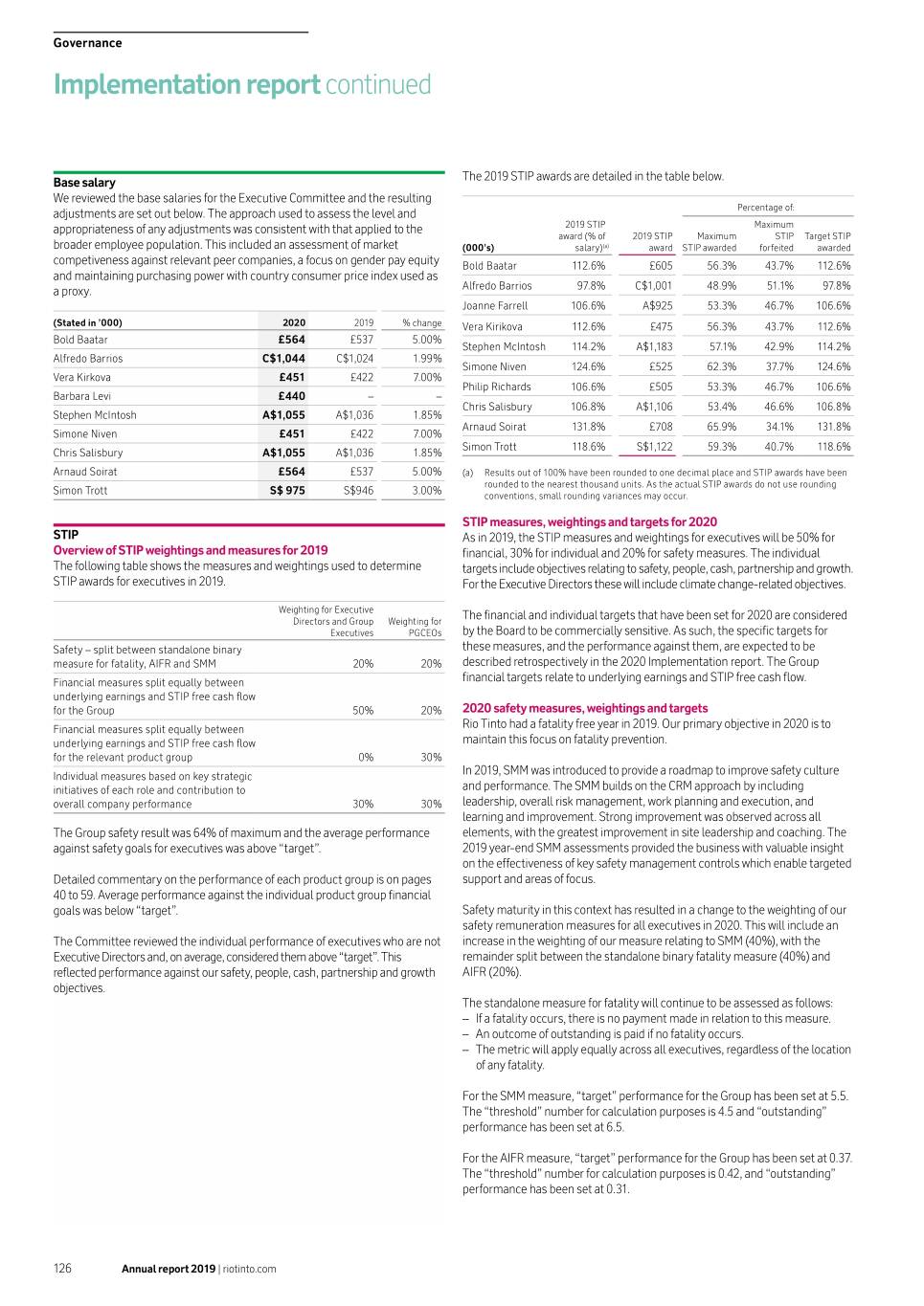 Governance Implementation report continued Actual performance Calculation of total STIP award The following tables summarise the calculation of STIP award for the Executive Directors. Below threshold (25% relative performance) payout is zero on the Group safety and financial measures. Group safety measures Weight Result (out of (% of Weighted 100%) 2019 performance maximum) result Commentary Maximum In 2019 there were zero fatalities across the Group. �c��a� � Performance against the binary fatality measure was therefore Binary fatality 8.0 ���im�m � 100.0 8.0 maximum for all executives. Threshold Target Maximum AIFR target performance was set at 0.38 with threshold at 0.42 and maximum at 0.30. In line with normal procedures, the Committee All injury frequency rate ���� sought guidance from the Sustainability Committee on safety (AIFR) 6.0 �.�� 25.0 1.5 performance for 2019. Injury rates as measured by AIFR remained similar to 2018, with the AIFR in 2019 at 0.42, compared to 0.44 in 2018. Safety maturity model ��� (SMM) 6.0 ��r��t��.� 55.0 3.3 In 2019 the SMM framework was introduced to include a more holistic inclusion of our safety management system. Target performance was set at 4.4 with threshold at 3.4 and maximum at 5.7. All sites showed strong improvement over their baseline assessments, particularly in leadership and engagement. We saw an improvement across the Group to an average maturity of 4.5 (evolving) from a baseline of 3.4 Total group safety 20.0 64.0 12.8 (basic). See page 63 for more detail on the measurement of SMM. Group financial measures Weight Result (out of (% of Weighted 100%) 2019 performance ($bn) maximum) result Commentary on financial measures Threshold Target Maximum The “flexed” earnings and “flexed” cash flow results were below target, and the “unflexed” earnings and “unflexed” cash flow results were between target and outstanding. This resulted in an overall ���� adjusted financial outcome of 51% of maximum compared to the Underlying earnings 12.5 �.� 78.0 9.8 unadjusted financial outcome of 42% of maximum. The performance targets for financial measures are disclosed on page 115. The most significant adjustments related to the early cancellation of Underlying earnings – ���� a power purchase agreement at Escondida, which was replaced with flexed 12.5 ��.� 33.0 4.0 a lower cost and carbon footprint energy source, and an increase in remediation provisions for water management at Kennecott in the US. During the year, iron ore shipments were impacted by several tropical cyclones across northern Western Australia which significantly exceeded prior experience and 2019 plan assumptions. Using the ���� standard methodology for calculating the weather adjustment (which STIP free cash flow 12.5 ��.� 70.0 8.8 has in the past resulted in both upward and downward adjustments), the outcome would have been 56%. The Committee agreed that the impact of these weather events could not have been further mitigated in 2019. Nevertheless, in view of the rising frequency of STIP free cash flow – ���� extreme weather events and the need to increase resilience to flexed 12.5 ��.� 25.0 3.0 climate change, the Committee exercised downward discretion, reducing the post-adjustment outcome to 51%. The Committee considers the final adjusted result to reflect the appropriate balance between underlying business performance, a strong market for key commodities and recognition of events Total group financial 50.0 51.0 25.5 outside of management’s control. Individual objectives Result Weight (out (% of Weighted of 100%) maximum) result Commentary Jean-Sébastien Jacques 30.0 80.0 24.0 Refer to page 121. Jakob Stausholm 30.0 60.0 18.0 Refer to page 121. 120 Annual report 2019 | riotinto.com