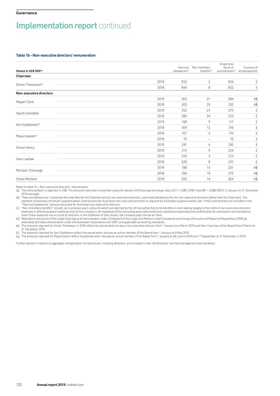 Governance Implementation report continued Table 1b – Non-executive directors’ remuneration Single total Fees and Non-monetary figure of Currency of Stated in US$‘000(a) allowances(b) benefits(c) remuneration(d) actual payment Chairman 2019 932 2 934 £ Simon Thompson(e) 2018 844 8 852 £ Non-executive directors 2019 263 21 284 A$ Megan Clark 2018 303 29 332 A$ 2019 252 23 275 £ David Constable 2018 289 34 323 £ 2019 108 9 117 £ Ann Godbehere(f) 2018 304 12 316 £ 2019 107 3 110 £ Moya Greene(g) 2018 70 – 70 £ 2019 241 4 245 £ Simon Henry 2018 215 9 224 £ 2019 270 3 273 £ Sam Laidlaw 2018 229 8 237 £ 2019 188 13 201 A$ Michael L’Estrange 2018 256 19 275 A$ Simon McKeon 2019 250 14 264 A$ Notes to table 1b – Non-executive directors’ remuneration (a) The remuneration is reported in US$. The amounts have been converted using the relevant 2019 average exchange rates of £1 = US$1.27661 and A$1 = US$0.69531 (1 January to 31 December 2019 average). (b) “Fees and allowances” comprises the total fees for the Chairman and all non-executive directors, and travel allowances for the non-executive directors (other than the Chairman). The payment of statutory minimum superannuation contributions for Australian non-executive directors is required by Australian superannuation law. These contributions are included in the “Fees and allowances” amount disclosed for Australian non-executive directors. (c) “Non-monetary benefits” include, as in previous years, amounts which are deemed by the UK tax authorities to be benefits in kind relating largely to the costs of non-executive directors’ expenses in attending board meetings held at the company’s UK registered office (including associated hotel and subsistence expenses) and professional tax compliance services/advice. Given these expenses are incurred by directors in the fulfilment of their duties, the company pays the tax on them. (d) Represents disclosure of the single total figure of remuneration under Schedule 8 of the Large and Medium-sized Companies and Groups (Accounts and Reports) Regulations 2008 (as amended) and total remuneration under the Australian Corporations Act 2001 and applicable accounting standards. (e) The amounts reported for Simon Thompson in 2018 reflect the period when he was a non-executive director from 1 January to 4 March 2018 and then Chairman of the Board from 5 March to 31 December 2018. (f) The amounts reported for Ann Godbehere reflect the period when she was an active member of the Board from 1 January to 9 May 2019. (g) The amounts reported for Moya Greene reflect the periods when she was an active member of the Board from 1 January to 26 June in 2019 and 17 September to 31 December in 2018. Further details in relation to aggregate compensation for executives, including directors, are included in note 38 (Directors’ and key management remuneration). 132 Annual report 2019 | riotinto.com