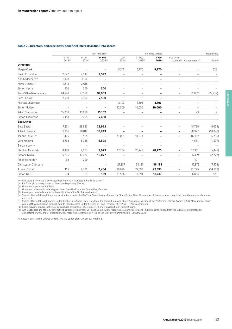 Remuneration report / Implementation report Table 2 – Directors’ and executives’ beneficial interests in Rio Tinto shares Rio Tinto plc(a) Rio Tinto Limited Movements 1 Jan 31 Dec 14 Feb 1 Jan 31 Dec 14 Feb Exercise of 2019(b) 2019(c) 2020(d) 2019(b) 2019(c) 2020(d) options(e) Compensation(f) Other(g) Directors Megan Clark – – – 5,245 5,770 5,770 – – 525 David Constable 2,547 2,547 2,547 – – – – – – Ann Godbehere (h) 3,100 3,100 – – – – – – – Moya Greene (h) 2,618 2,618 – – – – – – – Simon Henry 500 500 500 – – – – – – Governance Jean-Sébastien Jacques 64,740 97,578 97,603 – – – – 62,082 (29,219) Sam Laidlaw 7,500 7,500 7,500 – – – – – – Michael L'Estrange – – – 3,103 3,103 3,103 – – – Simon McKeon – – – 10,000 10,000 10,000 – – – Jakob Stausholm 15,000 15,078 15,102 – – – – 93 9 Simon Thompson 7,458 7,458 7,458 – – – – – – Executives Bold Baatar 17,231 28,920 28,952 – – – – 15,725 (4,004) Alfredo Barrios 17,906 38,812 38,843 – – – – 38,977 (18,040) Joanne Farrell (h) 3,175 3,528 – 41,001 50,234 – – 16,382 (6,796) Vera Kirikova 3,768 6,788 6,825 – – – – 4,564 (1,507) Barbara Levi (h) – – – – – – – – Stephen McIntosh 8,478 2,673 2,673 17,784 28,748 28,775 – 17,331 (12,145) Simone Niven 5,895 10,077 10,077 – – – – 6,459 (2,277) Philip Richards (h) 68 200 – – – – – 121 11 Christopher Salisbury – – – 27,837 38,188 38,188 – 17,873 (7,522) Arnaud Soirat 155 2,380 2,404 20,626 27,393 27,393 – 23,225 (14,209) Simon Trott 74 169 169 11,536 18,391 18,417 – 6,853 123 Notes to table 2 – Directors’ and executives’ beneficial interests in Rio Tinto shares (a) Rio Tinto plc ordinary shares or American Depositary Shares. (b) Or date of appointment, if later. (c) Or date of retirement / date stepped down from the Executive Committee, if earlier. (d) Latest practicable date prior to the publication of the 2019 Annual report. (e) Shares obtained through the exercise of options under the Rio Tinto Share Savings Plan or the Share Option Plan. The number of shares retained may differ from the number of options exercised. (f) Shares obtained through awards under the Rio Tinto Share Ownership Plan, the Global Employee Share Plan and/or vesting of the Performance Share Awards (PSA), Management Share Awards (MSA) and Bonus Deferral Awards (BDA) granted under the Group’s Long Term Incentive Plan (LTIP) arrangements. (g) Share movements due to the sale or purchase of shares, or shares received under dividend reinvestment plans. (h) Ann Godbehere and Moya Greene retired as directors on 9 May 2019 and 26 June 2019 respectively. Joanne Farrell and Philip Richards retired from the Executive Committee on 30 September 2019 and 31 December 2019 respectively. Barbara Levi joined the Executive Committee on 1 January 2020. Interests in outstanding awards under LTIPs and option plans are set out in table 3. Annual report 2019 | riotinto.com 133