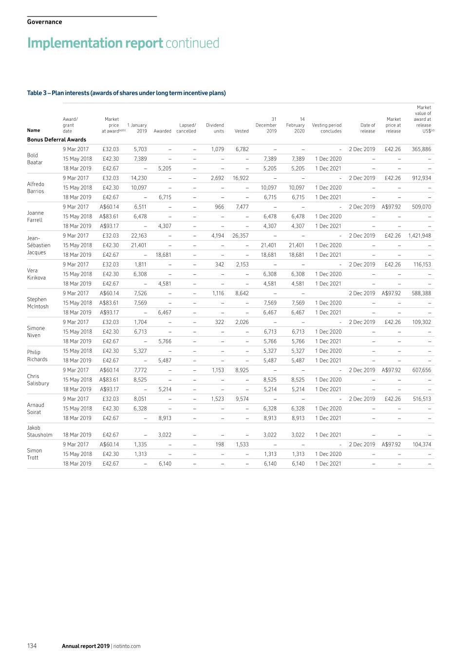 Remuneration report / Implementation report For awards granted from 2013 to 2017, one-third of the award is subject to an EBIT margin condition measuring the change in the EBIT margin of Rio Tinto and each of the comparator companies (measured on a “point-to-point” basis using the last financial year in the performance period and the financial year prior to the start of the performance period). This will be calculated using independent third-party data. Vesting will be subject to Rio Tinto’s interpolated ranking position using the following schedule. –– Equal to or greater than 2nd ranked company –– 100% award vests –– Between the 5th and 2nd ranked companies –– Proportionate vesting between 22.5% and 100% vesting –– Above the 6th ranked company –– 22.5% award vests –– Equal to the 6th ranked company or below –– Nil vesting The TSR performance condition (two thirds of the award) vests in February with the EBIT performance condition (one third of the award) vesting in May. Due to the phased vesting nature of the award, details of each vest are displayed separately side by side within the table. For awards granted from 2018 the EBIT performance condition will not apply. Instead the award is subject to the TSR measures described above, with each applied to 50% of the award Governance If vesting is achieved, participants will be entitled to receive a number of additional shares whose market value reflects the aggregate cash amount of dividends that would have been received had the number of shares which have vested at the end of the performance period been held throughout the period. (d) The amount in US dollars has been converted at the rate of US$1.27661 = £1 and US$0.69531 = A$1, being the average exchange rates for 2019. (e) For the Performance Share Awards granted on 23 March 2015 with a performance period that concluded on 31 December 2019, 45.56% of the award vested in relation to the TSR portion of the award. The remaining performance condition of relative EBIT margin will be assessed later in 2020. (f) The closing price at 31 December 2019 was £45.03 for Rio Tinto plc ordinary shares and was A$100.40 for Rio Tinto Limited ordinary shares. The high and low prices during 2019 of Rio Tinto plc and Rio Tinto Limited shares were £49.765 and £36.43 and A$107.05 and A$76.65 respectively. As of 14 February 2020, executives held 2,671,784 shares awarded and not vested under long term incentive plans. No executive held any options. Table 3a – Plan interests (award of shares under all-employee share arrangements) myShare Share Ownership Plan Total activity in 2019 Value of Value of Value of Value of Matching Matching Matching Matching Value of Free Value of Plan shares shares shares shares shares Free shares Plan interests interests at awarded in vested in awarded in vested in awarded in vested in Grants Vesting at 31 1 January year(b) year(c) year(b) year(c) year(d) year(d) in year in year December 2019(a) ('000) ('000) ('000) ('000) ('000) ('000) ('000) ('000) 2019(a) Bold Baatar 311.31 4 5 0 0 5 0 9 5 392.86 Alfredo Barrios 291.28 4 8 0 0 0 0 4 8 235.95 Joanne Farrell 278.66 4 9 0 0 0 0 4 9 219.03 Jean-Sébastien Jacques 664.70 2 4 2 4 5 9 9 17 520.29 Vera Kirikova 547.15 2 6 2 0 5 5 9 11 508.24 Stephen McIntosh 278.66 4 9 0 0 0 0 4 9 219.03 Simone Niven 363.00 0 0 0 0 5 9 5 9 286.00 Philip Richards 67.00 1 0 1 0 5 0 7 0 174.52 Chris Salisbury 0.00 0 0 0 0 0 0 0 0 0.00 Arnaud Soirat 148.00 1 0 1 0 5 0 7 0 250.96 Jakob Stausholm 0.00 1 0 1 0 1 0 3 0 60.09 Simon Trott 298.11 5 9 0 0 0 0 5 9 260.09 (a) All shares shown are Rio Tinto plc shares except in the cases of Joanne Farrell and Stephen McIntosh which are Rio Tinto Limited shares and Simon Trott who holds a combination of Rio Tinto plc and Rio Tinto Limited shares. (b) myShare and Share Ownership Plan Matching share awards are granted on a quarterly basis (January, April, July and October) throughout the year. (c) The vesting of a Matching share is dependent on continued employment with Rio Tinto and the retention of the associated Investment share purchased by the participant for 3 years. (d) Share Ownership Plan Free Shares vest after 3 years. (e) Share Ownership Plan awards shown above and the vested Matching shares under myShare are included, where relevant, in the Executive’s share interests in Table 2. (f) All currency figures are shown in USD and rounded. Annual report 2019 | riotinto.com 137