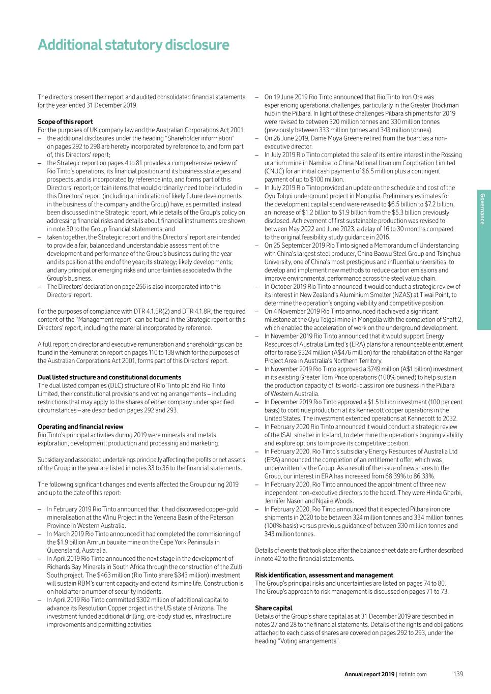 Additional statutory disclosure The directors present their report and audited consolidated financial statements –– On 19 June 2019 Rio Tinto announced that Rio Tinto Iron Ore was for the year ended 31 December 2019. experiencing operational challenges, particularly in the Greater Brockman hub in the Pilbara. In light of these challenges Pilbara shipments for 2019 Scope of this report were revised to between 320 million tonnes and 330 million tonnes For the purposes of UK company law and the Australian Corporations Act 2001: (previously between 333 million tonnes and 343 million tonnes). –– the additional disclosures under the heading “Shareholder information” –– On 26 June 2019, Dame Moya Greene retired from the board as a non- on pages 292 to 298 are hereby incorporated by reference to, and form part executive director. of, this Directors’ report; –– In July 2019 Rio Tinto completed the sale of its entire interest in the Rössing –– the Strategic report on pages 4 to 81 provides a comprehensive review of uranium mine in Namibia to China National Uranium Corporation Limited Rio Tinto’s operations, its financial position and its business strategies and (CNUC) for an initial cash payment of $6.5 million plus a contingent prospects, and is incorporated by reference into, and forms part of this payment of up to $100 million. Directors’ report; certain items that would ordinarily need to be included in –– In July 2019 Rio Tinto provided an update on the schedule and cost of the this Directors’ report (including an indication of likely future developments Oyu Tolgoi underground project in Mongolia. Preliminary estimates for Governance in the business of the company and the Group) have, as permitted, instead the development capital spend were revised to $6.5 billion to $7.2 billion, been discussed in the Strategic report, while details of the Group’s policy on an increase of $1.2 billion to $1.9 billion from the $5.3 billion previously addressing financial risks and details about financial instruments are shown disclosed. Achievement of first sustainable production was revised to in note 30 to the Group financial statements; and between May 2022 and June 2023, a delay of 16 to 30 months compared –– taken together, the Strategic report and this Directors’ report are intended to the original feasibility study guidance in 2016. to provide a fair, balanced and understandable assessment of: the –– On 25 September 2019 Rio Tinto signed a Memorandum of Understanding development and performance of the Group’s business during the year with China’s largest steel producer, China Baowu Steel Group and Tsinghua and its position at the end of the year; its strategy; likely developments; University, one of China’s most prestigious and influential universities, to and any principal or emerging risks and uncertainties associated with the develop and implement new methods to reduce carbon emissions and Group’s business. improve environmental performance across the steel value chain. –– The Directors’ declaration on page 256 is also incorporated into this –– In October 2019 Rio Tinto announced it would conduct a strategic review of Directors’ report. its interest in New Zealand’s Aluminium Smelter (NZAS) at Tiwai Point, to determine the operation’s ongoing viability and competitive position. For the purposes of compliance with DTR 4.1.5R(2) and DTR 4.1.8R, the required –– On 4 November 2019 Rio Tinto announced it achieved a significant content of the “Management report” can be found in the Strategic report or this milestone at the Oyu Tolgoi mine in Mongolia with the completion of Shaft 2, Directors’ report, including the material incorporated by reference. which enabled the acceleration of work on the underground development. –– In November 2019 Rio Tinto announced that it would support Energy A full report on director and executive remuneration and shareholdings can be Resources of Australia Limited’s (ERA) plans for a renounceable entitlement found in the Remuneration report on pages 110 to 138 which for the purposes of offer to raise $324 million (A$476 million) for the rehabilitation of the Ranger the Australian Corporations Act 2001, forms part of this Directors’ report. Project Area in Australia’s Northern Territory. –– In November 2019 Rio Tinto approved a $749 million (A$1 billion) investment Dual listed structure and constitutional documents in its existing Greater Tom Price operations (100% owned) to help sustain The dual listed companies (DLC) structure of Rio Tinto plc and Rio Tinto the production capacity of its world-class iron ore business in the Pilbara Limited, their constitutional provisions and voting arrangements – including of Western Australia. restrictions that may apply to the shares of either company under specified –– In December 2019 Rio Tinto approved a $1.5 billion investment (100 per cent circumstances – are described on pages 292 and 293. basis) to continue production at its Kennecott copper operations in the United States. The investment extended operations at Kennecott to 2032. Operating and financial review –– In February 2020 Rio Tinto announced it would conduct a strategic review Rio Tinto’s principal activities during 2019 were minerals and metals of the ISAL smelter in Iceland, to determine the operation’s ongoing viability exploration, development, production and processing and marketing. and explore options to improve its competitive position. –– In February 2020, Rio Tinto’s subsidiary Energy Resources of Australia Ltd Subsidiary and associated undertakings principally affecting the profits or net assets (ERA) announced the completion of an entitlement offer, which was of the Group in the year are listed in notes 33 to 36 to the financial statements. underwritten by the Group. As a result of the issue of new shares to the Group, our interest in ERA has in