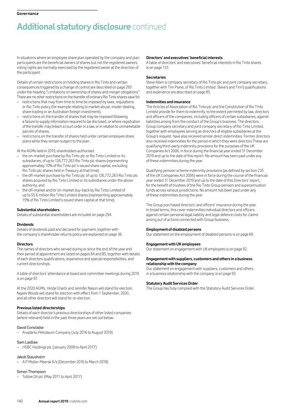 Governance Additional statutory disclosure continued In situations where an employee share plan operated by the company and plan Directors’ and executives’ beneficial interests participants are the beneficial owners of shares but not the registered owners, A table of directors’ and executives’ beneficial interests in Rio Tinto shares voting rights are normally exercised by the registered owner at the direction of is on page 133. the participant. Secretaries Details of certain restrictions on holding shares in Rio Tinto and certain Steve Allen is company secretary of Rio Tinto plc and joint company secretary, consequences triggered by a change of control are described on page 293 together with Tim Paine, of Rio Tinto Limited. Steve’s and Tim’s qualifications under the heading “Limitations on ownership of shares and merger obligations”. and experience are described on page 85. There are no other restrictions on the transfer of ordinary Rio Tinto shares save for: –– restrictions that may from time to time be imposed by laws, regulations Indemnities and insurance or Rio Tinto policy (for example relating to market abuse, insider dealing, The Articles of Association of Rio Tinto plc and the Constitution of Rio Tinto share trading or an Australian foreign investment); Limited provide for them to indemnify, to the extent permitted by law, directors –– restrictions on the transfer of shares that may be imposed following and officers of the companies, including officers of certain subsidiaries, against a failure to supply information required to be disclosed, or where registration liabilities arising from the conduct of the Group’s business. The directors, of the transfer may breach a court order or a law, or in relation to unmarketable Group company secretary and joint company secretary of Rio Tinto Limited, parcels of shares; together with employees serving as directors of eligible subsidiaries at the –– restrictions on the transfer of shares held under certain employee share Group’s request, have also received similar direct indemnities. Former directors plans while they remain subject to the plan. also received indemnities for the period in which they were directors.These are qualifying third-party indemnity provisions for the purposes of the UK At the AGMs held in 2019, shareholders authorised: Companies Act 2006, in force during the financial year ended 31 December –– the on-market purchase by Rio Tinto plc or Rio Tinto Limited or its 2019 and up to the date of this report. No amount has been paid under any subsidiaries, of up to 126,772,263 Rio Tinto plc shares (representing of these indemnities during the year. approximately 10% of Rio Tinto plc’s issued share capital, excluding Rio Tinto plc shares held in Treasury at that time); Qualifying pension scheme indemnity provisions (as defined by section 235 –– the off-market purchase by Rio Tinto plc of up to 126,772,263 Rio Tinto plc of the UK Companies Act 2006) were in force during the course of the financial shares acquired by Rio Tinto Limited or its subsidiaries under the above year ended 31 December 2019 and up to the date of this Directors’ report, authority; and for the benefit of trustees of the Rio Tinto Group pension and superannuation –– the off-market and/or on-market buy-back by Rio Tinto Limited of funds across various jurisdictions. No amount has been paid under any up to 55.6 million Rio Tinto Limited shares (representing approximately of these indemnities during the year. 15% of Rio Tinto Limited’s issued share capital at that time). The Group purchased directors’ and officers’ insurance during the year. Substantial shareholders In broad terms, this cover indemnifies individual directors and officers Details of substantial shareholders are included on page 294. against certain personal legal liability and legal defence costs for claims arising out of actions connected with Group business. Dividends Details of dividends paid and declared for payment, together with Employment of disabled persons the company’s shareholder returns policy are explained on page 36. Our statement on the employment of disabled persons is on page 69. Directors Engagement with UK employees The names of directors who served during or since the end of the year and Our statement on engagement with UK employees is on page 92. their period of appointment are listed on pages 84 and 85, together with details of each directors qualifications, experience and special responsibilities, and Engagement with suppliers, customers and others in a business current directorships. relationship with the company Our statement on engagement with suppliers, customers and others A table of directors’ attendance at board and committee meetings during 2019 in a business relationship with the company is on page 93. is on page 97. Statutory Audit Services Order At the 2020 AGMs, Hinda Gharbi and Jennifer Nason will stand for election, The Group has fully complied with the Statutory Audit Services Order. Ngaire Woods will stand for election with effect from 1 September, 2020, and all other directors will stand for re-election. Previous listed directorships Details of each director’s previous directorships of other listed companies (where relevant) held in the past three years are set out below: David Constable –– Anadarko Petroleum Company (July 2016 to August 2019) Sam Laidlaw –– HSBC Holdings plc (January 2008 to April 2017) Jakob Stausholm –– A P Moller-Maersk A/s (December 2016 to March 2018) Simon Thompson –– Tullow Oil plc (May 2011 to April 2017) 140 Annual report 2019 | riotinto.com
