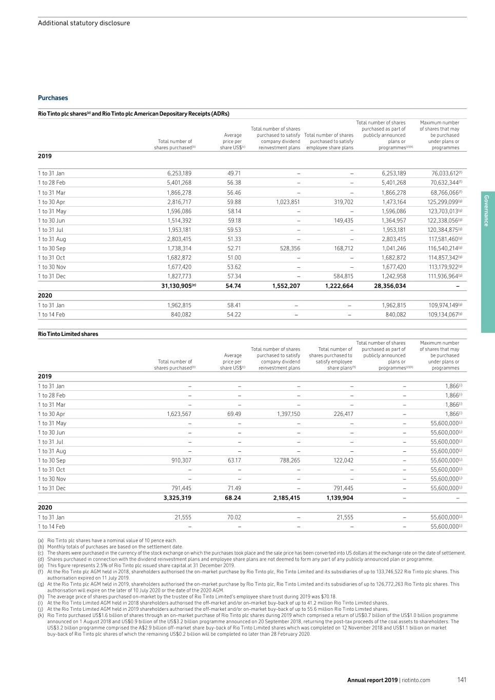 Additional statutory disclosure Purchases Rio Tinto plc shares(a) and Rio Tinto plc American Depositary Receipts (ADRs) Total number of shares Maximum number Total number of shares purchased as part of of shares that may Average purchased to satisfy Total number of shares publicly announced be purchased Total number of price per company dividend purchased to satisfy plans or under plans or shares purchased(b) share US$(c) reinvestment plans employee share plans programmes(d)(k) programmes 2019 1 to 31 Jan 6,253,189 49.71 – – 6,253,189 76,033,612(f) 1 to 28 Feb 5,401,268 56.38 – – 5,401,268 70,632,344(f) (f) 1 to 31 Mar 1,866,278 56.46 – – 1,866,278 68,766,066 Governance 1 to 30 Apr 2,816,717 59.88 1,023,851 319,702 1,473,164 125,299,099(g) 1 to 31 May 1,596,086 58.14 – – 1,596,086 123,703,013(g) 1 to 30 Jun 1,514,392 59.18 – 149,435 1,364,957 122,338,056(g) 1 to 31 Jul 1,953,181 59.53 – – 1,953,181 120,384,875(g) 1 to 31 Aug 2,803,415 51.33 – – 2,803,415 117,581,460 (g) 1 to 30 Sep 1,738,314 52.71 528,356 168,712 1,041,246 116,540,214 (g) 1 to 31 Oct 1,682,872 51.00 – – 1,682,872 114,857,342(g) 1 to 30 Nov 1,677,420 53.62 – – 1,677,420 113,179,922(g) 1 to 31 Dec 1,827,773 57.34 – 584,815 1,242,958 111,936,964 (g) 31,130,905(e) 54.74 1,552,207 1,222,664 28,356,034 – 2020 1 to 31 Jan 1,962,815 58.41 – – 1,962,815 109,974,149(g) 1 to 14 Feb 840,082 54.22 – – 840,082 109,134,067(g) Rio Tinto Limited shares Total number of shares Maximum number Total number of shares Total number of purchased as part of of shares that may Average purchased to satisfy shares purchased to publicly announced be purchased Total number of price per company dividend satisfy employee plans or under plans or shares purchased(b) share US$(c) reinvestment plans share plans(h) programmes(d)(k) programmes 2019 1 to 31 Jan – – – – – 1,866(i) 1 to 28 Feb – – – – – 1,866(i) 1 to 31 Mar – – – – – 1,866(i) 1 to 30 Apr 1,623,567 69.49 1,397,150 226,417 – 1,866(i) 1 to 31 May – – – – – 55,600,000(j) 1 to 30 Jun – – – – – 55,600,000(j) 1 to 31 Jul – – – – – 55,600,000(j) 1 to 31 Aug – – – – – 55,600,000(j) 1 to 30 Sep 910,307 63.17 788,265 122,042 – 55,600,000(j) 1 to 31 Oct – – – – – 55,600,000(j) 1 to 30 Nov – – – – – 55,600,000(j) 1 to 31 Dec 791,445 71.49 – 791,445 – 55,600,000(j) 3,325,319 68.24 2,185,415 1,139,904 – – 2020 1 to 31 Jan 21,555 70.02 – 21,555 – 55,600,000(j) 1 to 14 Feb – – – – – 55,600,000(j) (a) Rio Tinto plc shares have a nominal value of 10 pence each. (b) Monthly totals of purchases are based on the settlement date. (c) The shares were purchased in the currency of the stock exchange on which the purchases took place and the sale price has been converted into US dollars at the exchange rate on the date of settlement. (d) Shares purchased in connection with the dividend reinvestment plans and employee share plans are not deemed to form any part of any publicly announced plan or programme. (e) This figure represents 2.5% of Rio Tinto plc issued share capital at 31 December 2019. (f) At the Rio Tinto plc AGM held in 2018, shareholders authorised the on-market purchase by Rio Tinto plc, Rio Tinto Limited and its subsidiaries of up to 133,746,522 Rio Tinto plc shares. This authorisation expired on 11 July 2019. (g) At the Rio Tinto plc AGM held in 2019, shareholders authorised the on-market purchase by Rio Tinto plc, Rio Tinto Limited and its subsidiaries of up to 126,772,263 Rio Tinto plc shares. This authorisation will expire on the later of 10 July 2020 or the date of the 2020 AGM. (h) The average price of shares purchased on-market by the trustee of Rio Tinto Limited’s employee share trust during 2019 was $70.18. (i) At the Rio Tinto Limited AGM held in 2018 shareholders authorised the off-market and/or on-market buy-back of up to 41.2 million Rio Tinto Limited shares. (j) At the Rio Tinto Limited AGM held in 2019 shareholders authorised the off-market and/or on-market buy-back of up to 55.6 million Rio Tinto Limited shares. (k) Rio Tinto purchased US$1.6 billion of shares through an on-market purchase of Rio Tinto plc shares during 2019 which comprised a return of US$0.7 billion of the US$1.0 billion programme announced on 1 August 2018 and US$0.9 billion of the US$3.2 billion programme announced on 20 September 2018, returning the post-tax proceeds of the coal assets to shareholders. The US$3.2 billion programme comprised the A$2.9 billion off-market share buy-back of Rio Tinto Limited shares which was completed on 12 November 2018 and US$1.1 billion on market buy-back of Rio Tinto plc shares of which the remaining US$0.2 billion will be completed no later than 28 February 2020. Annual report 2019 | riotinto.com 141
