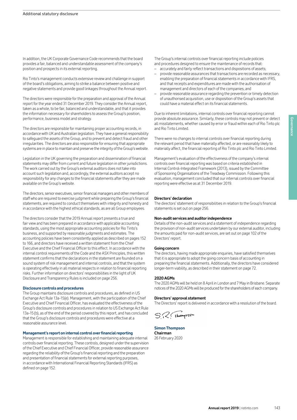 Additional statutory disclosure In addition, the UK Corporate Governance Code recommends that the board The Group’s internal controls over financial reporting include policies provides a fair, balanced and understandable assessment of the company’s and procedures designed to ensure the maintenance of records that: position and prospects in its external reporting. –– accurately and fairly reflect transactions and dispositions of assets; –– provide reasonable assurances that transactions are recorded as necessary, Rio Tinto’s management conducts extensive review and challenge in support enabling the preparation of financial statements in accordance with IFRS, of the board’s obligations, aiming to strike a balance between positive and and that receipts and expenditures are made with the authorisation of negative statements and provide good linkages throughout the Annual report. management and directors of each of the companies; and –– provide reasonable assurance regarding the prevention or timely detection The directors were responsible for the preparation and approval of the Annual of unauthorised acquisition, use or disposition of the Group’s assets that report for the year ended 31 December 2019. They consider the Annual report, could have a material effect on its financial statements. taken as a whole, to be fair, balanced and understandable, and that it provides the information necessary for shareholders to assess the Group’s position, Due to inherent limitations, internal controls over financial reporting cannot performance, business model and strategy. provide absolute assurance. Similarly, these controls may not prevent or detect Governance all misstatements, whether caused by error or fraud within each of Rio Tinto plc The directors are responsible for maintaining proper accounting records, in and Rio Tinto Limited. accordance with UK and Australian legislation. They have a general responsibility to safeguard the assets of the Group, and to prevent and detect fraud and other There were no changes to internal controls over financial reporting during irregularities. The directors are also responsible for ensuring that appropriate the relevant period that have materially affected, or are reasonably likely to systems are in place to maintain and preserve the integrity of the Group’s website. materially affect, the financial reporting of Rio Tinto plc and Rio Tinto Limited. Legislation in the UK governing the preparation and dissemination of financial Management’s evaluation of the effectiveness of the company’s internal statements may differ from current and future legislation in other jurisdictions. controls over financial reporting was based on criteria established in The work carried out by the Group’s external auditors does not take into Internal Control-Integrated Framework (2013), issued by the Committee account such legislation and, accordingly, the external auditors accept no of Sponsoring Organisations of the Treadway Commission. Following this responsibility for any changes to the financial statements after they are made evaluation, management concluded that our internal controls over financial available on the Group’s website. reporting were effective as at 31 December 2019. The directors, senior executives, senior financial managers and other members of staff who are required to exercise judgment while preparing the Group’s financial Directors’ declaration statements, are required to conduct themselves with integrity and honesty and The directors’ statement of responsibilities in relation to the Group’s financial in accordance with the highest ethical standards, as are all Group employees. statements is set out on page 256. The directors consider that the 2019 Annual report presents a true and Non-audit services and auditor independence fair view and has been prepared in accordance with applicable accounting Details of the non-audit services and a statement of independence regarding standards, using the most appropriate accounting policies for Rio Tinto’s the provision of non-audit services undertaken by our external auditor, including business, and supported by reasonable judgments and estimates. The the amounts paid for non-audit services, are set out on page 102 of the accounting policies have been consistently applied as described on pages 152 Directors’ report. to 166, and directors have received a written statement from the Chief Executive and the Chief Financial Officer to this effect. In accordance with the Going concern internal control requirements of the Code and the ASX Principles, this written The directors, having made appropriate enquiries, have satisfied themselves statement confirms that the declarations in the statement are founded on a that it is appropriate to adopt the going concern basis of accounting in sound system of risk management and internal controls, and that the system preparing the financial statements. Additionally, the directors have considered is operating effectively in all material respects in relation to financial reporting longer-term viability, as described in their statement on page 72. risks. Further information on directors’ responsibilities in the light of UK Disclosure and Transparency Rules is included on page 256. 2020 AGMs The 2020 AGMs will be held on 8 April in London and 7 May in Brisbane. Separate Disclosure controls and procedures notices of the 2020 AGMs will be produced for the shareholders of each company. The Group maintains disclosure controls and procedures, as defined in US Exchange Act Rule 13a-15(e). Management, with the participation of the Chief Directors’ approval statement Executive and Chief Financial Officer, has evaluated the effectiveness of the The Directors’ report is delivered in accordance with a resolution of the board. Group’s disclosure controls and procedures in relation to US Exchange Act Rule 13a-15 (b), as of the end of the period covered b