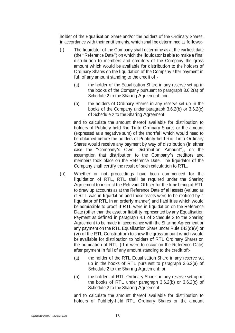 LON55100484/9 162683-0025 18 holder of the Equalisation Share and/or the holders of the Ordinary Shares, in accordance with their entitlements, which shall be determined as follows:- (i) The liquidator of the Company shall determine as at the earliest date (the “Reference Date”) on which the liquidator is able to make a final distribution to members and creditors of the Company the gross amount which would be available for distribution to the holders of Ordinary Shares on the liquidation of the Company after payment in full of any amount standing to the credit of:- (a) the holder of the Equalisation Share in any reserve set up in the books of the Company pursuant to paragraph 3.6.2(a) of Schedule 2 to the Sharing Agreement; and (b) the holders of Ordinary Shares in any reserve set up in the books of the Company under paragraph 3.6.2(b) or 3.6.2(c) of Schedule 2 to the Sharing Agreement and to calculate the amount thereof available for distribution to holders of Publicly-held Rio Tinto Ordinary Shares or the amount (expressed as a negative sum) of the shortfall which would need to be obtained before the holders of Publicly-held Rio Tinto Ordinary Shares would receive any payment by way of distribution (in either case the “Company’s Own Distribution Amount”), on the assumption that distribution to the Company’s creditors and members took place on the Reference Date. The liquidator of the Company shall certify the result of such calculation to RTL. (ii) Whether or not proceedings have been commenced for the liquidation of RTL, RTL shall be required under the Sharing Agreement to instruct the Relevant Officer for the time being of RTL to draw up accounts as at the Reference Date of all assets (valued as if RTL was in liquidation and those assets were to be realised by a liquidator of RTL in an orderly manner) and liabilities which would be admissible to proof if RTL were in liquidation on the Reference Date (other than the asset or liability represented by any Equalisation Payment as defined in paragraph 4.1 of Schedule 2 to the Sharing Agreement to be made in accordance with the Sharing Agreement or any payment on the RTL Equalisation Share under Rule 143(d)(v) or (vi) of the RTL Constitution) to show the gross amount which would be available for distribution to holders of RTL Ordinary Shares on the liquidation of RTL (if it were to occur on the Reference Date) after payment in full of any amount standing to the credit of:- (a) the holder of the RTL Equalisation Share in any reserve set up in the books of RTL pursuant to paragraph 3.6.2(a) of Schedule 2 to the Sharing Agreement; or (b) the holders of RTL Ordinary Shares in any reserve set up in the books of RTL under paragraph 3.6.2(b) or 3.6.2(c) of Schedule 2 to the Sharing Agreement and to calculate the amount thereof available for distribution to holders of Publicly-held RTL Ordinary Shares or the amount