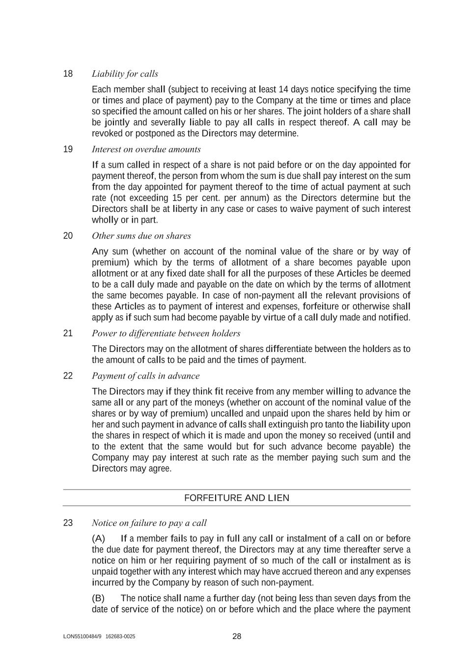 LON55100484/9 162683-0025 28 18 Liability for calls Each member shall (subject to receiving at least 14 days notice specifying the time or times and place of payment) pay to the Company at the time or times and place so specified the amount called on his or her shares. The joint holders of a share shall be jointly and severally liable to pay all calls in respect thereof. A call may be revoked or postponed as the Directors may determine. 19 Interest on overdue amounts If a sum called in respect of a share is not paid before or on the day appointed for payment thereof, the person from whom the sum is due shall pay interest on the sum from the day appointed for payment thereof to the time of actual payment at such rate (not exceeding 15 per cent. per annum) as the Directors determine but the Directors shall be at liberty in any case or cases to waive payment of such interest wholly or in part. 20 Other sums due on shares Any sum (whether on account of the nominal value of the share or by way of premium) which by the terms of allotment of a share becomes payable upon allotment or at any fixed date shall for all the purposes of these Articles be deemed to be a call duly made and payable on the date on which by the terms of allotment the same becomes payable. In case of non-payment all the relevant provisions of these Articles as to payment of interest and expenses, forfeiture or otherwise shall apply as if such sum had become payable by virtue of a call duly made and notified. 21 Power to differentiate between holders The Directors may on the allotment of shares differentiate between the holders as to the amount of calls to be paid and the times of payment. 22 Payment of calls in advance The Directors may if they think fit receive from any member willing to advance the same all or any part of the moneys (whether on account of the nominal value of the shares or by way of premium) uncalled and unpaid upon the shares held by him or her and such payment in advance of calls shall extinguish pro tanto the liability upon the shares in respect of which it is made and upon the money so received (until and to the extent that the same would but for such advance become payable) the Company may pay interest at such rate as the member paying such sum and the Directors may agree. FORFEITURE AND LIEN 23 Notice on failure to pay a call (A) If a member fails to pay in full any call or instalment of a call on or before the due date for payment thereof, the Directors may at any time thereafter serve a notice on him or her requiring payment of so much of the call or instalment as is unpaid together with any interest which may have accrued thereon and any expenses incurred by the Company by reason of such non-payment. (B) The notice shall name a further day (not being less than seven days from the date of service of the notice) on or before which and the place where the payment