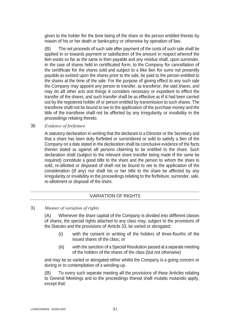LON55100484/9 162683-0025 31 given to the holder for the time being of the share or the person entitled thereto by reason of his or her death or bankruptcy or otherwise by operation of law. (B) The net proceeds of such sale after payment of the costs of such sale shall be applied in or towards payment or satisfaction of the amount in respect whereof the lien exists so far as the same is then payable and any residue shall, upon surrender, in the case of shares held in certificated form, to the Company for cancellation of the certificate for the shares sold and subject to a like lien for sums not presently payable as existed upon the shares prior to the sale, be paid to the person entitled to the shares at the time of the sale. For the purpose of giving effect to any such sale the Company may appoint any person to transfer, as transferor, the said shares, and may do all other acts and things it considers necessary or expedient to effect the transfer of the shares, and such transfer shall be as effective as if it had been carried out by the registered holder of or person entitled by transmission to such shares. The transferee shall not be bound to see to the application of the purchase money and the title of the transferee shall not be affected by any irregularity or invalidity in the proceedings relating thereto. 30 Evidence of forfeiture A statutory declaration in writing that the declarant is a Director or the Secretary and that a share has been duly forfeited or surrendered or sold to satisfy a lien of the Company on a date stated in the declaration shall be conclusive evidence of the facts therein stated as against all persons claiming to be entitled to the share. Such declaration shall (subject to the relevant share transfer being made if the same be required) constitute a good title to the share and the person to whom the share is sold, re-allotted or disposed of shall not be bound to see to the application of the consideration (if any) nor shall his or her title to the share be affected by any irregularity or invalidity in the proceedings relating to the forfeiture, surrender, sale, re-allotment or disposal of the share. VARIATION OF RIGHTS 31 Manner of variation of rights (A) Whenever the share capital of the Company is divided into different classes of shares, the special rights attached to any class may, subject to the provisions of the Statutes and the provisions of Article 33, be varied or abrogated: (i) with the consent in writing of the holders of three-fourths of the issued shares of the class; or (ii) with the sanction of a Special Resolution passed at a separate meeting of the holders of the shares of the class (but not otherwise) and may be so varied or abrogated either whilst the Company is a going concern or during or in contemplation of a winding-up. (B) To every such separate meeting all the provisions of these Articles relating to General Meetings and to the proceedings thereat shall mutatis mutandis apply, except that: