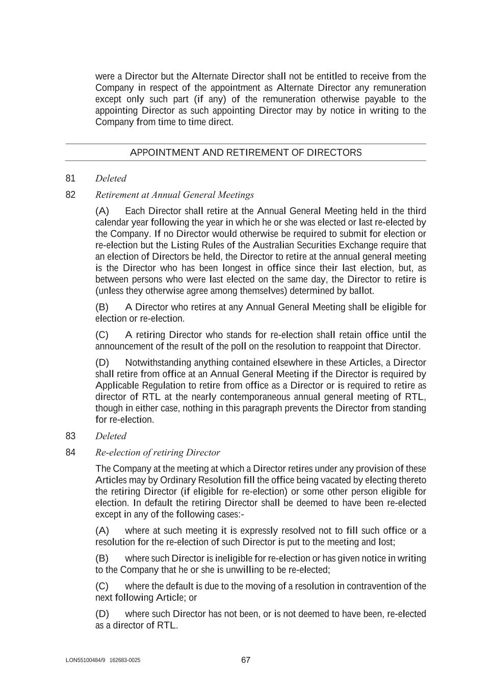LON55100484/9 162683-0025 67 were a Director but the Alternate Director shall not be entitled to receive from the Company in respect of the appointment as Alternate Director any remuneration except only such part (if any) of the remuneration otherwise payable to the appointing Director as such appointing Director may by notice in writing to the Company from time to time direct. APPOINTMENT AND RETIREMENT OF DIRECTORS 81 Deleted 82 Retirement at Annual General Meetings (A) Each Director shall retire at the Annual General Meeting held in the third calendar year following the year in which he or she was elected or last re-elected by the Company. If no Director would otherwise be required to submit for election or re-election but the Listing Rules of the Australian Securities Exchange require that an election of Directors be held, the Director to retire at the annual general meeting is the Director who has been longest in office since their last election, but, as between persons who were last elected on the same day, the Director to retire is (unless they otherwise agree among themselves) determined by ballot. (B) A Director who retires at any Annual General Meeting shall be eligible for election or re-election. (C) A retiring Director who stands for re-election shall retain office until the announcement of the result of the poll on the resolution to reappoint that Director. (D) Notwithstanding anything contained elsewhere in these Articles, a Director shall retire from office at an Annual General Meeting if the Director is required by Applicable Regulation to retire from office as a Director or is required to retire as director of RTL at the nearly contemporaneous annual general meeting of RTL, though in either case, nothing in this paragraph prevents the Director from standing for re-election. 83 Deleted 84 Re-election of retiring Director The Company at the meeting at which a Director retires under any provision of these Articles may by Ordinary Resolution fill the office being vacated by electing thereto the retiring Director (if eligible for re-election) or some other person eligible for election. In default the retiring Director shall be deemed to have been re-elected except in any of the following cases:- (A) where at such meeting it is expressly resolved not to fill such office or a resolution for the re-election of such Director is put to the meeting and lost; (B) where such Director is ineligible for re-election or has given notice in writing to the Company that he or she is unwilling to be re-elected; (C) where the default is due to the moving of a resolution in contravention of the next following Article; or (D) where such Director has not been, or is not deemed to have been, re-elected as a director of RTL.