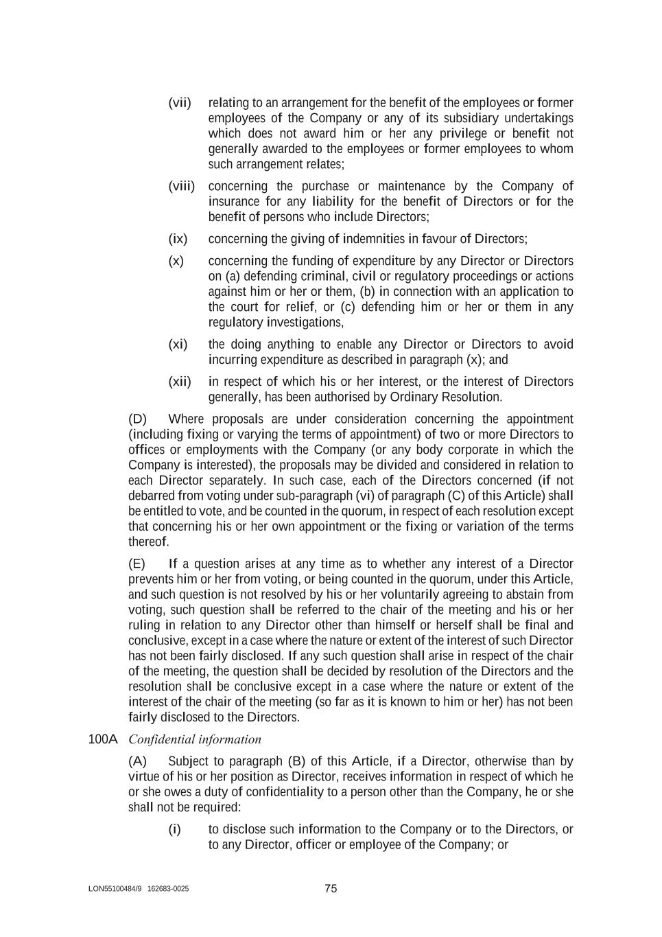 LON55100484/9 162683-0025 75 (vii) relating to an arrangement for the benefit of the employees or former employees of the Company or any of its subsidiary undertakings which does not award him or her any privilege or benefit not generally awarded to the employees or former employees to whom such arrangement relates; (viii) concerning the purchase or maintenance by the Company of insurance for any liability for the benefit of Directors or for the benefit of persons who include Directors; (ix) concerning the giving of indemnities in favour of Directors; (x) concerning the funding of expenditure by any Director or Directors on (a) defending criminal, civil or regulatory proceedings or actions against him or her or them, (b) in connection with an application to the court for relief, or (c) defending him or her or them in any regulatory investigations, (xi) the doing anything to enable any Director or Directors to avoid incurring expenditure as described in paragraph (x); and (xii) in respect of which his or her interest, or the interest of Directors generally, has been authorised by Ordinary Resolution. (D) Where proposals are under consideration concerning the appointment (including fixing or varying the terms of appointment) of two or more Directors to offices or employments with the Company (or any body corporate in which the Company is interested), the proposals may be divided and considered in relation to each Director separately. In such case, each of the Directors concerned (if not debarred from voting under sub-paragraph (vi) of paragraph (C) of this Article) shall be entitled to vote, and be counted in the quorum, in respect of each resolution except that concerning his or her own appointment or the fixing or variation of the terms thereof. (E) If a question arises at any time as to whether any interest of a Director prevents him or her from voting, or being counted in the quorum, under this Article, and such question is not resolved by his or her voluntarily agreeing to abstain from voting, such question shall be referred to the chair of the meeting and his or her ruling in relation to any Director other than himself or herself shall be final and conclusive, except in a case where the nature or extent of the interest of such Director has not been fairly disclosed. If any such question shall arise in respect of the chair of the meeting, the question shall be decided by resolution of the Directors and the resolution shall be conclusive except in a case where the nature or extent of the interest of the chair of the meeting (so far as it is known to him or her) has not been fairly disclosed to the Directors. 100A Confidential information (A) Subject to paragraph (B) of this Article, if a Director, otherwise than by virtue of his or her position as Director, receives information in respect of which he or she owes a duty of confidentiality to a person other than the Company, he or she shall not be required: (i) to disclose such information to the Company or to the Directors, or to any Director, officer or employee of the Company; or