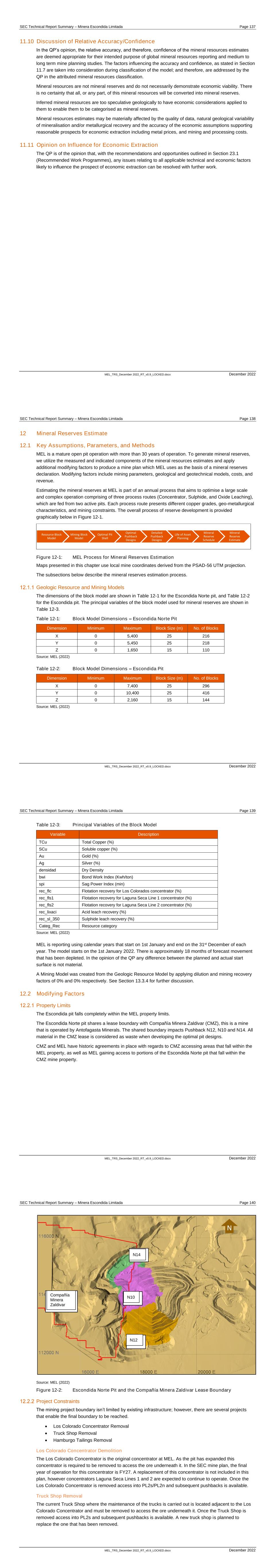 SEC Technical Report Summary – Minera Escondida Limitada Page 137 MEL_TRS_December 2022_RT_v0.9_LOCKED.docx December 2022 11.10 Discussion of Relative Accuracy/Confidence In the QP’s opinion, the relative accuracy, and therefore, confidence of the mineral resources estimates are deemed appropriate for their intended purpose of global mineral resources reporting and medium to long term mine planning studies. The factors influencing the accuracy and confidence, as stated in Section 11.7 are taken into consideration during classification of the model; and therefore, are addressed by the QP in the attributed mineral resources classification. Mineral resources are not mineral reserves and do not necessarily demonstrate economic viability. There is no certainty that all, or any part, of this mineral resources will be converted into mineral reserves. Inferred mineral resources are too speculative geologically to have economic considerations applied to them to enable them to be categorised as mineral reserves. Mineral resources estimates may be materially affected by the quality of data, natural geological variability of mineralisation and/or metallurgical recovery and the accuracy of the economic assumptions supporting reasonable prospects for economic extraction including metal prices, and mining and processing costs. 11.11 Opinion on Influence for Economic Extraction The QP is of the opinion that, with the recommendations and opportunities outlined in Section 23.1 (Recommended Work Programmes), any issues relating to all applicable technical and economic factors likely to influence the prospect of economic extraction can be resolved with further work. SEC Technical Report Summary – Minera Escondida Limitada Page 138 MEL_TRS_December 2022_RT_v0.9_LOCKED.docx December 2022 12 Mineral Reserves Estimate 12.1 Key Assumptions, Parameters, and Methods MEL is a mature open pit operation with more than 30 years of operation. To generate mineral reserves, we utilize the measured and indicated components of the mineral resources estimates and apply additional modifying factors to produce a mine plan which MEL uses as the basis of a mineral reserves declaration. Modifying factors include mining parameters, geological and geotechnical models, costs, and revenue. Estimating the mineral reserves at MEL is part of an annual process that aims to optimise a large scale and complex operation comprising of three process routes (Concentrator, Sulphide, and Oxide Leaching), which are fed from two active pits. Each process route presents different copper grades, geo-metallurgical characteristics, and mining constraints. The overall process of reserve development is provided graphically below in Figure 12-1. Figure 12-1: MEL Process for Mineral Reserves Estimation Maps presented in this chapter use local mine coordinates derived from the PSAD-56 UTM projection. The subsections below describe the mineral reserves estimation process. Geologic Resource and Mining Models The dimensions of the block model are shown in Table 12-1 for the Escondida Norte pit, and Table 12-2 for the Escondida pit. The principal variables of the block model used for mineral reserves are shown in Table 12-3. Table 12-1: Block Model Dimensions – Escondida Norte Pit Dimension Minimum Maximum Block Size (m) No. of Blocks X 0 5,400 25 216 Y 0 5,450 25 218 Z 0 1,650 15 110 Source: MEL (2022) Table 12-2: Block Model Dimensions – Escondida Pit Dimension Minimum Maximum Block Size (m) No. of Blocks X 0 7,400 25 296 Y 0 10,400 25 416 Z 0 2,160 15 144 Source: MEL (2022) Resource Block Model Mining Block Model Optimal Pit Shell Optimal Pushback Designs Detailed Pushback Designs Life of Asset Planning Mineral Reserve Schedule Mineral Reserve Estimate SEC Technical Report Summary – Minera Escondida Limitada Page 139 MEL_TRS_December 2022_RT_v0.9_LOCKED.docx December 2022 Table 12-3: Principal Variables of the Block Model Variable Description TCu Total Copper (%) SCu Soluble copper (%) Au Gold (%) Ag Silver (%) densidad Dry Density bwi Bond Work Index (Kwh/ton) spi Sag Power Index (min) rec_flc Flotation recovery for Los Colorados concentrator (%) rec_fls1 Flotation recovery for Laguna Seca Line 1 concentrator (%) rec_fls2 Flotation recovery for Laguna Seca Line 2 concentrator (%) rec_lixaci Acid leach recovery (%) rec_sl_350 Sulphide leach recovery (%) Categ_Rec Resource category Source: MEL (2022) MEL is reporting using calendar years that start on 1st January and end on the 31st December of each year. The model starts on the 1st January 2022. There is approximately 18 months of forecast movement that has been depleted. In the opinion of the QP any difference between the planned and actual start surface is not material. A Mining Model was created from the Geologic Resource Model by applying dilution and mining recovery factors of 0% and 0% respectively. See Section 13.3.4 for further discussion. 12.2 Modifying Factors Property Limits The Escondida pit falls completely within the MEL property limits. The Escondida Norte pit shares a lease boundary with Compañía Minera Zaldivar (CMZ), this is a mine that is operated by Antofagasta Minerals. The shared boundary impacts Pushback N12, N10 and N14. All material in the CMZ lease is considered as waste when developing the optimal pit designs. CMZ and MEL have historic agreements in place with regards to CMZ accessing areas that fall within the MEL property, as well as MEL gaining access to portions of the Escondida Norte pit that fall within the CMZ mine property. SEC Technical Report Summary – Minera Escondida Limitada Page 140 MEL_TRS_December 2022_RT_v0.9_LOCKED.docx December 2022 Source: MEL (2022) Figure 12-2: Escondida Norte Pit and the Compañía Minera Zaldivar Lease Boundary Project Constraints The mining project boundary isn’t limited by existing infrastructure; however, there are several projects that enable the final boundary to be reached. • Los Colorado Concentrator Removal • 
