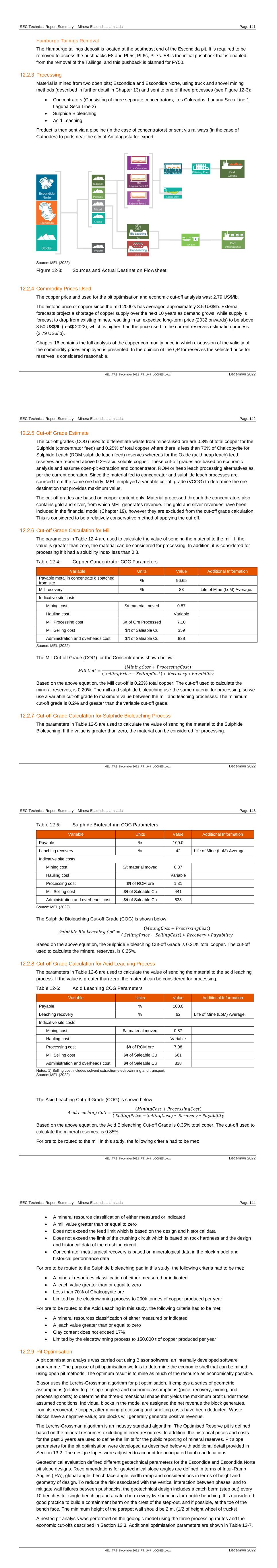 SEC Technical Report Summary – Minera Escondida Limitada Page 141 MEL_TRS_December 2022_RT_v0.9_LOCKED.docx December 2022 Hamburgo Tailings Removal The Hamburgo tailings deposit is located at the southeast end of the Escondida pit. It is required to be removed to access the pushbacks E8 and PL5s, PL6s, PL7s. E8 is the initial pushback that is enabled from the removal of the Tailings, and this pushback is planned for FY50. Processing Material is mined from two open pits; Escondida and Escondida Norte, using truck and shovel mining methods (described in further detail in Chapter 13) and sent to one of three processes (see Figure 12-3): • Concentrators (Consisting of three separate concentrators; Los Colorados, Laguna Seca Line 1, Laguna Seca Line 2) • Sulphide Bioleaching • Acid Leaching Product is then sent via a pipeline (in the case of concentrators) or sent via railways (in the case of Cathodes) to ports near the city of Antofagasta for export. Source: MEL (2022) Figure 12-3: Sources and Actual Destination Flowsheet Commodity Prices Used The copper price and used for the pit optimisation and economic cut-off analysis was: 2.79 US$/lb. The historic price of copper since the mid 2000’s has averaged approximately 3.5 US$/lb. External forecasts project a shortage of copper supply over the next 10 years as demand grows, while supply is forecast to drop from existing mines, resulting in an expected long-term price (2032 onwards) to be above 3.50 US$/lb (real$ 2022), which is higher than the price used in the current reserves estimation process (2.79 US$/lb). Chapter 16 contains the full analysis of the copper commodity price in which discussion of the validity of the commodity prices employed is presented. In the opinion of the QP for reserves the selected price for reserves is considered reasonable. SEC Technical Report Summary – Minera Escondida Limitada Page 142 MEL_TRS_December 2022_RT_v0.9_LOCKED.docx December 2022 Cut-off Grade Estimate The cut-off grades (COG) used to differentiate waste from mineralised ore are 0.3% of total copper for the Sulphide (concentrator feed) and 0.25% of total copper where there is less than 70% of Chalcopyrite for Sulphide Leach (ROM sulphide leach feed) reserves whereas for the Oxide (acid heap leach) feed reserves are reported above 0.2% acid soluble copper. These cut-off grades are based on economic analysis and assume open-pit extraction and concentrator, ROM or heap leach processing alternatives as per the current operation. Since the material fed to concentrator and sulphide leach processes are sourced from the same ore body, MEL employed a variable cut-off grade (VCOG) to determine the ore destination that provides maximum value. The cut-off grades are based on copper content only. Material processed through the concentrators also contains gold and silver, from which MEL generates revenue. The gold and silver revenues have been included in the financial model (Chapter 19), however they are excluded from the cut-off grade calculation. This is considered to be a relatively conservative method of applying the cut-off. Cut-off Grade Calculation for Mill The parameters in Table 12-4 are used to calculate the value of sending the material to the mill. If the value is greater than zero, the material can be considered for processing. In addition, it is considered for processing if it had a solubility index less than 0.8. Table 12-4: Copper Concentrator COG Parameters Variable Units Value Additional Information Payable metal in concentrate dispatched from site % 96.65 Mill recovery % 83 Life of Mine (LoM) Average. Indicative site costs Mining cost $/t material moved 0.87 Hauling cost Variable Mill Processing cost $/t of Ore Processed 7.10 Mill Selling cost $/t of Saleable Cu 359 Administration and overheads cost $/t of Saleable Cu 838 Source: MEL (2022) The Mill Cut-off Grade (COG) for the Concentrator is shown below: 𝑀𝑖𝑙𝑙 𝐶𝑜𝐺 = (𝑀𝑖𝑛𝑖𝑛𝑔𝐶𝑜𝑠𝑡 + 𝑃𝑟𝑜𝑐𝑒𝑠𝑠𝑖𝑛𝑔𝐶𝑜𝑠𝑡) ( 𝑆𝑒𝑙𝑙𝑖𝑛𝑔𝑃𝑟𝑖𝑐𝑒 − 𝑆𝑒𝑙𝑙𝑖𝑛𝑔𝐶𝑜𝑠𝑡) ∗ 𝑅𝑒𝑐𝑜𝑣𝑒𝑟𝑦 ∗ 𝑃𝑎𝑦𝑎𝑏𝑖𝑙𝑖𝑡𝑦 Based on the above equation, the Mill cut-off is 0.23% total copper. The cut-off used to calculate the mineral reserves, is 0.20%. The mill and sulphide bioleaching use the same material for processing, so we use a variable cut-off grade to maximum value between the mill and leaching processes. The minimum cut-off grade is 0.2% and greater than the variable cut-off grade. Cut-off Grade Calculation for Sulphide Bioleaching Process The parameters in Table 12-5 are used to calculate the value of sending the material to the Sulphide Bioleaching. If the value is greater than zero, the material can be considered for processing. SEC Technical Report Summary – Minera Escondida Limitada Page 143 MEL_TRS_December 2022_RT_v0.9_LOCKED.docx December 2022 Table 12-5: Sulphide Bioleaching COG Parameters Variable Units Value Additional Information Payable % 100.0 Leaching recovery % 42 Life of Mine (LoM) Average. Indicative site costs Mining cost $/t material moved 0.87 Hauling cost Variable Processing cost $/t of ROM ore 1.31 Mill Selling cost $/t of Saleable Cu 441 Administration and overheads cost $/t of Saleable Cu 838 Source: MEL (2022) The Sulphide Bioleaching Cut-off Grade (COG) is shown below: 𝑆𝑢𝑙𝑝ℎ𝑖𝑑𝑒 𝐵𝑖𝑜 𝐿𝑒𝑎𝑐ℎ𝑖𝑛𝑔 𝐶𝑜𝐺 = (𝑀𝑖𝑛𝑖𝑛𝑔𝐶𝑜𝑠𝑡 + 𝑃𝑟𝑜𝑐𝑒𝑠𝑠𝑖𝑛𝑔𝐶𝑜𝑠𝑡) ( 𝑆𝑒𝑙𝑙𝑖𝑛𝑔𝑃𝑟𝑖𝑐𝑒 − 𝑆𝑒𝑙𝑙𝑖𝑛𝑔𝐶𝑜𝑠𝑡) ∗ 𝑅𝑒𝑐𝑜𝑣𝑒𝑟𝑦 ∗ 𝑃𝑎𝑦𝑎𝑏𝑖𝑙𝑖𝑡𝑦 Based on the above equation, the Sulphide Bioleaching Cut-off Grade is 0.21% total copper. The cut-off used to calculate the mineral reserves, is 0.25%. Cut-off Grade 