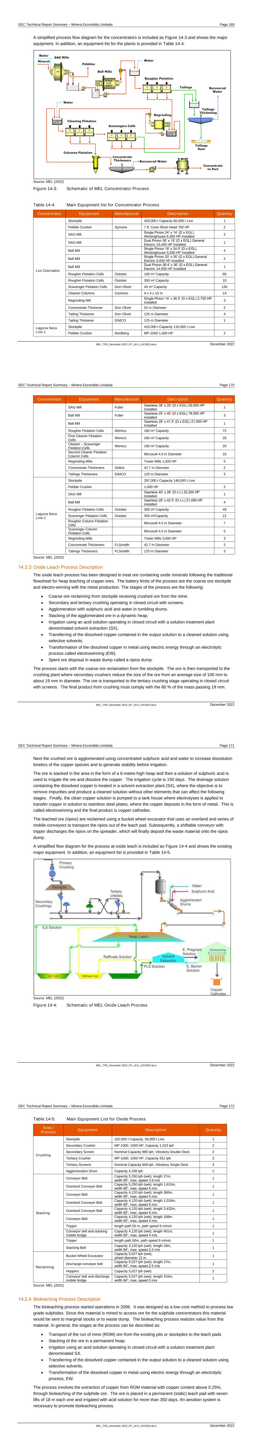 SEC Technical Report Summary – Minera Escondida Limitada Page 169 MEL_TRS_December 2022_RT_v0.9_LOCKED.docx December 2022 A simplified process flow diagram for the concentrators is included as Figure 14-3 and shows the major equipment. In addition, an equipment list for the plants is provided in Table 14-4. Source: MEL (2022) Figure 14-3: Schematic of MEL Concentrator Process Table 14-4: Main Equipment list for Concentrator Process Concentrator Equipment Manufacturer Description Quantity Los Colorados Stockpile 420,000 t Capacity 60,000 t Live 1 Pebble Crusher Symons 7 ft. Cone Short Head 750 HP 2 SAG Mill Single Pinion 24’ x 14’ (D x EGL) Westinghouse 6,300 HP Installed 2 SAG Mill Dual Pinion 36’ x 19’ (D x EGL) General Electric 19,440 HP Installed 1 Ball Mill Single Pinion 18’ x 24.5’ (D x EGL) Westinghouse 5,500 HP Installed 4 Ball Mill Single Pinion 20’ x 35’ (D x EGL) General Electric 9,000 HP Installed 2 Ball Mill Dual Pinion 26.4’ x 36’ (D x EGL) General Electric 14,000 HP Installed 1 Rougher Flotation Cells Outotec 100 m³ Capacity 80 Rougher Flotation Cells Outotec 300 m³ Capacity 10 Scavenger Flotation Cells Dorr-Oliver 44 m³ Capacity 130 Cleaner Columns Cominco 4 x 4 x 15 m 14 Regrinding Mill Single Pinion 14’ x 26.5’ (D x EGL) 2,750 HP Installed 3 Concentrate Thickener Dorr Oliver 52 m Diameter 2 Tailing Thickener Dorr Oliver 125 m Diameter 4 Tailing Thickener EIMCO 125 m Diameter 1 Laguna Seca Line 1 Stockpile 410,000 t Capacity 110,000 t Live Pebble Crusher Nordberg MP-1000 1,000 HP 2 SEC Technical Report Summary – Minera Escondida Limitada Page 170 MEL_TRS_December 2022_RT_v0.9_LOCKED.docx December 2022 Concentrator Equipment Manufacturer Description Quantity SAG Mill Fuller Gearless 38’ x 20’ (D x EGL) 26,000 HP Installed 1 Ball Mill Fuller Gearless 25’ x 40’ (D x EGL) 18,000 HP Installed 3 Ball Mill Gearless 26’ x 41.5’ (D x EGL) 21,000 HP Installed 1 Rougher Flotation Cells Wemco 160 m³ Capacity 72 First Cleaner Flotation Cells Wemco 160 m³ Capacity 25 Cleaner – Scavenger Flotation Cells Wemco 160 m³ Capacity 20 Second Cleaner Flotation Column Cells Microcell 4.5 m Diameter 10 Regrinding Mills Tower Mills 1,500 HP 5 Concentrate Thickeners Delkor 42.7 m Diameter 2 Tailings Thickeners EIMCO 125 m Diameter 3 Laguna Seca Line 2 Stockpile 297,000 t Capacity 146,000 t Live Pebble Crusher 1,000 HP 2 SAG Mill Gearless 40’ x 26’ (D x L) 32,200 HP Installed 1 Ball Mill Gearless 26’ x 42.5’ (D x L) 21,000 HP Installed 4 Rougher Flotation Cells Outotec 300 m³ Capacity 49 Scavenger Flotation Cells Outotec 300 m³Capacity 21 Rougher Column Flotation Cells Microcell 4.5 m Diameter 7 Scavenger Column Flotation Cells Microcell 4.5 m Diameter 5 Regrinding Mills Tower Mills 3,000 HP 3 Concentrate Thickeners FLSmidth 42.7 m Diameter 2 Tailings Thickeners FLSmidth 125 m Diameter 3 Source: MEL (2022) Oxide Leach Process Description The oxide leach process has been designed to treat ore containing oxide minerals following the traditional flowsheet for heap leaching of copper ores. The battery limits of the process are the coarse ore stockpile and electro-winning with the metal production. The stages of the process are the following: • Coarse ore reclaiming from stockpile receiving crushed ore from the mine. • Secondary and tertiary crushing operating in closed circuit with screens. • Agglomeration with sulphuric acid and water in tumbling drums. • Stacking of the agglomerated ore in a dynamic heap. • Irrigation using an acid solution operating in closed circuit with a solution treatment plant denominated solvent extraction (SX). • Transferring of the dissolved copper contained in the output solution to a cleaned solution using selective solvents. • Transformation of the dissolved copper in metal using electric energy through an electrolytic process called electrowinning (EW). • Spent ore disposal in waste dump called a ripios dump. The process starts with the coarse ore reclamation from the stockpile. The ore is then transported to the crushing plant where secondary crushers reduce the size of the ore from an average size of 100 mm to about 19 mm in diameter. The ore is transported to the tertiary crushing stage operating in closed circuit with screens. The final product from crushing must comply with the 80 % of the mass passing 19 mm. SEC Technical Report Summary – Minera Escondida Limitada Page 171 MEL_TRS_December 2022_RT_v0.9_LOCKED.docx December 2022 Next the crushed ore is agglomerated using concentrated sulphuric acid and water to increase dissolution kinetics of the copper species and to generate stability before irrigation. The ore is stacked in the area in the form of a 6-metre-high heap and then a solution of sulphuric acid is used to irrigate the ore and dissolve the copper. The irrigation cycle is 150 days. The drainage solution containing the dissolved copper is treated in a solvent extraction plant (SX), where the objective is to remove impurities and produce a cleaned solution without other elements that can affect the following stages. Finally, the clean copper solution is pumped to a tank house where electrolyses is applied to transfer copper in solution to stainless steel plates, where the copper deposits in the form of metal. This is called electrowinning and the final product is copper cathodes. The leached ore (ripios) are reclaimed using a bucket wheel excavator that uses an overland and series of mobile conveyors to transport the ripios out of the leach pad. Subsequently, a shiftable conveyor with tripper discharges the ripios on the spreader, which will finally deposit the waste material onto the ripios dump. A simplified flow diagram for the process at oxide leach is included as Figure 14-4 and shows the existing major equipment. In addition, an equipment list is provided in Table 14-5. Source: MEL (2022) Figure 14-4: Schematic of MEL Oxide Leach Process SEC Technical Report Summary – Minera