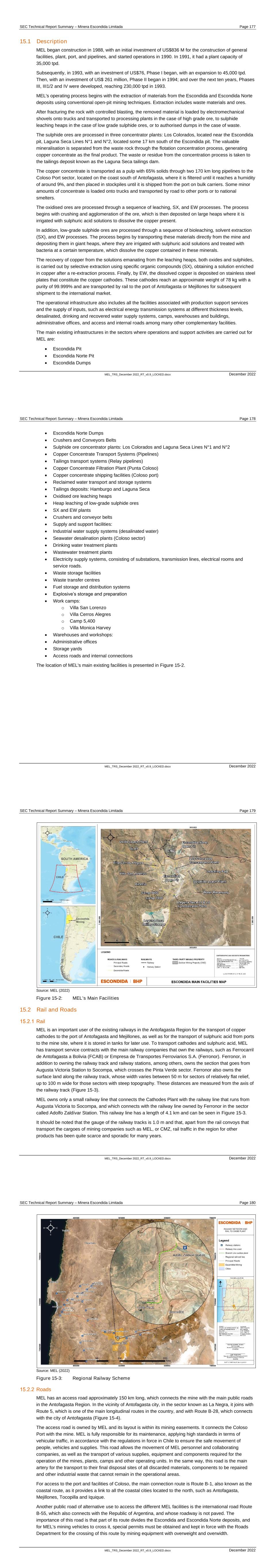 SEC Technical Report Summary – Minera Escondida Limitada Page 177 MEL_TRS_December 2022_RT_v0.9_LOCKED.docx December 2022 15.1 Description MEL began construction in 1988, with an initial investment of US$836 M for the construction of general facilities, plant, port, and pipelines, and started operations in 1990. In 1991, it had a plant capacity of 35,000 tpd. Subsequently, in 1993, with an investment of US$76, Phase I began, with an expansion to 45,000 tpd. Then, with an investment of US$ 261 million, Phase II began in 1994; and over the next ten years, Phases III, III1/2 and IV were developed, reaching 230,000 tpd in 1993. MEL's operating process begins with the extraction of materials from the Escondida and Escondida Norte deposits using conventional open-pit mining techniques. Extraction includes waste materials and ores. After fracturing the rock with controlled blasting, the removed material is loaded by electromechanical shovels onto trucks and transported to processing plants in the case of high grade ore, to sulphide leaching heaps in the case of low grade sulphide ores, or to authorised dumps in the case of waste. The sulphide ores are processed in three concentrator plants: Los Colorados, located near the Escondida pit, Laguna Seca Lines N°1 and N°2, located some 17 km south of the Escondida pit. The valuable mineralisation is separated from the waste rock through the flotation concentration process, generating copper concentrate as the final product. The waste or residue from the concentration process is taken to the tailings deposit known as the Laguna Seca tailings dam. The copper concentrate is transported as a pulp with 65% solids through two 170 km long pipelines to the Coloso Port sector, located on the coast south of Antofagasta, where it is filtered until it reaches a humidity of around 9%, and then placed in stockpiles until it is shipped from the port on bulk carriers. Some minor amounts of concentrate is loaded onto trucks and transported by road to other ports or to national smelters. The oxidised ores are processed through a sequence of leaching, SX, and EW processes. The process begins with crushing and agglomeration of the ore, which is then deposited on large heaps where it is irrigated with sulphuric acid solutions to dissolve the copper present. In addition, low-grade sulphide ores are processed through a sequence of bioleaching, solvent extraction (SX), and EW processes. The process begins by transporting these materials directly from the mine and depositing them in giant heaps, where they are irrigated with sulphuric acid solutions and treated with bacteria at a certain temperature, which dissolve the copper contained in these minerals. The recovery of copper from the solutions emanating from the leaching heaps, both oxides and sulphides, is carried out by selective extraction using specific organic compounds (SX), obtaining a solution enriched in copper after a re-extraction process. Finally, by EW, the dissolved copper is deposited on stainless steel plates that constitute the copper cathodes. These cathodes reach an approximate weight of 78 kg with a purity of 99.999% and are transported by rail to the port of Antofagasta or Mejillones for subsequent shipment to the international market. The operational infrastructure also includes all the facilities associated with production support services and the supply of inputs, such as electrical energy transmission systems at different thickness levels, desalinated, drinking and recovered water supply systems, camps, warehouses and buildings, administrative offices, and access and internal roads among many other complementary facilities. The main existing infrastructures in the sectors where operations and support activities are carried out for MEL are: • Escondida Pit • Escondida Norte Pit • Escondida Dumps SEC Technical Report Summary – Minera Escondida Limitada Page 178 MEL_TRS_December 2022_RT_v0.9_LOCKED.docx December 2022 • Escondida Norte Dumps • Crushers and Conveyors Belts • Sulphide ore concentrator plants: Los Colorados and Laguna Seca Lines N°1 and N°2 • Copper Concentrate Transport Systems (Pipelines) • Tailings transport systems (Relay pipelines) • Copper Concentrate Filtration Plant (Punta Coloso) • Copper concentrate shipping facilities (Coloso port) • Reclaimed water transport and storage systems • Tailings deposits: Hamburgo and Laguna Seca • Oxidised ore leaching heaps • Heap leaching of low-grade sulphide ores • SX and EW plants • Crushers and conveyor belts • Supply and support facilities: • Industrial water supply systems (desalinated water) • Seawater desalination plants (Coloso sector) • Drinking water treatment plants • Wastewater treatment plants • Electricity supply systems, consisting of substations, transmission lines, electrical rooms and service roads. • Waste storage facilities • Waste transfer centres • Fuel storage and distribution systems • Explosive’s storage and preparation • Work camps: o Villa San Lorenzo o Villa Cerros Alegres o Camp 5,400 o Villa Monica Harvey • Warehouses and workshops: • Administrative offices • Storage yards • Access roads and internal connections The location of MEL's main existing facilities is presented in Figure 15-2. SEC Technical Report Summary – Minera Escondida Limitada Page 179 MEL_TRS_December 2022_RT_v0.9_LOCKED.docx December 2022 Source: MEL (2022) Figure 15-2: MEL's Main Facilities 15.2 Rail and Roads Rail MEL is an important user of the existing railways in the Antofagasta Region for the transport of copper cathodes to the port of Antofagasta and Mejillones, as well as for the transport of sulphuric acid from ports to the mine site, where it is stored in tanks for later use. To transport cathodes and sulphuric acid, MEL has transport service contracts with the main railway companies that own the railways, such as Ferrocarril de Antofagasta a Bolivia (FCAB) or Empres