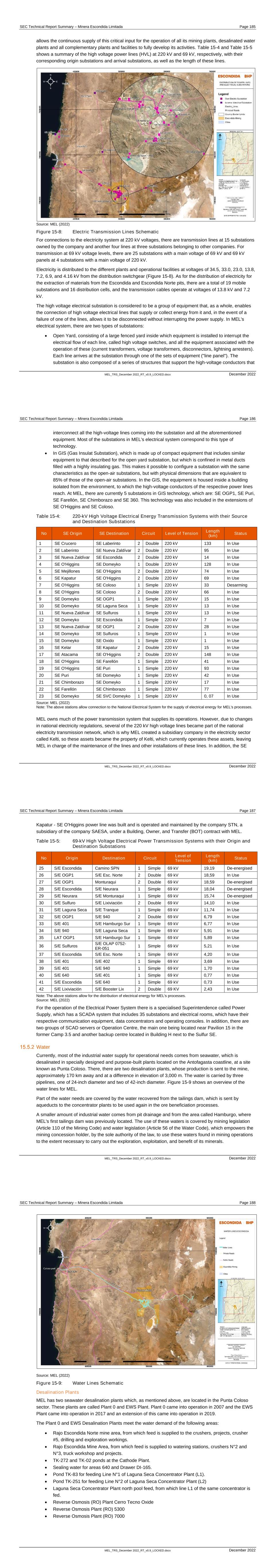 SEC Technical Report Summary – Minera Escondida Limitada Page 185 MEL_TRS_December 2022_RT_v0.9_LOCKED.docx December 2022 allows the continuous supply of this critical input for the operation of all its mining plants, desalinated water plants and all complementary plants and facilities to fully develop its activities. Table 15-4 and Table 15-5 shows a summary of the high voltage power lines (HVL) at 220 kV and 69 kV, respectively, with their corresponding origin substations and arrival substations, as well as the length of these lines. Source: MEL (2022) Figure 15-8: Electric Transmission Lines Schematic For connections to the electricity system at 220 kV voltages, there are transmission lines at 15 substations owned by the company and another four lines at three substations belonging to other companies. For transmission at 69 kV voltage levels, there are 25 substations with a main voltage of 69 kV and 69 kV panels at 4 substations with a main voltage of 220 kV. Electricity is distributed to the different plants and operational facilities at voltages of 34.5, 33.0, 23.0, 13.8, 7.2, 6.9, and 4.16 kV from the distribution switchgear (Figure 15-8). As for the distribution of electricity for the extraction of materials from the Escondida and Escondida Norte pits, there are a total of 19 mobile substations and 16 distribution cells, and the transmission cables operate at voltages of 13.8 kV and 7.2 kV. The high voltage electrical substation is considered to be a group of equipment that, as a whole, enables the connection of high voltage electrical lines that supply or collect energy from it and, in the event of a failure of one of the lines, allows it to be disconnected without interrupting the power supply. In MEL's electrical system, there are two types of substations: • Open Yard, consisting of a large fenced yard inside which equipment is installed to interrupt the electrical flow of each line, called high voltage switches, and all the equipment associated with the operation of these (current transformers, voltage transformers, disconnectors, lightning arresters). Each line arrives at the substation through one of the sets of equipment ("line panel"). The substation is also composed of a series of structures that support the high-voltage conductors that SEC Technical Report Summary – Minera Escondida Limitada Page 186 MEL_TRS_December 2022_RT_v0.9_LOCKED.docx December 2022 interconnect all the high-voltage lines coming into the substation and all the aforementioned equipment. Most of the substations in MEL's electrical system correspond to this type of technology. • In GIS (Gas Insulat Substation), which is made up of compact equipment that includes similar equipment to that described for the open yard substation, but which is confined in metal ducts filled with a highly insulating gas. This makes it possible to configure a substation with the same characteristics as the open-air substations, but with physical dimensions that are equivalent to 85% of those of the open-air substations. In the GIS, the equipment is housed inside a building isolated from the environment, to which the high-voltage conductors of the respective power lines reach. At MEL, there are currently 5 substations in GIS technology, which are: SE OGP1, SE Puri, SE Farellón, SE Chimborazo and SE 360. This technology was also included in the extensions of SE O'Higgins and SE Coloso. Table 15-4: 220-kV High Voltage Electrical Energy Transmission Systems with their Source and Destination Substations No SE Origin SE Destination Circuit Level of Tension Length (km) Status 1 SE Crucero SE Laberinto 2 Double 220 kV 133 In Use 2 SE Laberinto SE Nueva Zaldívar 2 Double 220 kV 95 In Use 3 SE Nueva Zaldívar SE Escondida 2 Double 220 kV 14 In Use 4 SE O'Higgins SE Domeyko 1 Double 220 kV 128 In Use 5 SE Mejillones SE O'Higgins 2 Double 220 kV 74 In Use 6 SE Kapatur SE O'Higgins 2 Double 220 kV 69 In Use 7 SE O'Higgins SE Coloso 1 Simple 220 kV 33 Desarming 8 SE O'Higgins SE Coloso 2 Double 220 kV 66 In Use 9 SE Domeyko SE OGP1 1 Simple 220 kV 15 In Use 10 SE Domeyko SE Laguna Seca 1 Simple 220 kV 13 In Use 11 SE Nueva Zaldívar SE Sulfuros 1 Simple 220 kV 13 In Use 12 SE Domeyko SE Escondida 1 Simple 220 kV 7 In Use 13 SE Nueva Zaldívar SE OGP1 2 Double 220 kV 28 In Use 14 SE Domeyko SE Sulfuros 1 Simple 220 kV 1 In Use 15 SE Domeyko SE Oxido 1 Simple 220 kV 1 In Use 16 SE Kelar SE Kapatur 2 Double 220 kV 15 In Use 17 SE Atacama SE O'Higgins 2 Double 220 kV 148 In Use 18 SE O'Higgins SE Farellón 1 Simple 220 kV 41 In Use 19 SE O'Higgins SE Puri 1 Simple 220 kV 93 In Use 20 SE Puri SE Domeyko 1 Simple 220 kV 42 In Use 21 SE Chimborazo SE Domeyko 1 Simple 220 kV 17 In Use 22 SE Farellón SE Chimborazo 1 Simple 220 kV 77 In Use 23 SE Domeyko SE SVC Domeyko 1 Simple 220 kV 0, 07 In Use Source: MEL (2022) Note: The above stations allow connection to the National Electrical System for the supply of electrical energy for MEL's processes. MEL owns much of the power transmission system that supplies its operations. However, due to changes in national electricity regulations, several of the 220 kV high voltage lines became part of the national electricity transmission network, which is why MEL created a subsidiary company in the electricity sector called Kelti, so these assets became the property of Kelti, which currently operates these assets, leaving MEL in charge of the maintenance of the lines and other installations of these lines. In addition, the SE SEC Technical Report Summary – Minera Escondida Limitada Page 187 MEL_TRS_December 2022_RT_v0.9_LOCKED.docx December 2022 Kapatur - SE O'Higgins power line was built and is operated and maintained by the company STN, a subsidiary of the company SAESA, under a Building, Owner, and Transfer (BOT) contract with MEL. Table 15-5: 69-kV High Voltage Electrical Power Transmission Systems with their Origin and Destination Substations No Origin Destination Circuit Level of Tension Leng