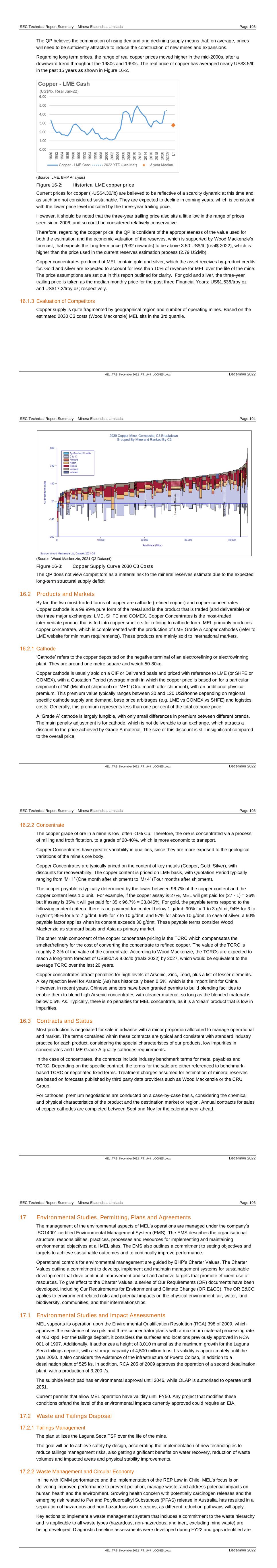 SEC Technical Report Summary – Minera Escondida Limitada Page 193 MEL_TRS_December 2022_RT_v0.9_LOCKED.docx December 2022 The QP believes the combination of rising demand and declining supply means that, on average, prices will need to be sufficiently attractive to induce the construction of new mines and expansions. Regarding long term prices, the range of real copper prices moved higher in the mid-2000s, after a downward trend throughout the 1980s and 1990s. The real price of copper has averaged nearly US$3.5/lb in the past 15 years as shown in Figure 16-2. (Source; LME, BHP Analysis) Figure 16-2: Historical LME copper price Current prices for copper (~US$4.30/lb) are believed to be reflective of a scarcity dynamic at this time and as such are not considered sustainable. They are expected to decline in coming years, which is consistent with the lower price level indicated by the three-year trailing price. However, it should be noted that the three-year trailing price also sits a little low in the range of prices seen since 2006, and so could be considered relatively conservative. Therefore, regarding the copper price, the QP is confident of the appropriateness of the value used for both the estimation and the economic valuation of the reserves, which is supported by Wood Mackenzie’s forecast, that expects the long-term price (2032 onwards) to be above 3.50 US$/lb (real$ 2022), which is higher than the price used in the current reserves estimation process (2.79 US$/lb). Copper concentrates produced at MEL contain gold and silver, which the asset receives by-product credits for. Gold and silver are expected to account for less than 10% of revenue for MEL over the life of the mine. The price assumptions are set out in this report outlined for clarity. For gold and silver, the three-year trailing price is taken as the median monthly price for the past three Financial Years: US$1,536/troy oz and US$17.2/troy oz; respectively. Evaluation of Competitors Copper supply is quite fragmented by geographical region and number of operating mines. Based on the estimated 2030 C3 costs (Wood Mackenzie) MEL sits in the 3rd quartile. SEC Technical Report Summary – Minera Escondida Limitada Page 194 MEL_TRS_December 2022_RT_v0.9_LOCKED.docx December 2022 (Source: Wood Mackenzie, 2021 Q3 Dataset) Figure 16-3: Copper Supply Curve 2030 C3 Costs The QP does not view competitors as a material risk to the mineral reserves estimate due to the expected long-term structural supply deficit. 16.2 Products and Markets By far, the two most-traded forms of copper are cathode (refined copper) and copper concentrates. Copper cathode is a 99.99% pure form of the metal and is the product that is traded (and deliverable) on the three major exchanges: LME, SHFE and COMEX. Copper Concentrates is the most-traded intermediate product that is fed into copper smelters for refining to cathode form. MEL primarily produces copper concentrate, which is complemented with the production of LME Grade A copper cathodes (refer to LME website for minimum requirements). These products are mainly sold to international markets. Cathode ‘Cathode’ refers to the copper deposited on the negative terminal of an electrorefining or electrowinning plant. They are around one metre square and weigh 50-80kg. Copper cathode is usually sold on a CIF or Delivered basis and priced with reference to LME (or SHFE or COMEX), with a Quotation Period (average month in which the copper price is based on for a particular shipment) of ‘M’ (Month of shipment) or ‘M+1’ (One month after shipment), with an additional physical premium. This premium value typically ranges between 30 and 120 US$/tonne depending on regional specific cathode supply and demand, base price arbitrages (e.g. LME vs COMEX vs SHFE) and logistics costs. Generally, this premium represents less than one per cent of the total cathode price. A ‘Grade A’ cathode is largely fungible, with only small differences in premium between different brands. The main penalty adjustment is for cathode, which is not deliverable to an exchange, which attracts a discount to the price achieved by Grade A material. The size of this discount is still insignificant compared to the overall price. SEC Technical Report Summary – Minera Escondida Limitada Page 195 MEL_TRS_December 2022_RT_v0.9_LOCKED.docx December 2022 Concentrate The copper grade of ore in a mine is low, often <1% Cu. Therefore, the ore is concentrated via a process of milling and froth flotation, to a grade of 20-40%, which is more economic to transport. Copper Concentrates have greater variability in qualities, since they are more exposed to the geological variations of the mine’s ore body. Copper Concentrates are typically priced on the content of key metals (Copper, Gold, Silver), with discounts for recoverability. The copper content is priced on LME basis, with Quotation Period typically ranging from ‘M+1’ (One month after shipment) to ‘M+4’ (Four months after shipment). The copper payable is typically determined by the lower between 96.7% of the copper content and the copper content less 1.0 unit. For example, if the copper assay is 27%, MEL will get paid for (27 - 1) = 26% but if assay is 35% it will get paid for 35 x 96.7% = 33.845%. For gold, the payable terms respond to the following content criteria: there is no payment for content below 1 g/dmt; 90% for 1 to 3 g/dmt; 94% for 3 to 5 g/dmt; 95% for 5 to 7 g/dmt; 96% for 7 to 10 g/dmt; and 97% for above 10 g/dmt. In case of silver, a 90% payable factor applies when its content exceeds 30 g/dmt. These payable terms consider Wood Mackenzie as standard basis and Asia as primary market. The other main component of the copper concentrate pricing is the TCRC which compensates the smelter/refinery for the cost of converting the concentrate to refined copper. The value of the TCRC is roughly 2-3% of the value of the concentrate. According to Wood Mackenzie, the TCRCs are ex