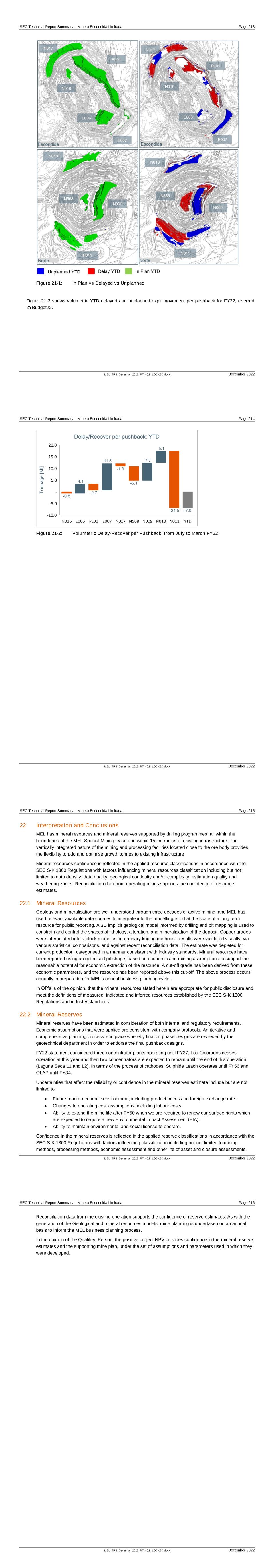 SEC Technical Report Summary – Minera Escondida Limitada Page 213 MEL_TRS_December 2022_RT_v0.9_LOCKED.docx December 2022 Figure 21-1: In Plan vs Delayed vs Unplanned Figure 21-2 shows volumetric YTD delayed and unplanned expit movement per pushback for FY22, referred 2YBudget22. SEC Technical Report Summary – Minera Escondida Limitada Page 214 MEL_TRS_December 2022_RT_v0.9_LOCKED.docx December 2022 Figure 21-2: Volumetric Delay-Recover per Pushback, from July to March FY22 SEC Technical Report Summary – Minera Escondida Limitada Page 215 MEL_TRS_December 2022_RT_v0.9_LOCKED.docx December 2022 22 Interpretation and Conclusions MEL has mineral resources and mineral reserves supported by drilling programmes, all within the boundaries of the MEL Special Mining lease and within 15 km radius of existing infrastructure. The vertically integrated nature of the mining and processing facilities located close to the ore body provides the flexibility to add and optimise growth tonnes to existing infrastructure Mineral resources confidence is reflected in the applied resource classifications in accordance with the SEC S-K 1300 Regulations with factors influencing mineral resources classification including but not limited to data density, data quality, geological continuity and/or complexity, estimation quality and weathering zones. Reconciliation data from operating mines supports the confidence of resource estimates. 22.1 Mineral Resources Geology and mineralisation are well understood through three decades of active mining, and MEL has used relevant available data sources to integrate into the modelling effort at the scale of a long term resource for public reporting. A 3D implicit geological model informed by drilling and pit mapping is used to constrain and control the shapes of lithology, alteration, and mineralisation of the deposit. Copper grades were interpolated into a block model using ordinary kriging methods. Results were validated visually, via various statistical comparisons, and against recent reconciliation data. The estimate was depleted for current production, categorised in a manner consistent with industry standards. Mineral resources have been reported using an optimised pit shape, based on economic and mining assumptions to support the reasonable potential for economic extraction of the resource. A cut-off grade has been derived from these economic parameters, and the resource has been reported above this cut-off. The above process occurs annually in preparation for MEL’s annual business planning cycle. In QP’s is of the opinion, that the mineral resources stated herein are appropriate for public disclosure and meet the definitions of measured, indicated and inferred resources established by the SEC S-K 1300 Regulations and industry standards. 22.2 Mineral Reserves Mineral reserves have been estimated in consideration of both internal and regulatory requirements. Economic assumptions that were applied are consistent with company protocols. An iterative and comprehensive planning process is in place whereby final pit phase designs are reviewed by the geotechnical department in order to endorse the final pushback designs. FY22 statement considered three concentrator plants operating until FY27, Los Colorados ceases operation at this year and then two concentrators are expected to remain until the end of this operation (Laguna Seca L1 and L2). In terms of the process of cathodes, Sulphide Leach operates until FY56 and OLAP until FY34. Uncertainties that affect the reliability or confidence in the mineral reserves estimate include but are not limited to: • Future macro-economic environment, including product prices and foreign exchange rate. • Changes to operating cost assumptions, including labour costs. • Ability to extend the mine life after FY50 when we are required to renew our surface rights which are expected to require a new Environmental Impact Assessment (EIA). • Ability to maintain environmental and social license to operate. Confidence in the mineral reserves is reflected in the applied reserve classifications in accordance with the SEC S-K 1300 Regulations with factors influencing classification including but not limited to mining methods, processing methods, economic assessment and other life of asset and closure assessments. SEC Technical Report Summary – Minera Escondida Limitada Page 216 MEL_TRS_December 2022_RT_v0.9_LOCKED.docx December 2022 Reconciliation data from the existing operation supports the confidence of reserve estimates. As with the generation of the Geological and mineral resources models, mine planning is undertaken on an annual basis to inform the MEL business planning process. In the opinion of the Qualified Person, the positive project NPV provides confidence in the mineral reserve estimates and the supporting mine plan, under the set of assumptions and parameters used in which they were developed.