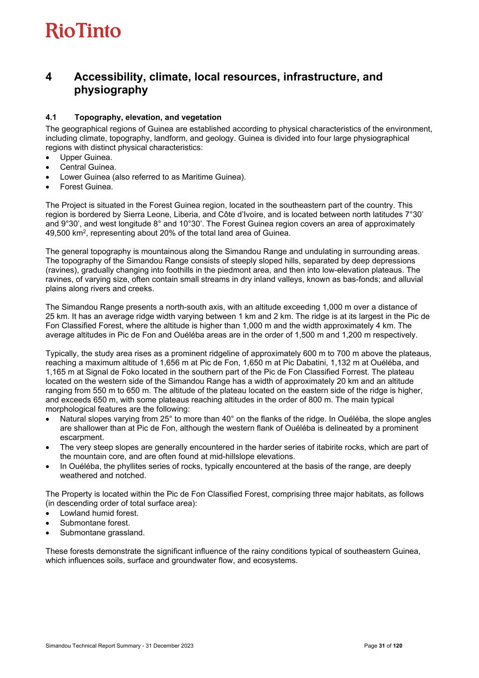Simandou Technical Report Summary - 31 December 2023 Page 31 of 120 4 Accessibility, climate, local resources, infrastructure, and physiography 4.1 Topography, elevation, and vegetation The geographical regions of Guinea are established according to physical characteristics of the environment, including climate, topography, landform, and geology. Guinea is divided into four large physiographical regions with distinct physical characteristics: • Upper Guinea. • Central Guinea. • Lower Guinea (also referred to as Maritime Guinea). • Forest Guinea. The Project is situated in the Forest Guinea region, located in the southeastern part of the country. This region is bordered by Sierra Leone, Liberia, and Côte d’Ivoire, and is located between north latitudes 7°30’ and 9°30’, and west longitude 8° and 10°30’. The Forest Guinea region covers an area of approximately 49,500 km2, representing about 20% of the total land area of Guinea. The general topography is mountainous along the Simandou Range and undulating in surrounding areas. The topography of the Simandou Range consists of steeply sloped hills, separated by deep depressions (ravines), gradually changing into foothills in the piedmont area, and then into low-elevation plateaus. The ravines, of varying size, often contain small streams in dry inland valleys, known as bas-fonds; and alluvial plains along rivers and creeks. The Simandou Range presents a north-south axis, with an altitude exceeding 1,000 m over a distance of 25 km. It has an average ridge width varying between 1 km and 2 km. The ridge is at its largest in the Pic de Fon Classified Forest, where the altitude is higher than 1,000 m and the width approximately 4 km. The average altitudes in Pic de Fon and Ouéléba areas are in the order of 1,500 m and 1,200 m respectively. Typically, the study area rises as a prominent ridgeline of approximately 600 m to 700 m above the plateaus, reaching a maximum altitude of 1,656 m at Pic de Fon, 1,650 m at Pic Dabatini, 1,132 m at Ouéléba, and 1,165 m at Signal de Foko located in the southern part of the Pic de Fon Classified Forrest. The plateau located on the western side of the Simandou Range has a width of approximately 20 km and an altitude ranging from 550 m to 650 m. The altitude of the plateau located on the eastern side of the ridge is higher, and exceeds 650 m, with some plateaus reaching altitudes in the order of 800 m. The main typical morphological features are the following: • Natural slopes varying from 25° to more than 40° on the flanks of the ridge. In Ouéléba, the slope angles are shallower than at Pic de Fon, although the western flank of Ouéléba is delineated by a prominent escarpment. • The very steep slopes are generally encountered in the harder series of itabirite rocks, which are part of the mountain core, and are often found at mid-hillslope elevations. • In Ouéléba, the phyllites series of rocks, typically encountered at the basis of the range, are deeply weathered and notched. The Property is located within the Pic de Fon Classified Forest, comprising three major habitats, as follows (in descending order of total surface area): • Lowland humid forest. • Submontane forest. • Submontane grassland. These forests demonstrate the significant influence of the rainy conditions typical of southeastern Guinea, which influences soils, surface and groundwater flow, and ecosystems.