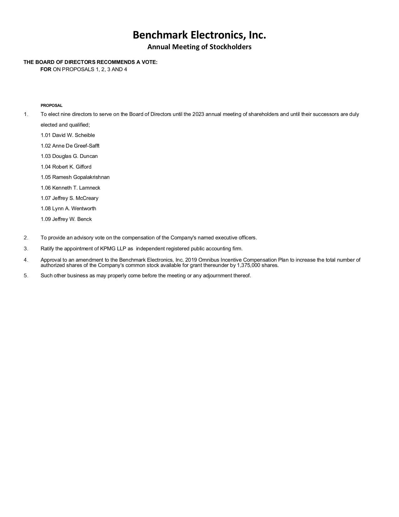 Benchmark Electronics, Inc. Annual Meeting of Stockholders THE BOARD OF DIRECTORS RECOMMENDS A VOTE: FOR ON PROPOSALS 1, 2, 3 AND 4 PROPOSAL 1. To elect nine directors to serve on the Board of Directors until the 2023 annual meeting of shareholders and until their successors are duly elected and qualified; 1.01 David W. Scheible 1.02 Anne De Greef-Safft 1.03 Douglas G. Duncan 1.04 Robert K. Gifford 1.05 Ramesh Gopalakrishnan 1.06 Kenneth T. Lamneck 1.07 Jeffrey S. McCreary 1.08 Lynn A. Wentworth 1.09 Jeffrey W. Benck 2. To provide an advisory vote on the compensation of the Company's named executive officers. 3. Ratify the appointment of KPMG LLP as independent registered public accounting firm. 4. Approval to an amendment to the Benchmark Electronics, Inc. 2019 Omnibus Incentive Compensation Plan to increase the total number of authorized shares of the Company's common stock available for grant thereunder by 1,375,000 shares. 5. Such other business as may properly come before the meeting or any adjournment thereof.