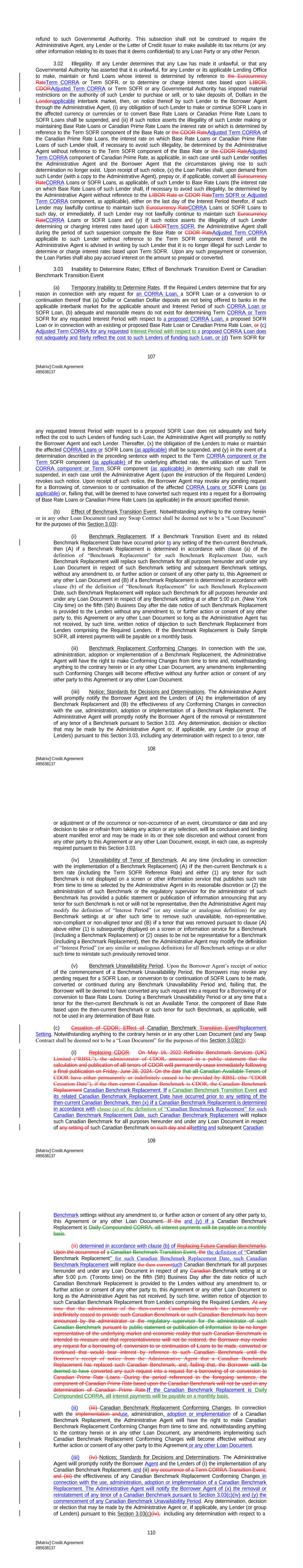 11 [Matrix] Credit Agreement #85638137 in respect of any such Loan, or any other dealings to be carried out pursuant to this Agreement in respect of any such Loan any day that is also a U.S. Government Securities Business Day. “Canadian Available Tenor” means, as of any date of determination and with respect to the then-current Canadian Benchmark, as applicable, (x) if the then-current Canadian Benchmark is a term rate, any tenor for such Canadian Benchmark that is or may be used for determining the length of an Interest Period or (y) otherwise, any payment period for interest calculated with reference to such Canadian Benchmark, as applicable, pursuant to this Agreement as of such date. “Canadian Benchmark” means, initially, CDORthe Term CORRA Reference Rate; provided that if a replacement of the Canadian Benchmark Transition Event has occurred pursuant to Section 3.03(c)with respect to the Term CORRA Reference Rate or the then-current Canadian Benchmark, then “Canadian Benchmark” means the applicable Canadian Benchmark Replacement to the extent that such Canadian Benchmark Replacement has replaced such prior benchmark rate. Any reference to “Canadian Benchmark” shall include, as applicable, the published component used in the calculation thereof pursuant to Section 3.03(c)(i). “Canadian Benchmark Replacement” means, forwith respect to any Canadian Available Tenor:Benchmark Transition Event, (a) where a Canadian Benchmark Transition Event has occurred with respect to the Term CORRA Reference Rate, Daily Compounded CORRA; and (1) For purposes of Section 3.03(c)(i), the first alternative set forth below that can be determined by the Administrative Agent: (a) the sum of: (i) Term CORRA and (ii) 0.29547% (29.547 basis points) for a Canadian Available Tenor of one-month’s duration, and 0.32138% (32.138 basis points) for a Canadian Available Tenor of three-months’ duration, or (a) the sum of: (i) Daily Compounded CORRA and (ii) 0.29547% (29.547 basis points) for a Canadian Available Tenor of one-month’s duration, and 0.32138% (32.138 basis points) for a Canadian Available Tenor of three-months’ duration; andwhere a Canadian Benchmark Transition Event has occurred with respect to a Canadian Benchmark other than the Term CORRA Reference Rate, the sum of: (i) the alternate benchmark rate that has been selected by the Administrative Agent and the Canadian Borrowers giving due consideration to (A) any selection or recommendation of a replacement benchmark rate or the mechanism for determining such a rate by the Canadian Relevant Governmental Body or (B) any evolving or then-prevailing market convention for determining a benchmark rate as a replacement to the then-current Canadian Benchmark for Canadian Dollar-denominated syndicated credit facilities and (ii) the related Canadian Benchmark Replacement Adjustment. (2) For purposes of Section 3.03(c)(ii), the sum of (a) the alternate benchmark rate and (b) an adjustment (which may be a positive or negative value or zero), in each case, that has been selected by the Administrative Agent and the Borrower as the replacement for such Canadian Available Tenor of such Canadian Benchmark giving due consideration to any evolving or then-prevailing market convention, including any applicable recommendations made by the Canadian Relevant Governmental Body, for Canadian dollar-denominated syndicated credit facilities at such time; 12 [Matrix] Credit Agreement #85638137 provided that, ifIf the Canadian Benchmark Replacement as determined pursuant to clause (1a) or (2b) above would be less than the Floor, the Canadian Benchmark Replacement will be deemed to be the Floor for the purposes of this Agreement and the other Loan Documents. “Canadian Benchmark Replacement Conforming Changes” means, with respect to any Canadian Benchmark Replacement, any technical, administrative or operational changes (including changes to the definition of “Business Day,” the definition of “Canadian Prime Rate,” the definition of “Interest Period,” timing and frequency of determining rates and making payments of interest, timing of borrowing requests or prepayment, conversion or continuation notices, the applicability and length of lookback periods, the applicability of breakage provisions, and other technical, administrative or operational matters) that the Administrative Agent decides may be appropriate to reflect the adoption and implementation of such Canadian Benchmark Replacement and to permit the administration thereof by the Administrative Agent in a manner substantially consistent with market practice (or, if the Administrative Agent decides that adoption of any portion of such market practice is not administratively feasible or if the Administrative Agent determines that no market practice for the administration of such Canadian Benchmark Replacement exists, in such other manner of administration as the Administrative Agent decides is reasonably necessary in connection with the administration of this Agreement and the other Loan Documents). “Canadian Benchmark Replacement Adjustment” means, with respect to any replacement of the then-current Canadian Benchmark with a Canadian Unadjusted Benchmark Replacement, the spread adjustment, or method for calculating or determining such spread adjustment, (which may be a positive or negative value or zero) that has been selected by the Administrative Agent and the Canadian Borrowers giving due consideration to (a) any selection or recommendation of a spread adjustment, or method for calculating or determining such spread adjustment, for the replacement of such Canadian Benchmark with the applicable Canadian Unadjusted Benchmark Replacement by the Canadian Relevant Governmental Body or (b) any evolving or then-prevailing market convention for determining a spread adjustment, or method for calculating or determining such spread adjustment, for the replacement of such Canadian Benchmark with