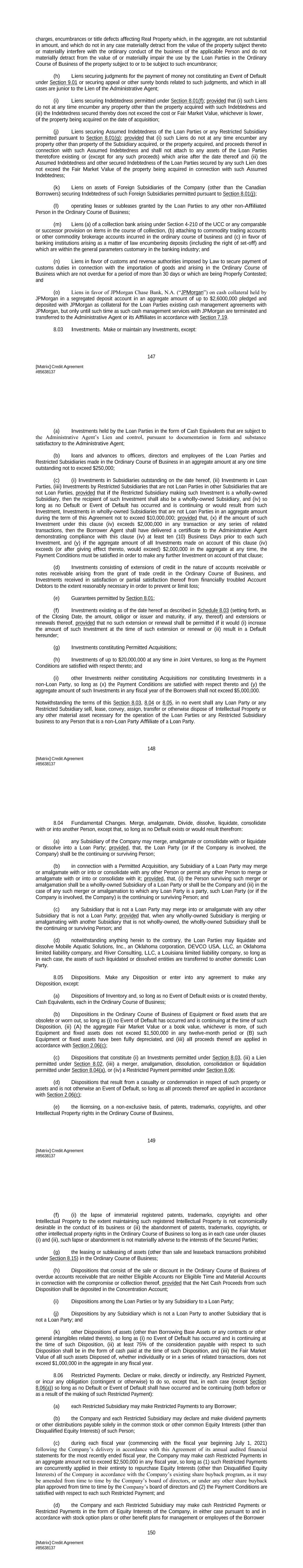 123 [Matrix] Credit Agreement #85638137 (c) The Administrative Agent and, if applicable, the Letter of Credit Issuer or the Swing Line Lender shall have received a Request for Credit Extension in accordance with the requirements hereof. (d) No prepayment would be required under Section 7.20 (on the next Business Day or otherwise) as a result of such Credit Extension, as determined on a pro forma basis as of the end of the Business Day on which such Credit Extension is to be made. Each Request for Credit Extension (other than one requesting only a conversion of Loans to the other Type or a continuation of SOFR Loans) submitted by the Borrower Agent shall be deemed to be a representation and warranty that the conditions specified above in this Section 5.02 have been satisfied on and as of the date of the applicable Credit Extension. As an additional condition to any Credit Extension, Administrative Agent may request any other information, certification, document, instrument or agreement as it deems appropriate. ARTICLE VI REPRESENTATIONS AND WARRANTIES To induce the Secured Parties to enter into this Agreement and to make Loans and to issue Letters of Credit hereunder, each Loan Party represents and warrants to the Administrative Agent and the Lenders, subject to the limitation set forth in Section 5.02(a), that: 6.01 Existence, Qualification and Power. Each Loan Party and each Restricted Subsidiary (a) is a corporation, partnership, unlimited liability company or limited liability company duly organized or formed, validly existing and in good standing under the Laws of the jurisdiction of its incorporation, organization or formation, (b) has all requisite power and authority and all requisite governmental licenses, authorizations, consents and approvals to (i) own or lease its assets and carry on its business as is now being conducted and (ii) execute, deliver and perform its obligations under the Loan Documents to which it is a party and to consummate the Transactions to which it is a party, and (c) is duly qualified and is licensed and in good standing under the Laws of each jurisdiction where its ownership, lease or operation of properties or the conduct of its business requires such qualification or license; except in each case referred to in clause (b)(i), or (c), to the extent that failure to do so could not, individually or in the aggregate, reasonably be expected to have a Material Adverse Effect. No Loan Party is (a) an Affected Financial Institution or (b) a Covered Entity (as defined in Section 11.21(b)). 6.02 Authorization; No Contravention. The execution, delivery and performance by each Loan Party of each Loan Document to which such Person is party, and the consummation of the Transactions, have been duly authorized by all necessary corporate or other organizational action, and do not and will not (a) contravene the terms of the Organizational Documents of any such Person; (b) conflict with or result in any breach or contravention of, or the creation of any Lien under (i) any Contractual Obligation to which such Person is a party or (ii) any order, injunction, writ or decree of any Governmental Authority or any arbitral award to which such Person or its property is subject; or (c) violate any Law. 6.03 Governmental Authorization; Other Consents. No approval, consent, exemption, authorization, or other action by, or notice to, or filing with, any Governmental Authority or any other Person is necessary or required in connection with (a) the execution, delivery or performance by, or enforcement against, any Loan Party of this Agreement or any other Loan Document or the consummation of the Transactions, (b) the grant by any Loan Party of the Liens granted by it pursuant to the Loan Documents, (c) the perfection or maintenance of the Liens created under the Loan Documents 124 [Matrix] Credit Agreement #85638137 (including the first priority nature thereof) or (d) the exercise by the Administrative Agent or any Lender of its rights under the Loan Documents or the remedies in respect of the Collateral pursuant to the Loan Documents, except for the filing of a description of the entry into a material definitive agreement on either a current Report on Form 8-K or Quarterly Report on form 10-Q with the SEC, all of which have been duly obtained, taken, given or made and are in full force and effect. 6.04 Binding Effect. This Agreement has been, and each other Loan Document, when delivered hereunder, will have been, duly executed and delivered by each Loan Party that is party thereto. This Agreement constitutes, and each other Loan Document when so delivered will constitute, a legal, valid and binding obligation of such Loan Party, enforceable against each Loan Party that is party thereto in accordance with its terms, except (a) as rights to indemnification hereunder may be limited by applicable Law and (b) as the enforcement hereof may be limited by any applicable Debtor Relief Laws or by general equitable principles. 6.05 Financial Statements; No Material Adverse Effect. (a) The Audited Financial Statements (i) were prepared in accordance with GAAP consistently applied throughout the period covered thereby, except as otherwise expressly noted therein; (ii) fairly present the financial condition of the Company and its Subsidiaries as of the date thereof and their results of operations for the period covered thereby in accordance with GAAP consistently applied throughout the period covered thereby, except as otherwise expressly noted therein; (iii) show all material Indebtedness and other liabilities, direct or contingent, of the Company and its Subsidiaries as of the date thereof, including liabilities for taxes, material commitments and Indebtedness, in each case, to the extent required to be reflected thereon pursuant to GAAP. (b) The unaudited Consolidated balance sheet of the Company and its Subsidiaries dated as of June 30, 2021, and the related Consolidated statements of income o