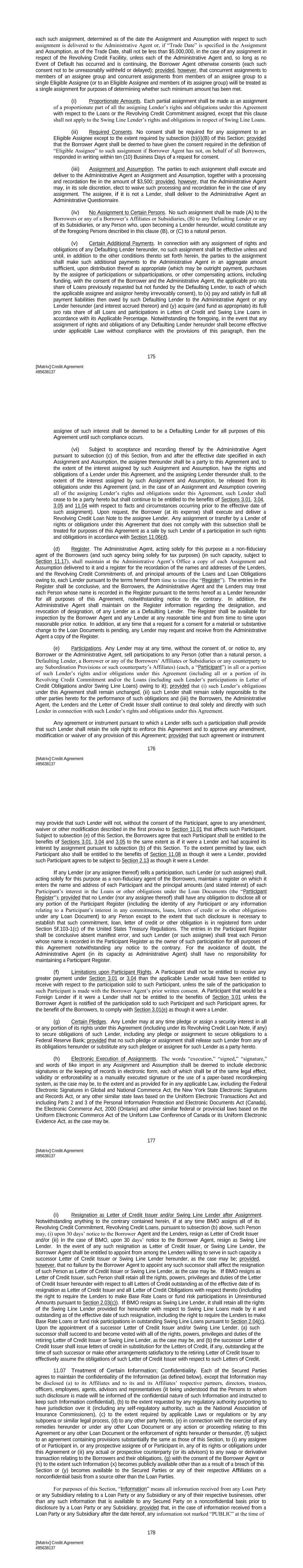 175 [Matrix] Credit Agreement #85638137 each such assignment, determined as of the date the Assignment and Assumption with respect to such assignment is delivered to the Administrative Agent or, if “Trade Date” is specified in the Assignment and Assumption, as of the Trade Date, shall not be less than $5,000,000, in the case of any assignment in respect of the Revolving Credit Facility, unless each of the Administrative Agent and, so long as no Event of Default has occurred and is continuing, the Borrower Agent otherwise consents (each such consent not to be unreasonably withheld or delayed); provided, however, that concurrent assignments to members of an assignee group and concurrent assignments from members of an assignee group to a single Eligible Assignee (or to an Eligible Assignee and members of its assignee group) will be treated as a single assignment for purposes of determining whether such minimum amount has been met. (i) Proportionate Amounts. Each partial assignment shall be made as an assignment of a proportionate part of all the assigning Lender’s rights and obligations under this Agreement with respect to the Loans or the Revolving Credit Commitment assigned, except that this clause shall not apply to the Swing Line Lender’s rights and obligations in respect of Swing Line Loans. (ii) Required Consents. No consent shall be required for any assignment to an Eligible Assignee except to the extent required by subsection (b)(i)(B) of this Section; provided that the Borrower Agent shall be deemed to have given the consent required in the definition of “Eligible Assignee” to such assignment if Borrower Agent has not, on behalf of all Borrowers, responded in writing within ten (10) Business Days of a request for consent. (iii) Assignment and Assumption. The parties to each assignment shall execute and deliver to the Administrative Agent an Assignment and Assumption, together with a processing and recordation fee in the amount of $3,500; provided, however, that the Administrative Agent may, in its sole discretion, elect to waive such processing and recordation fee in the case of any assignment. The assignee, if it is not a Lender, shall deliver to the Administrative Agent an Administrative Questionnaire. (iv) No Assignment to Certain Persons. No such assignment shall be made (A) to the Borrowers or any of a Borrower’s Affiliates or Subsidiaries, (B) to any Defaulting Lender or any of its Subsidiaries, or any Person who, upon becoming a Lender hereunder, would constitute any of the foregoing Persons described in this clause (B), or (C) to a natural person. (v) Certain Additional Payments. In connection with any assignment of rights and obligations of any Defaulting Lender hereunder, no such assignment shall be effective unless and until, in addition to the other conditions thereto set forth herein, the parties to the assignment shall make such additional payments to the Administrative Agent in an aggregate amount sufficient, upon distribution thereof as appropriate (which may be outright payment, purchases by the assignee of participations or subparticipations, or other compensating actions, including funding, with the consent of the Borrower and the Administrative Agent, the applicable pro rata share of Loans previously requested but not funded by the Defaulting Lender, to each of which the applicable assignee and assignor hereby irrevocably consent), to (x) pay and satisfy in full all payment liabilities then owed by such Defaulting Lender to the Administrative Agent or any Lender hereunder (and interest accrued thereon) and (y) acquire (and fund as appropriate) its full pro rata share of all Loans and participations in Letters of Credit and Swing Line Loans in accordance with its Applicable Percentage. Notwithstanding the foregoing, in the event that any assignment of rights and obligations of any Defaulting Lender hereunder shall become effective under applicable Law without compliance with the provisions of this paragraph, then the 176 [Matrix] Credit Agreement #85638137 assignee of such interest shall be deemed to be a Defaulting Lender for all purposes of this Agreement until such compliance occurs. (vi) Subject to acceptance and recording thereof by the Administrative Agent pursuant to subsection (c) of this Section, from and after the effective date specified in each Assignment and Assumption, the assignee thereunder shall be a party to this Agreement and, to the extent of the interest assigned by such Assignment and Assumption, have the rights and obligations of a Lender under this Agreement, and the assigning Lender thereunder shall, to the extent of the interest assigned by such Assignment and Assumption, be released from its obligations under this Agreement (and, in the case of an Assignment and Assumption covering all of the assigning Lender’s rights and obligations under this Agreement, such Lender shall cease to be a party hereto but shall continue to be entitled to the benefits of Sections 3.01, 3.04, 3.05 and 11.04 with respect to facts and circumstances occurring prior to the effective date of such assignment). Upon request, the Borrower (at its expense) shall execute and deliver a Revolving Credit Loan Note to the assignee Lender. Any assignment or transfer by a Lender of rights or obligations under this Agreement that does not comply with this subsection shall be treated for purposes of this Agreement as a sale by such Lender of a participation in such rights and obligations in accordance with Section 11.06(d). (d) Register. The Administrative Agent, acting solely for this purpose as a non-fiduciary agent of the Borrowers (and such agency being solely for tax purposes) (in such capacity, subject to Section 11.17), shall maintain at the Administrative Agent’s Office a copy of each Assignment and Assumption delivered to it and a register for the recordation of the names and addresses of the Lenders, and the Revolving Credit Commitments of, and pr