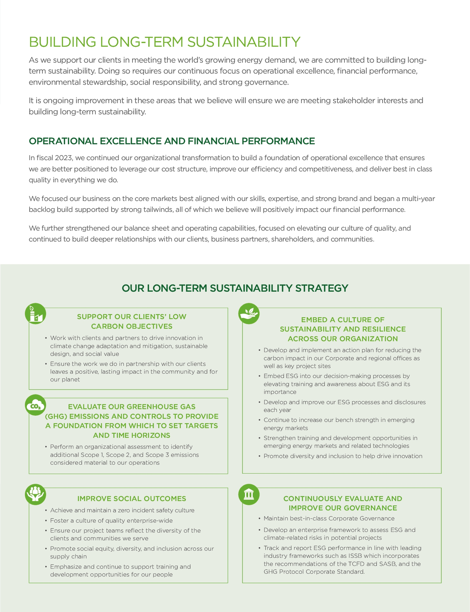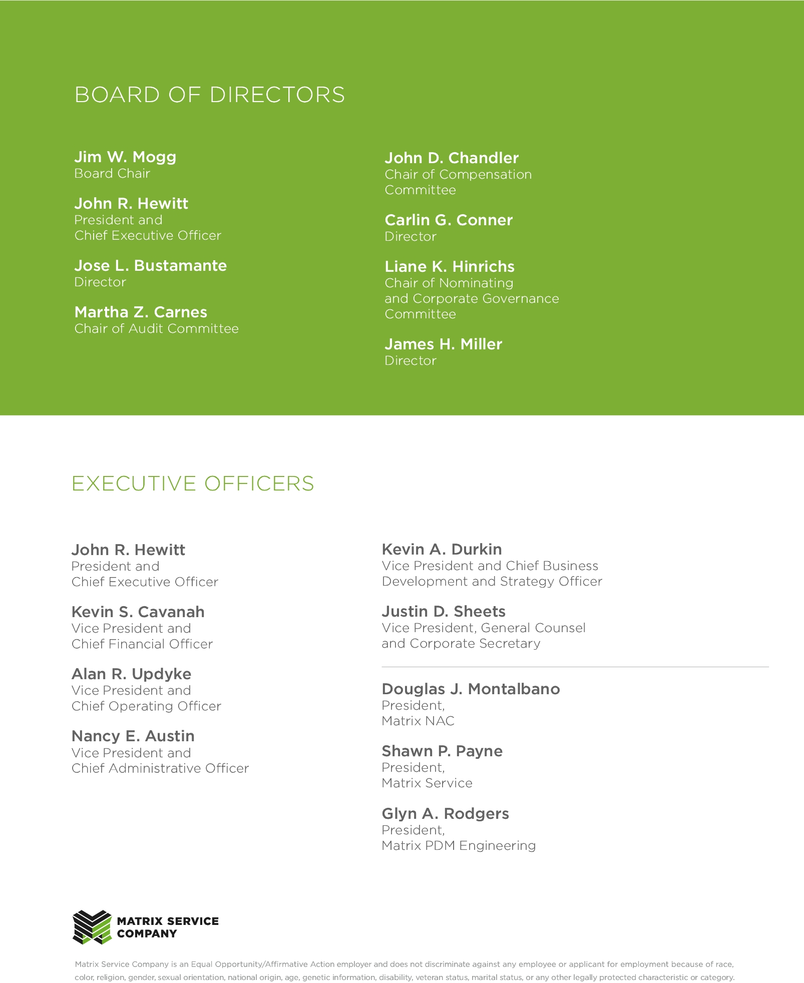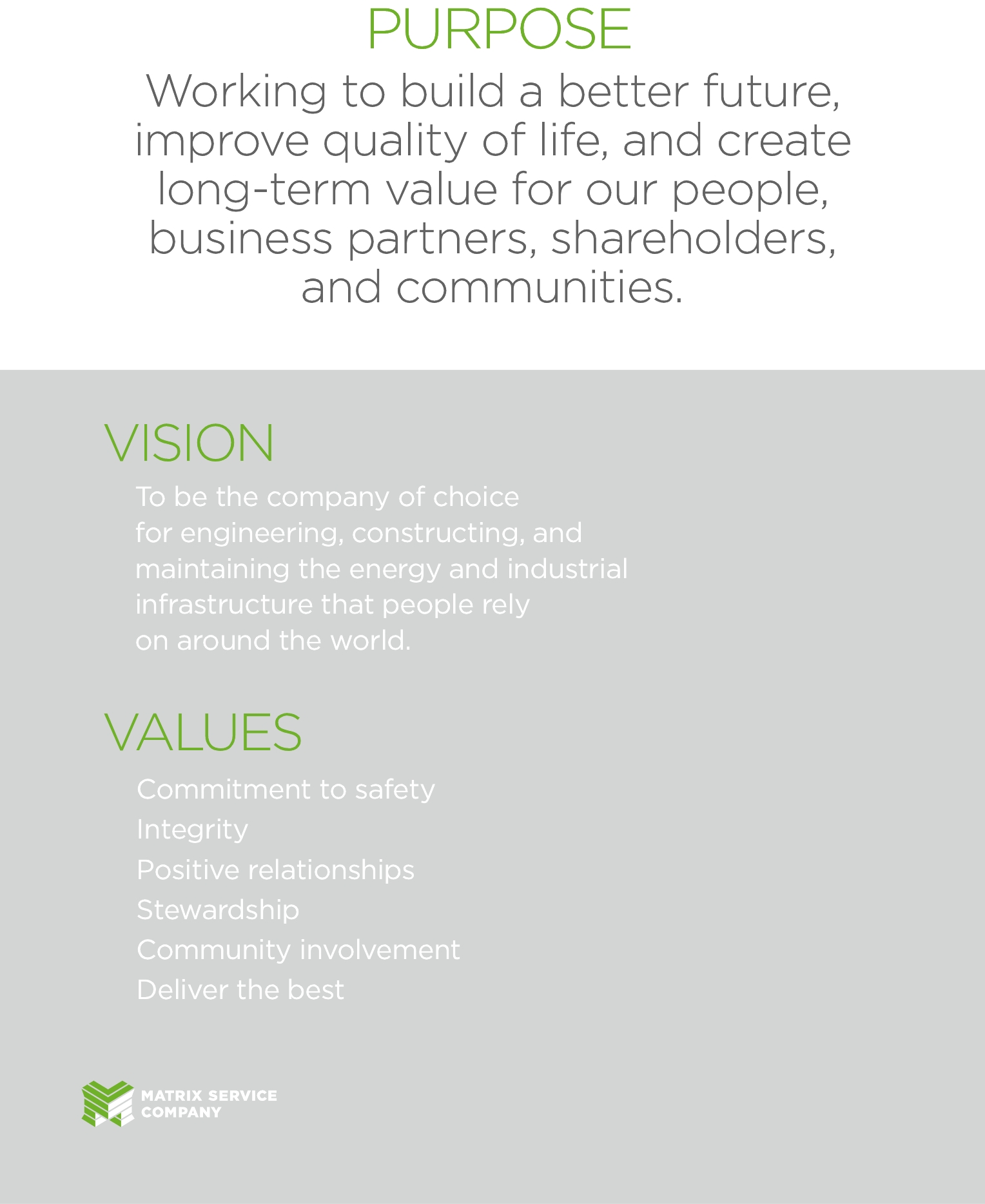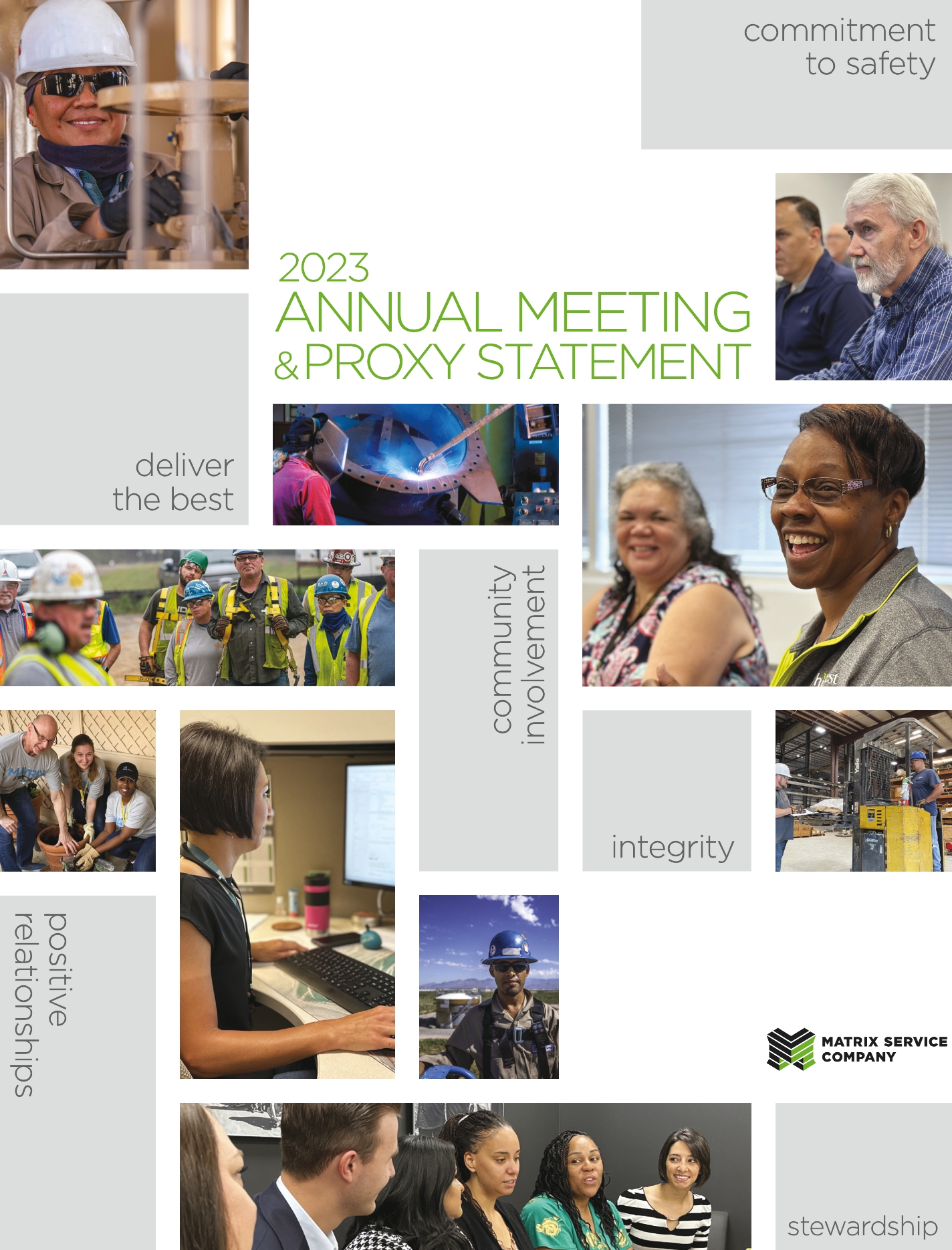 In fiscal 2023, we achieved a consolidated TRIR of 0.73 while Matrix Service Inc. achieved a TRIR of 0.63. Also, the Observation Trending Feedback percentages achieved by Matrix Service Company, Matrix Service Inc. and Matrix PDM Engineering were 89%, 88% and 100%, respectively.