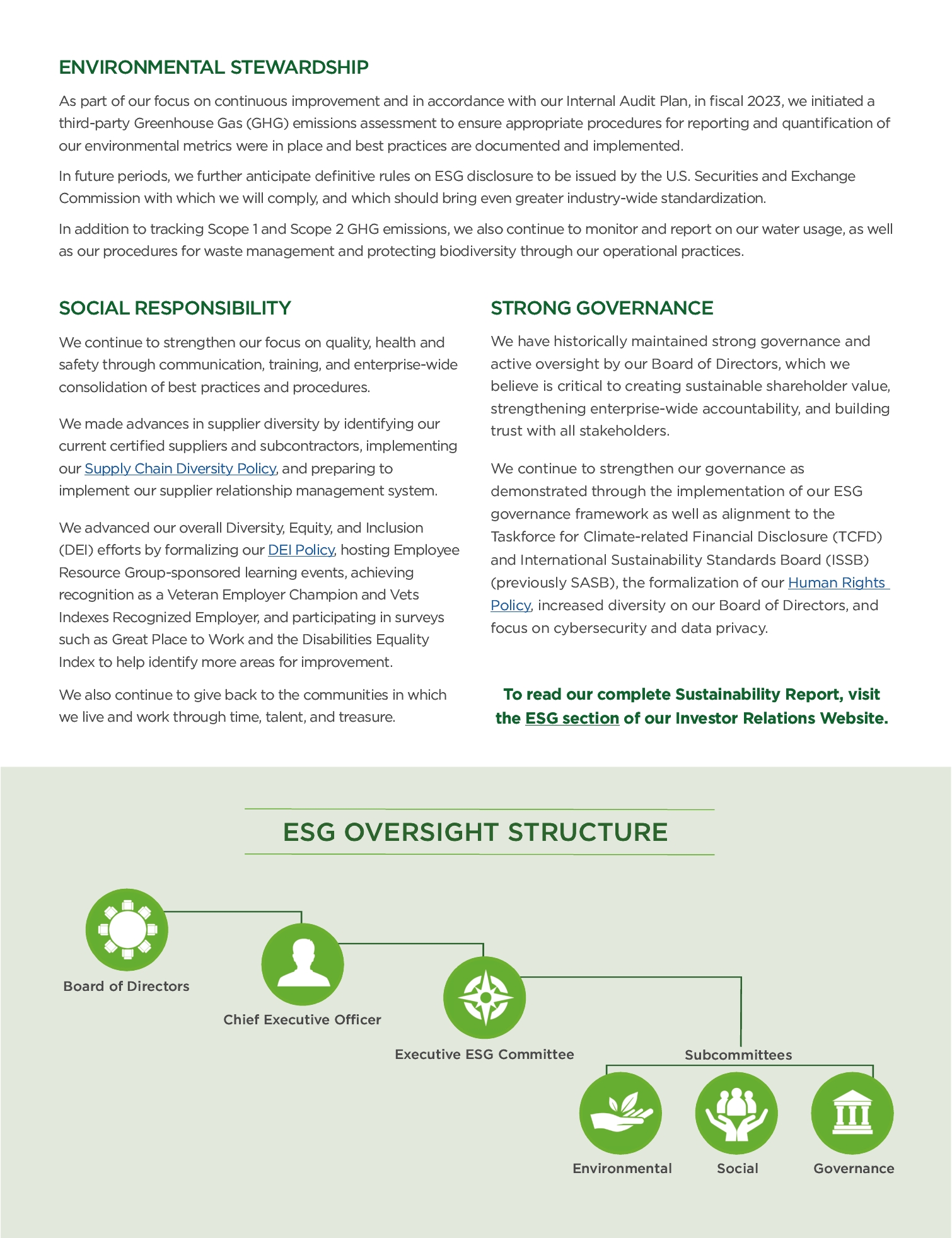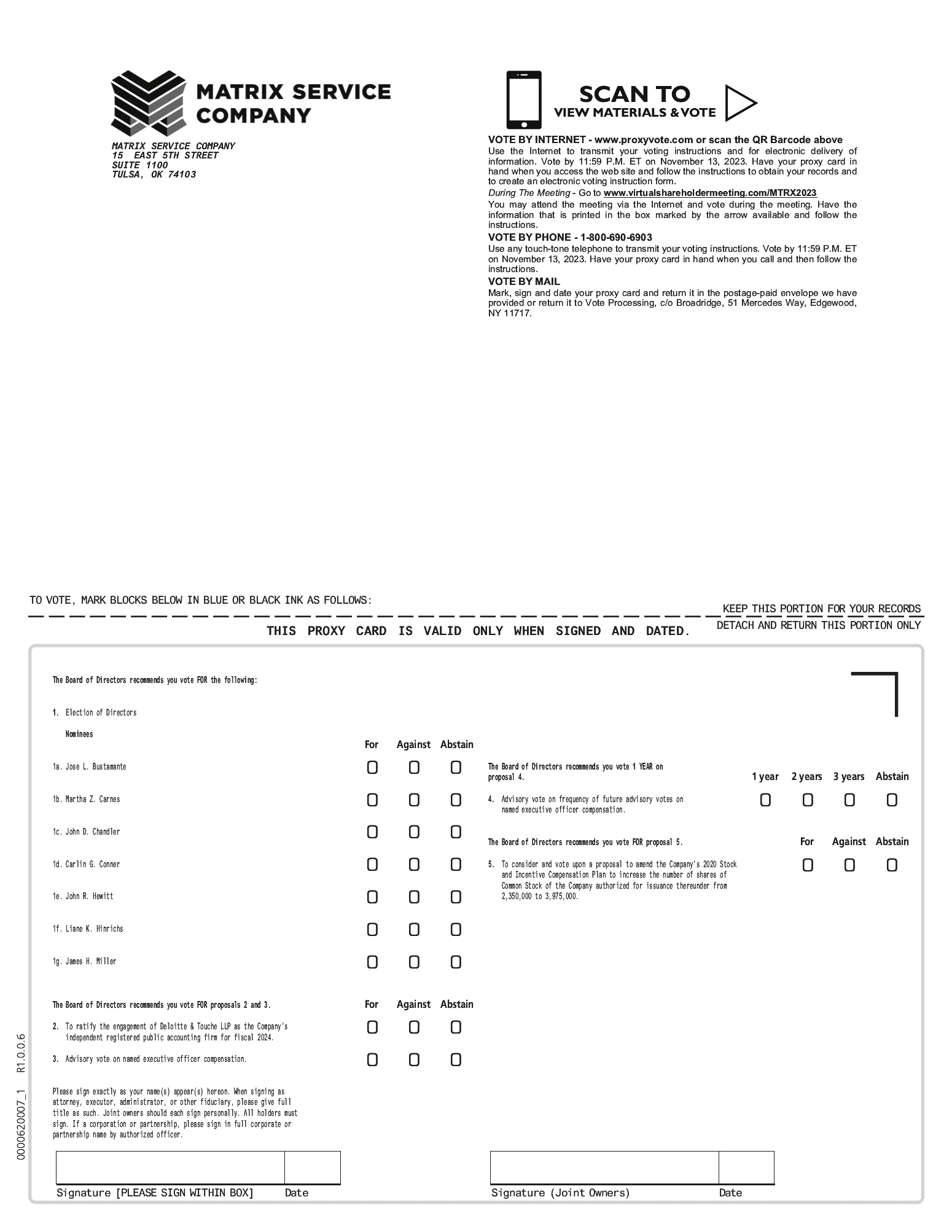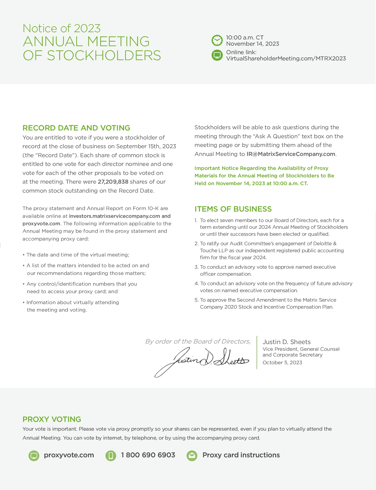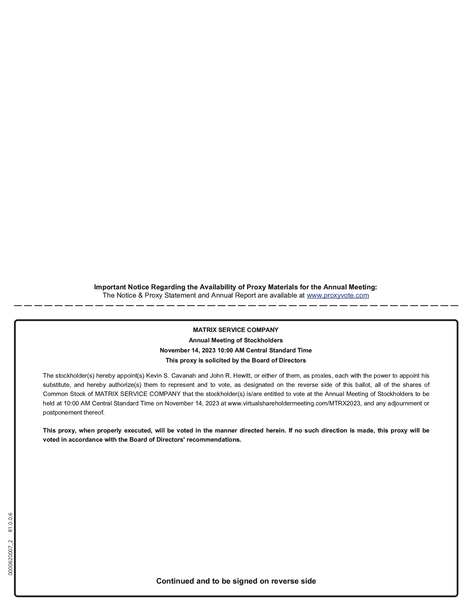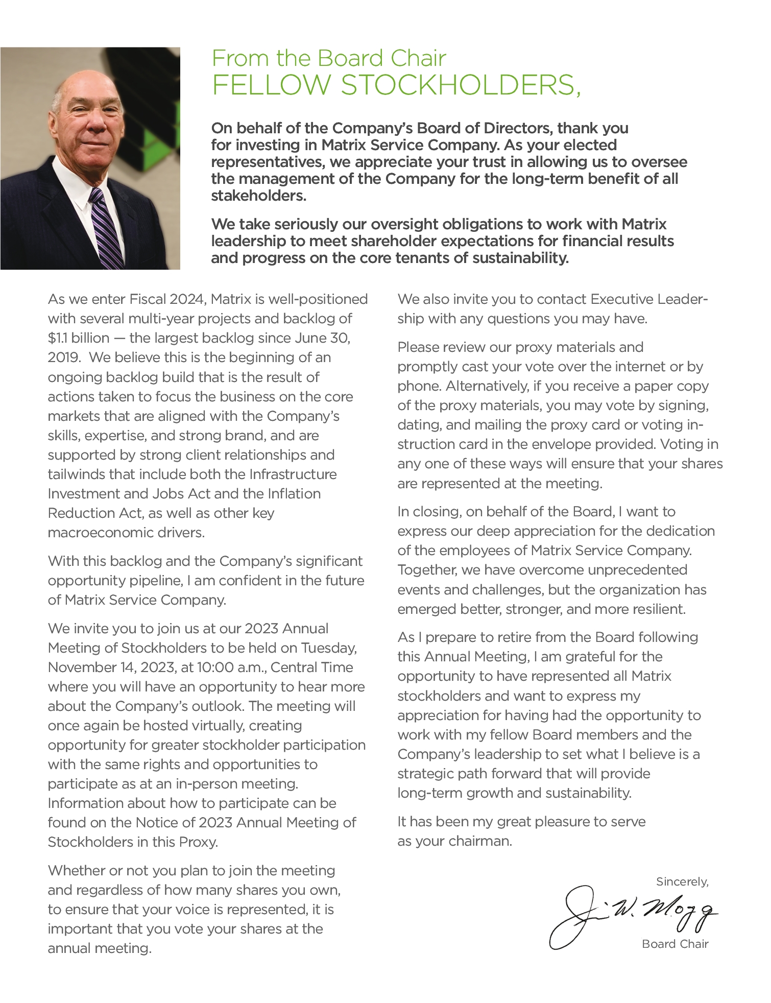 In fiscal 2023, we achieved a consolidated TRIR of 0.73 while Matrix Service Inc. achieved a TRIR of 0.63. Also, the Observation Trending Feedback percentages achieved by Matrix Service Company, Matrix Service Inc. and Matrix PDM Engineering were 89%, 88% and 100%, respectively.