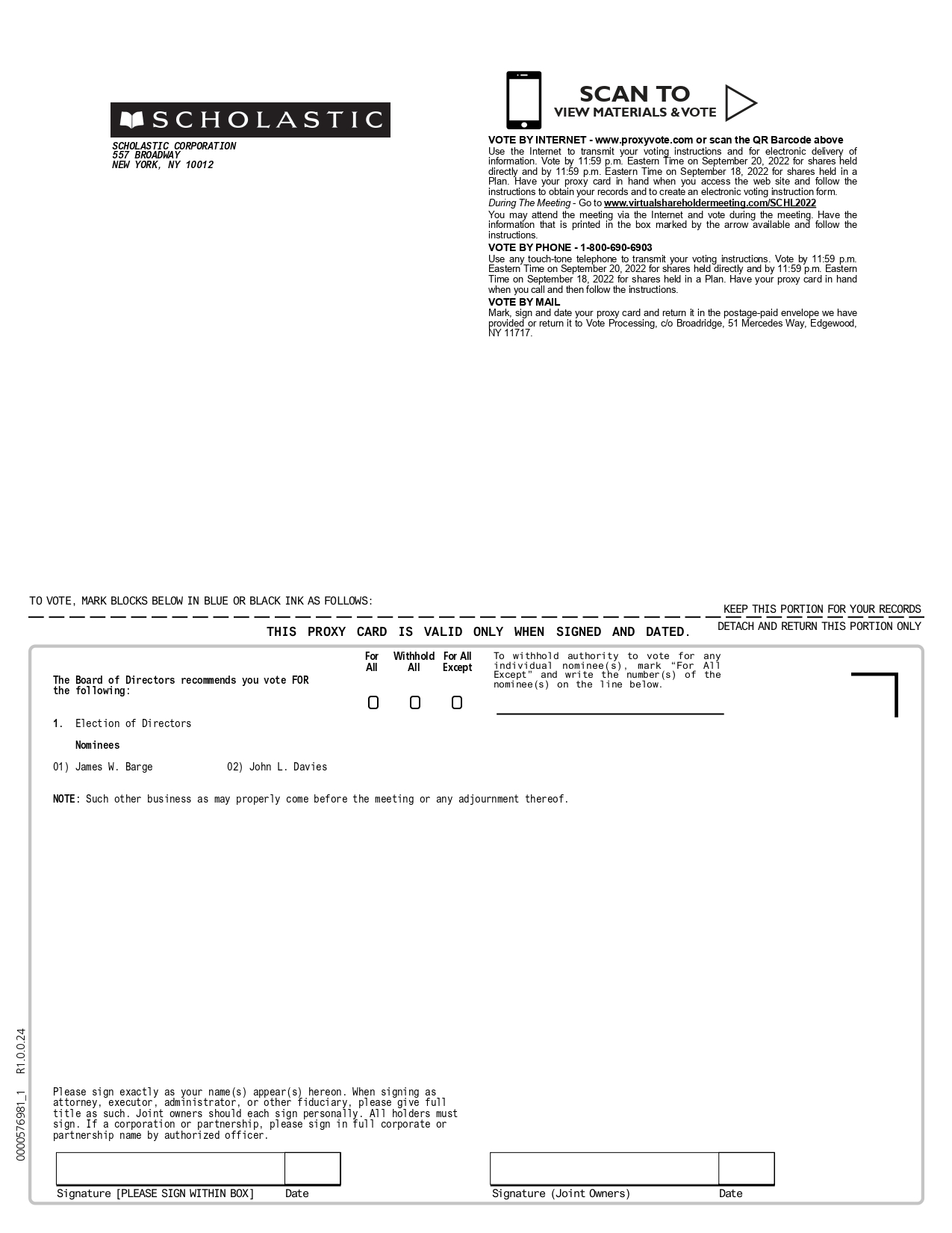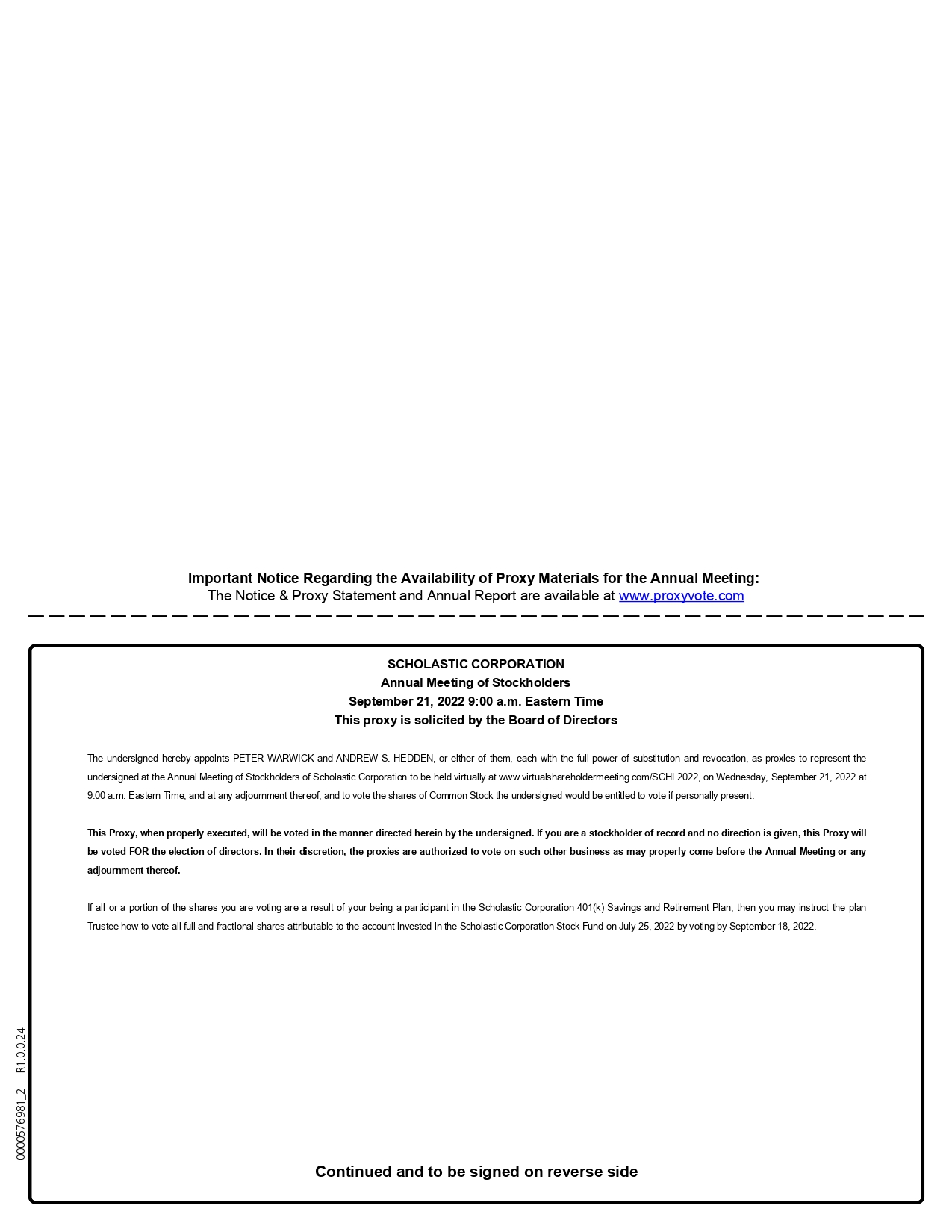 0000576981_2 R1.0.0.24 Important Notice Regarding the Availability of Proxy Materials for the Annual Meeting: The Notice & Proxy Statement and Annual Report are available at www.proxyvote.com SCHOLASTIC CORPORATION Annual Meeting of Stockholders September 21, 2022 9:00 a.m. Eastern Time This proxy is solicited by the Board of Directors The undersigned hereby appoints PETER WARWICK and ANDREW S. HEDDEN, or either of them, each with the full power of substitution and revocation, as proxies to represent the undersigned at the Annual Meeting of Stockholders of Scholastic Corporation to be held virtually at www.virtualshareholdermeeting.com/SCHL2022, on Wednesday, September 21, 2022 at 9:00 a.m. Eastern Time, and at any adjournment thereof, and to vote the shares of Common Stock the undersigned would be entitled to vote if personally present. This Proxy, when properly executed, will be voted in the manner directed herein by the undersigned. If you are a stockholder of record and no direction is given, this Proxy will be voted FOR the election of directors. In their discretion, the proxies are authorized to vote on such other business as may properly come before the Annual Meeting or any adjournment thereof. If all or a portion of the shares you are voting are a result of your being a participant in the Scholastic Corporation 401(k) Savings and Retirement Plan, then you may instruct the plan Trustee how to vote all full and fractional shares attributable to the account invested in the Scholastic Corporation Stock Fund on July 25, 2022 by voting by September 18, 2022. Continued and to be signed on reverse side