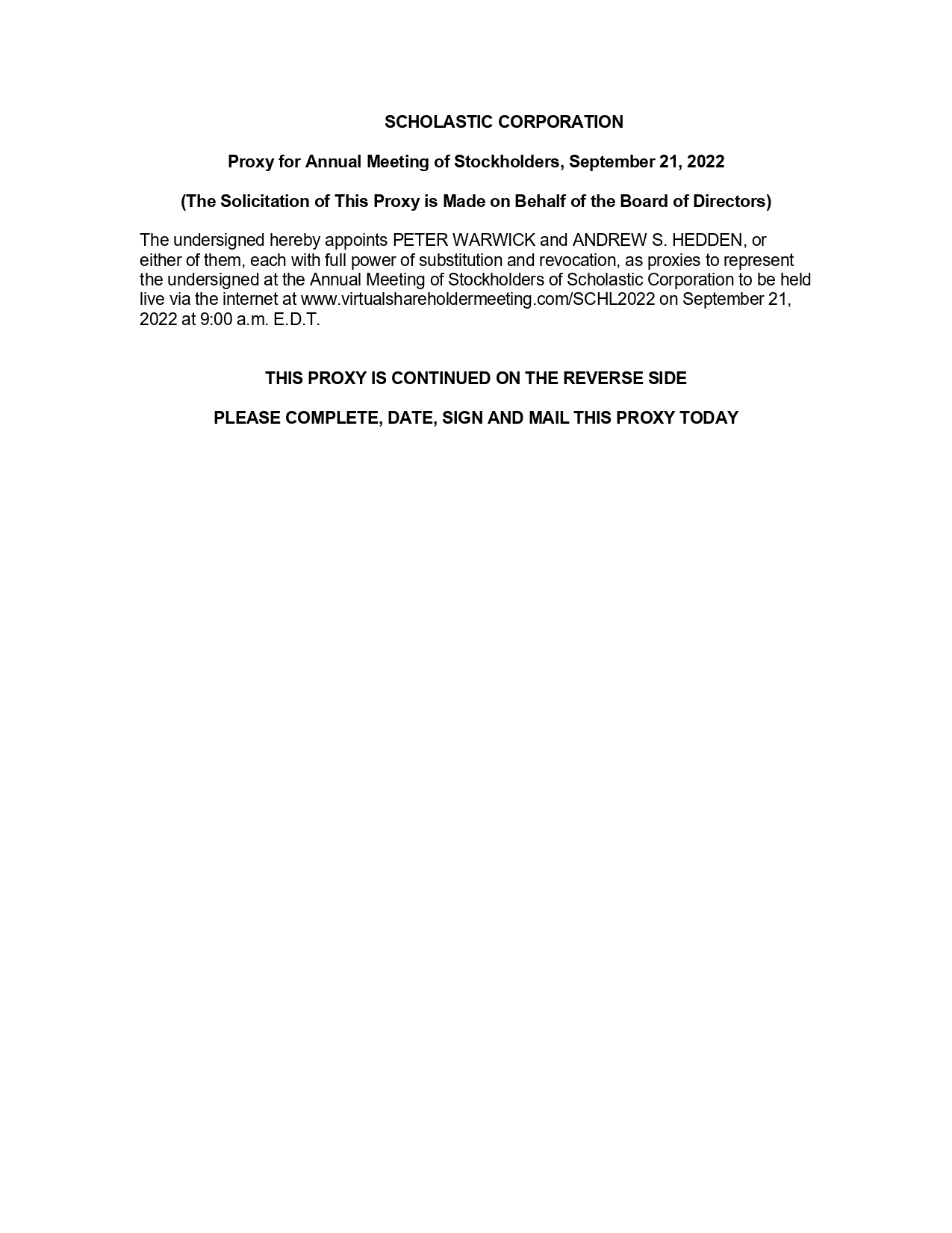 SCHOLASTIC CORPORATION Proxy for Annual Meeting of Stockholders, September 21, 2022 (The Solicitation of This Proxy is Made on Behalf of the Board of Directors) The undersigned hereby appoints PETER WARWICK and ANDREW S. HEDDEN, or either of them, each with full power of substitution and revocation, as proxies to represent the undersigned at the Annual Meeting of Stockholders of Scholastic Corporation to be held live via the internet at www.virtualshareholdermeeting.com/SCHL2022 on September 21, 2022 at 9:00 a.m. E.D.T. THIS PROXY IS CONTINUED ON THE REVERSE SIDE PLEASE COMPLETE, DATE, SIGN AND MAIL THIS PROXY TODAY