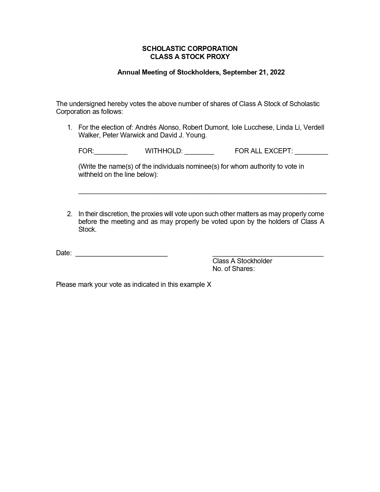 SCHOLASTIC CORPORATION CLASS A STOCK PROXY Annual Meeting of Stockholders, September 21, 2022 The undersigned hereby votes the above number of shares of Class A Stock of Scholastic Corporation as follows: 1. For the election of: Andrés Alonso, Robert Dumont, Iole Lucchese, Linda Li, Verdell Walker, Peter Warwick and David J. Young. FOR: WITHHOLD: FOR ALL EXCEPT: (Write the name(s) of the individuals nominee(s) for whom authority to vote in withheld on the line below): 2. In their discretion, the proxies will vote upon such other matters as may properly come before the meeting and as may properly be voted upon by the holders of Class A Stock. Date: Class A Stockholder No. of Shares: Please mark your vote as indicated in this example X