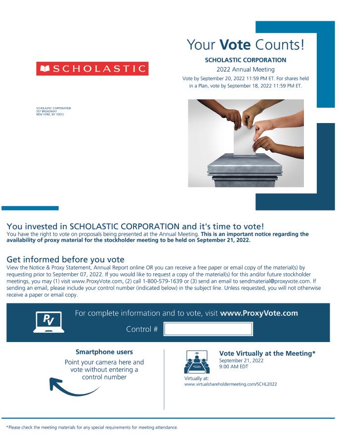 Your vote counts! Scholastic corporation 2022 annual meeting vote by september 20, 2022 11:59 pm et. For shares held in a plan, vote by september 18, 2022 11:59 pm et. Scholastic corporation 557 broadway new york, ny 10012 you invested in scholastic corporation and it's time to vote! You have the right to vote on proposals being presented at the annual meeting. This is an important notice regarding the availability of proxy material for the stockholder meeting to be held on september 21, 2022. Get informed before you vote view the notice & proxy statement, annual report online or you can receive a free paper or email copy of the material(s) by requesting prior to September 07, 2022. If you would like to request a copy of the materials) for this and/or future stockholder meetings, you may (1) visit www.proxyvote.com, (2) call 1-800-579-1639 or (3) send an email to sendmaterial@proxyvote.com. F sending an email, please include your control number (indicated below) in the subject line. Unless requested, you will not otherwise receive a paper or email copy. For complete information and to vote, visit www.proxyvote.com control # smartphone users point your camera here and vote without entering a control number vote virtually at the meeting* september 21, 2022 9:00 am edt virtually at: www.virtualshareholdermeeting.com/schl2022 please check the meeting materials for any special requirements for meeting attendance.